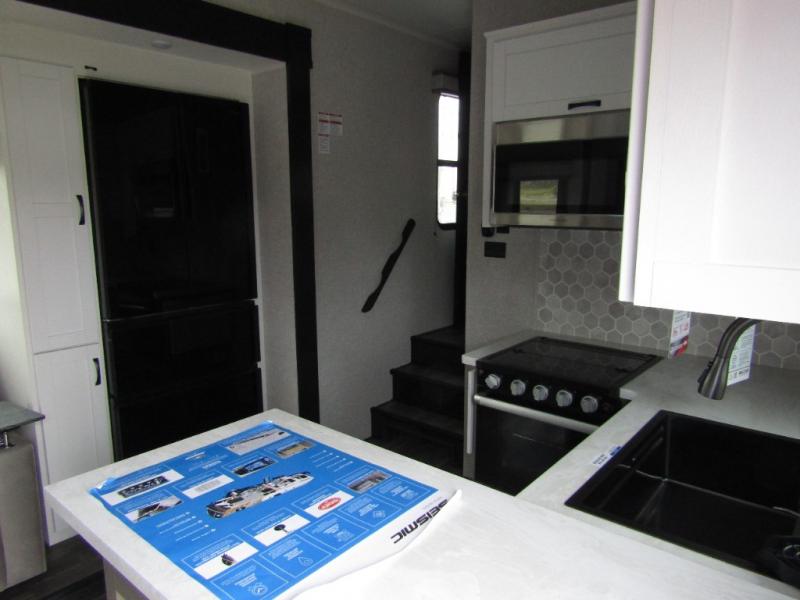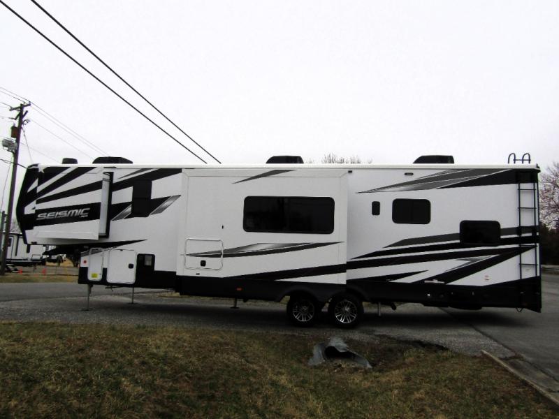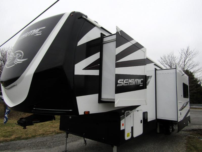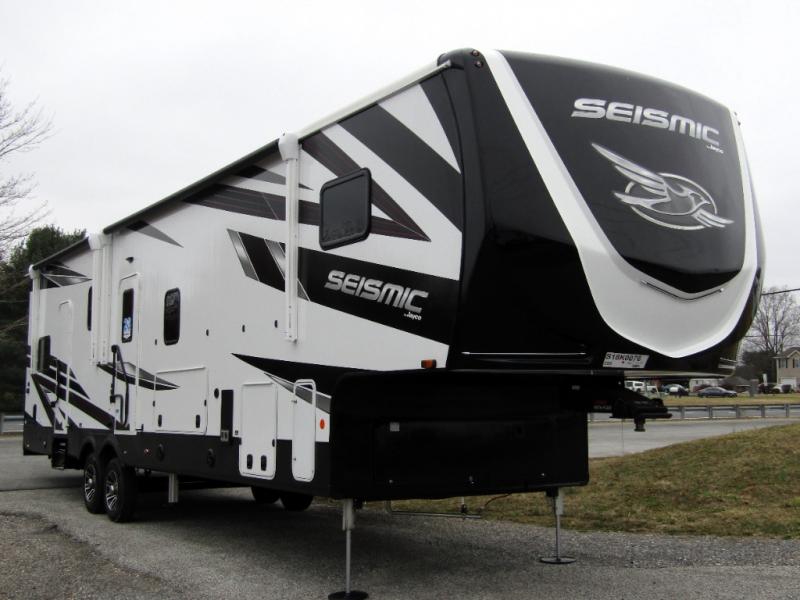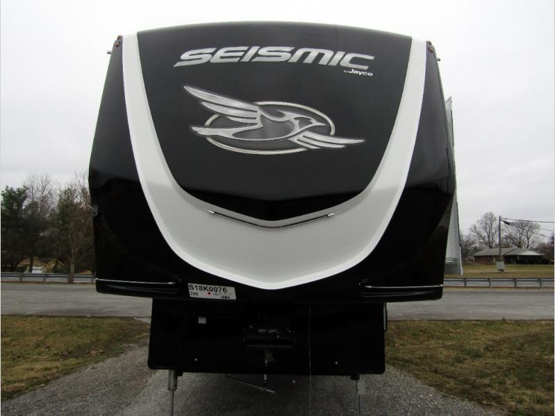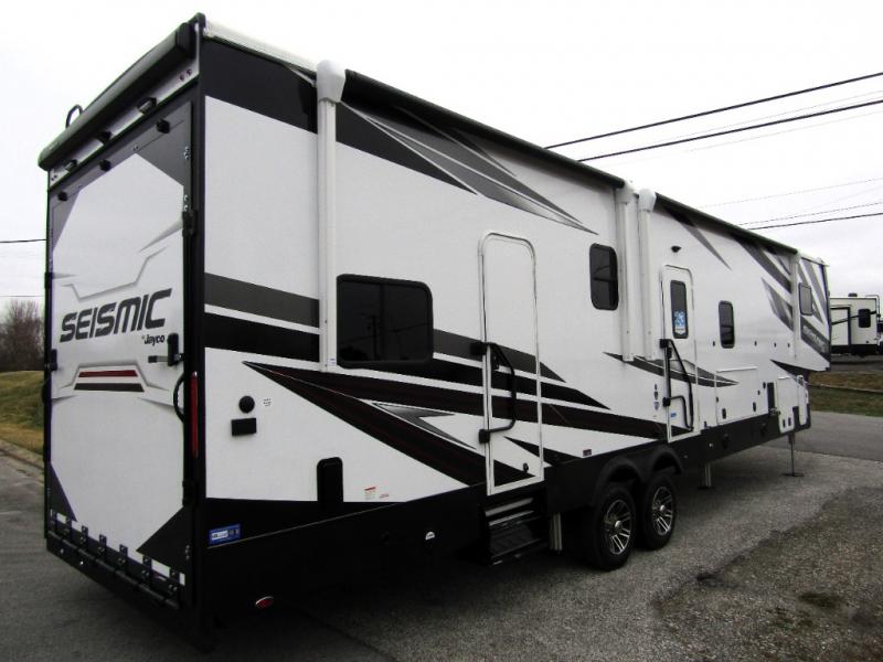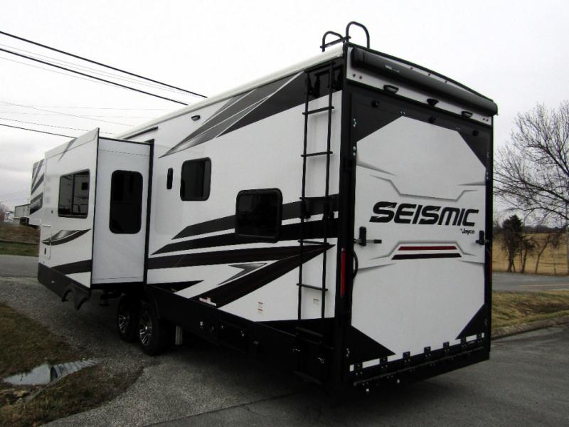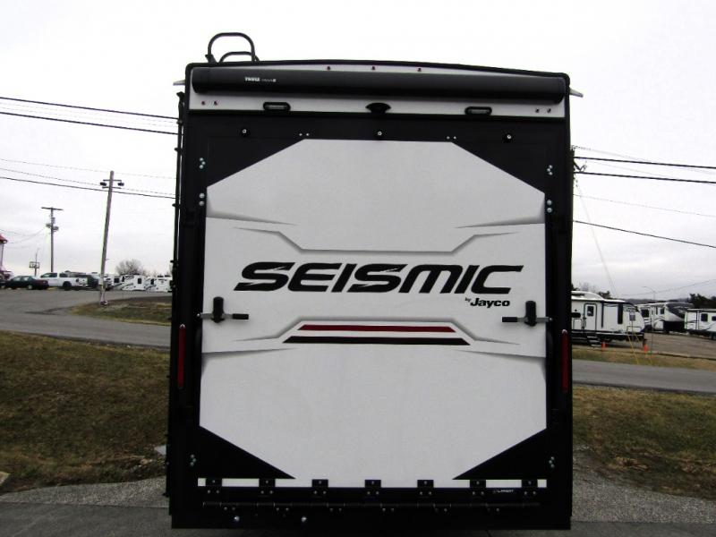 One look at the Seismic toy haulers by Jayco, and you'll never go back! Each model features a custom automotive-grade vinyl exterior graphics package, a painted fiberglass front cap with built-in LED lighting, and 102" wide-body structural steel I-beam construction. You'll find the pass-through storage with Slam-Latch baggage doors will make unpacking easier than ever, and the rear ramp door/patio with anti-slip, non-skid flooring will allow you to unload your toys with no trouble at all. These toy haulers feature a three seasons garage wall/doors, a 30 gallon fuel tank with a timer, and exterior marine-grade speakers to keep the party going. The Climate Shield zero degree tested weather protection includes a 35,000 BTU furnace, PEX plumbing, and a fully enclosed and heated underbelly so you can enjoy your adventures year around. And we haven't even touched on the interior luxuries you'll find, like solid hardwood cabinet doors, residential vinyl flooring made in the USA, night shades, and more!