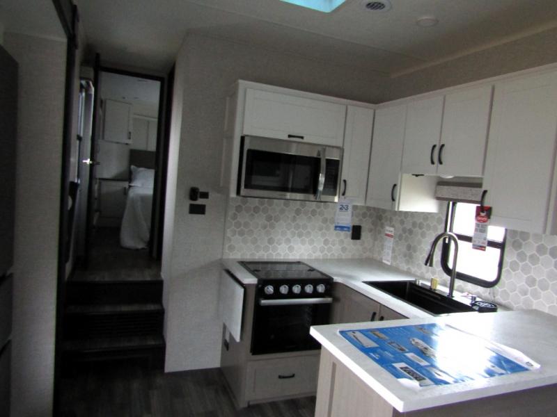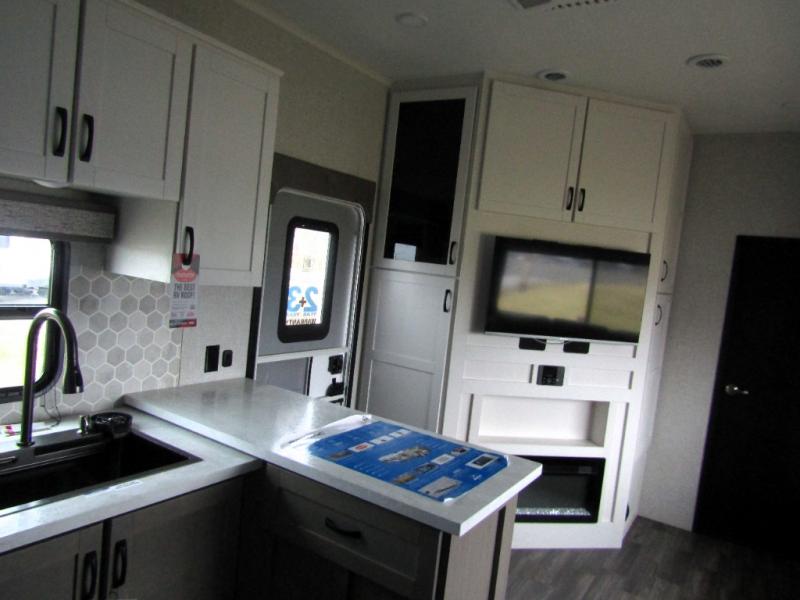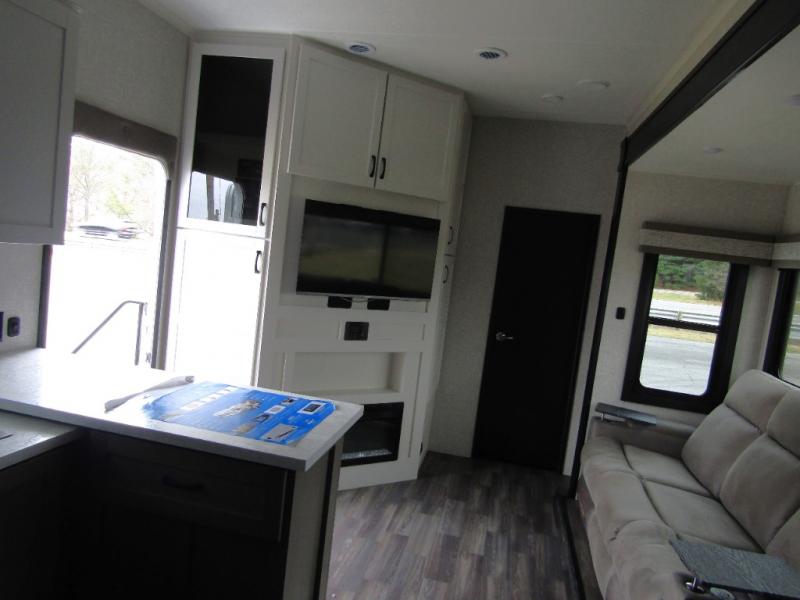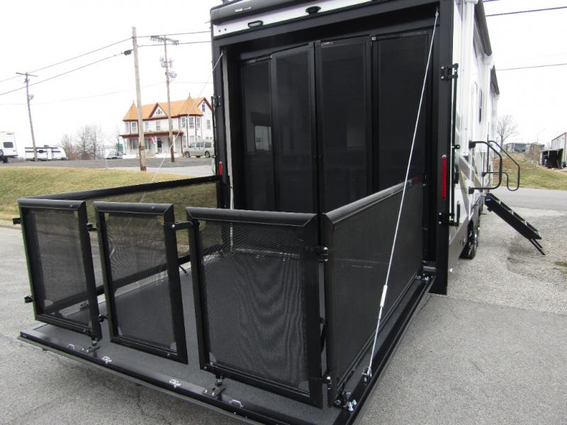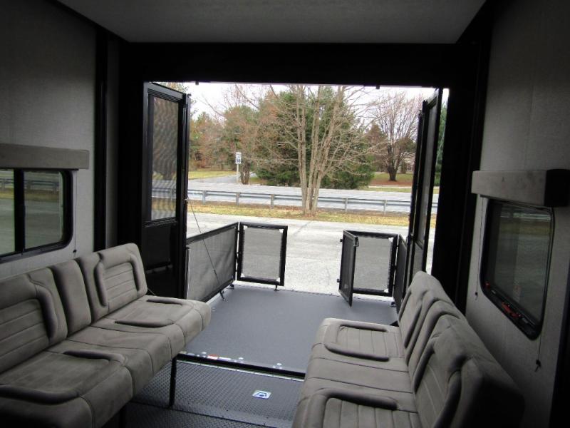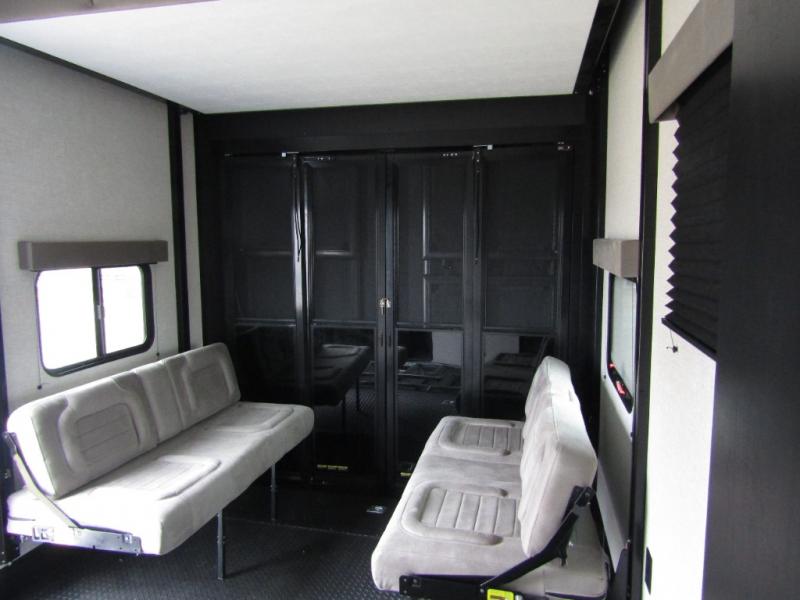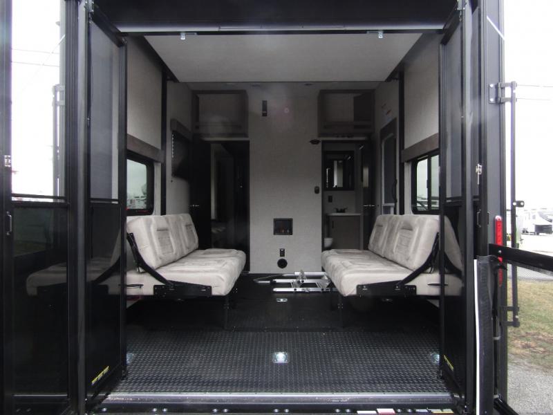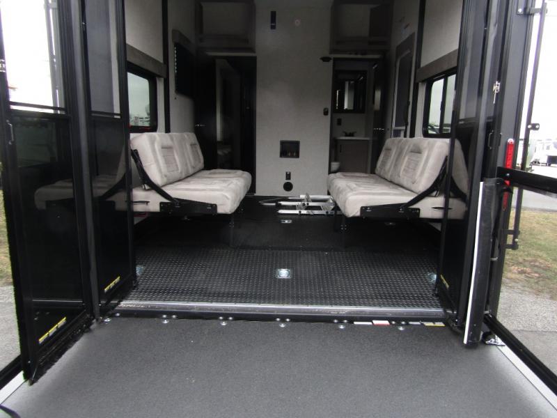 Get ready for outdoor adventures in this spacious toy hauler. Your guests will have the 11' separate garage area with its own half bath, a queen bed with rear convertible sofas, plus an overhead storage area for their things. The main living area includes a large slide out for added space, and here you can relax on the sofa that sits across from the entertainment center and fireplace. The chef will love the U-shaped kitchen counter, 17 cu. ft. 12V refrigerator, and residential oven with a three burner cooktop. You will feel right at home in the front private bedroom with its slide out wardrobe and king bed for all-around comfort.