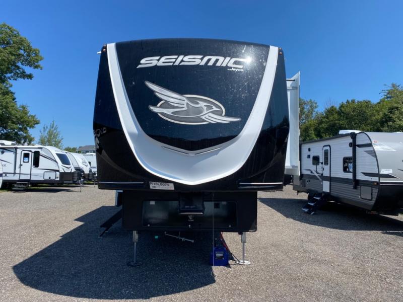 One look at the Seismic toy haulers by Jayco, and you'll never go back! Each model features a custom automotive-grade vinyl exterior graphics package, a painted fiberglass front cap with built-in LED lighting, and 102" wide-body structural steel I-beam construction. You'll find the pass-through storage with Slam-Latch baggage doors will make unpacking easier than ever, and the rear ramp door/patio with anti-slip, non-skid flooring will allow you to unload your toys with no trouble at all. These toy haulers feature a three seasons garage wall/doors, a 30 gallon fuel tank with a timer, and exterior marine-grade speakers to keep the party going. The Climate Shield zero degree tested weather protection includes a 35,000 BTU furnace, PEX plumbing, and a fully enclosed and heated underbelly so you can enjoy your adventures year around. And we haven't even touched on the interior luxuries you'll find, like solid hardwood cabinet doors, drawers, and trim, and a residential king mattress with under-bed storage!