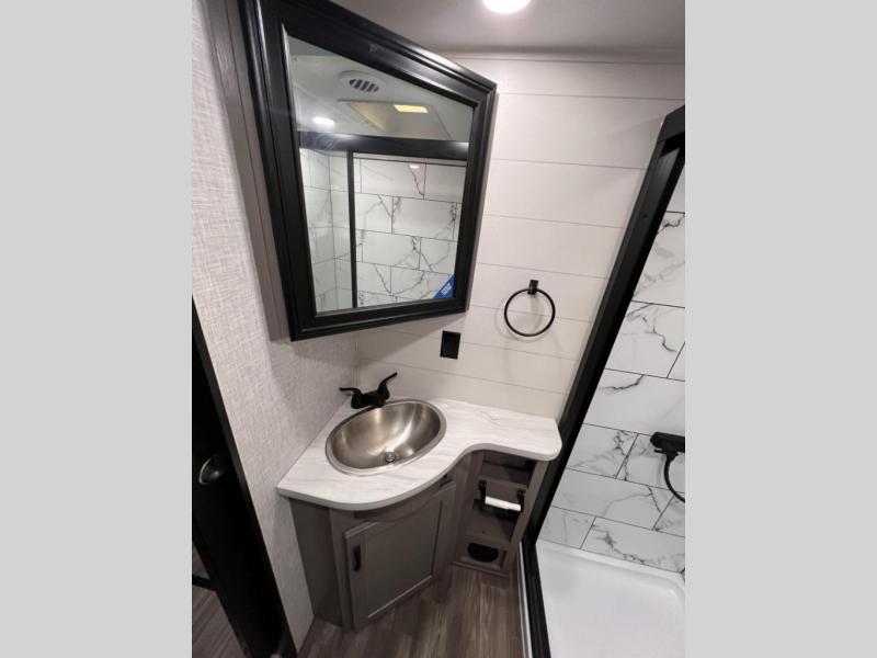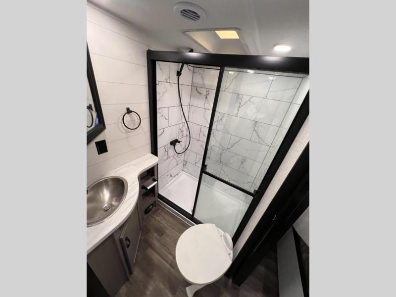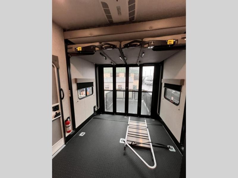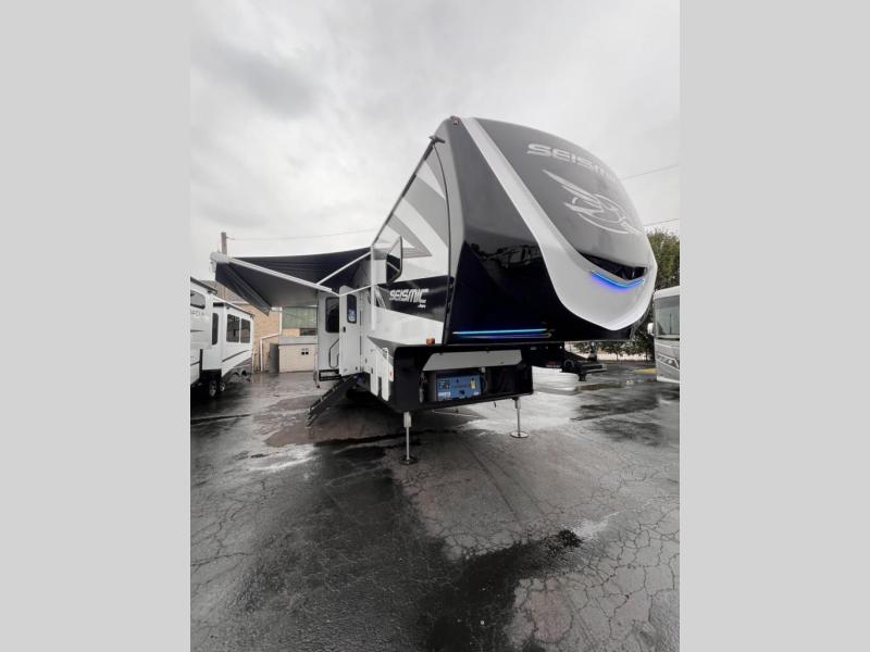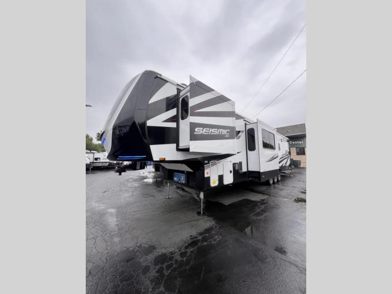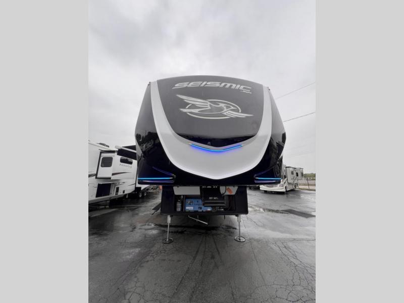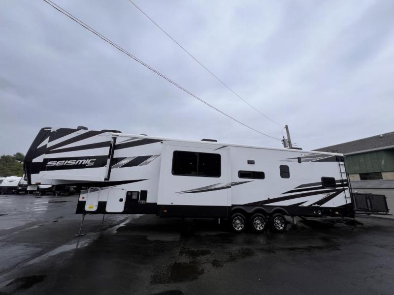 One look at the Seismic toy haulers by Jayco, and you'll never go back! Each model features a custom automotive-grade vinyl exterior graphics package, a painted fiberglass front cap with built-in LED lighting, and 102" wide-body structural steel I-beam construction. You'll find the pass-through storage with Slam-Latch baggage doors will make unpacking easier than ever, and the rear ramp door/patio with anti-slip, non-skid flooring will allow you to unload your toys with no trouble at all. These toy haulers feature a three seasons garage wall/doors, a 30 gallon fuel tank with a timer, and exterior marine-grade speakers to keep the party going. The Climate Shield zero degree tested weather protection includes a 35,000 BTU furnace, PEX plumbing, and a fully enclosed and heated underbelly so you can enjoy your adventures year around. And we haven't even touched on the interior luxuries you'll find, like solid hardwood cabinet doors, residential vinyl flooring made in the USA, night shades, and more!