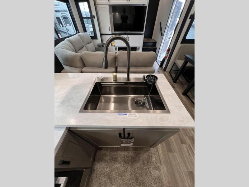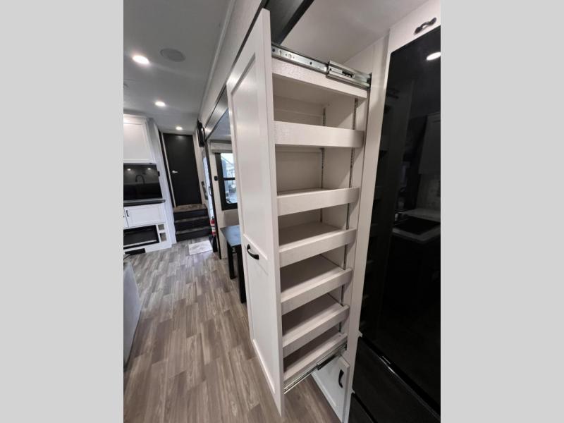 Get ready for outdoor adventures in this spacious toy hauler. Your guests will have the 13' 6" garage with queen bed with convertible sofa and a loft for added sleeping space, plus there is overhead storage for your things and a side man door to come and go easily. The main living area includes dual opposing slides with an L-shaped tri-fold sofa along the roadside and your dinette and refrigerator plus pantry in the curbside slide. Head up the steps to your front private bedroom with the dual entry bath accessible from the hall and inside the master bedroom. Here you will all enjoy a walk-in shower, toilet, and vanity with a sink, plus overhead storage. The bedroom features a third slide out housing a queen bed for added floor space, plus a full front walk-in closet, a dresser, and washer/dryer prep!