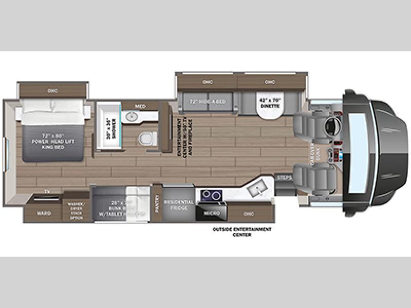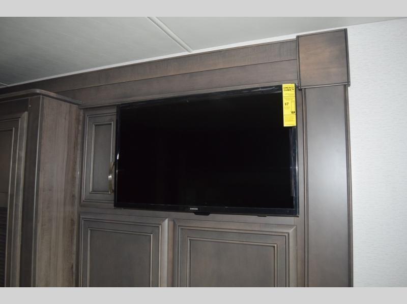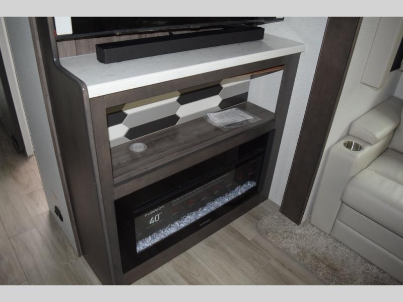 This Seneca Prestige Super C diesel motorhome is stunning, and it has sleeping space scattered all throughout! There is a private bedroom with a 72" x 80" king bed slide that can be used by the owners of this coach, and if there are any children, they will appreciate the set of bunk beds with TVs at each bunk. Out in the main living area, you'll find a hide-a-bed sofa and booth dinette which can both be used as lounging or sleeping spaces, and the last sleeping location is included above the cab with the overhead bunk. The living area is comfortable and residential with its fireplace and 50" LED TV, and you'll have an additional entertainment center on the exterior which comes with an exterior LED TV mounted on a swivel bracket, outside speakers, and an AM/FM radio.