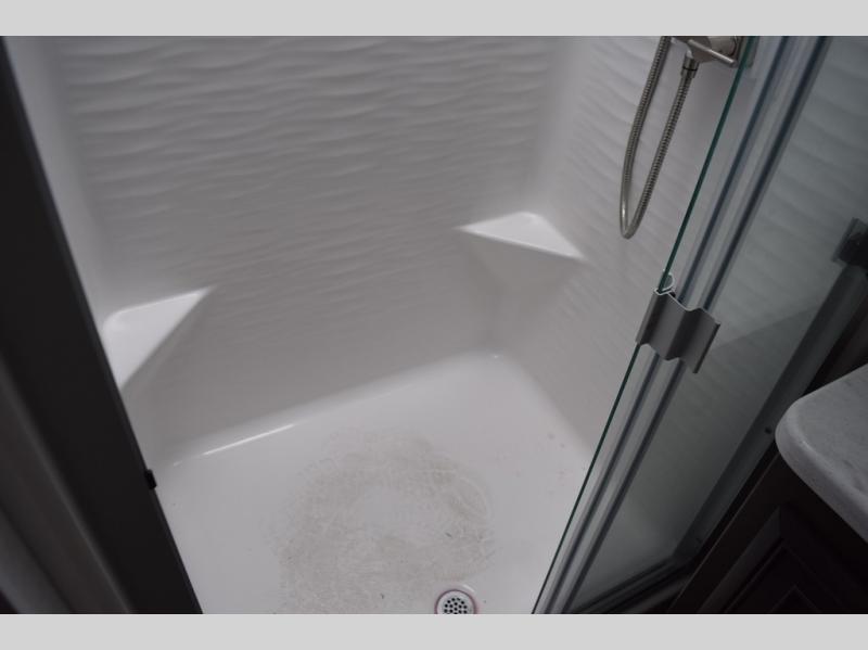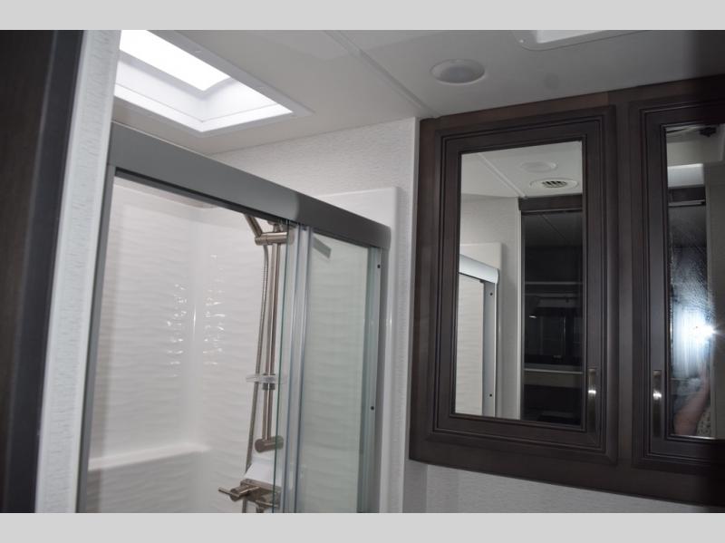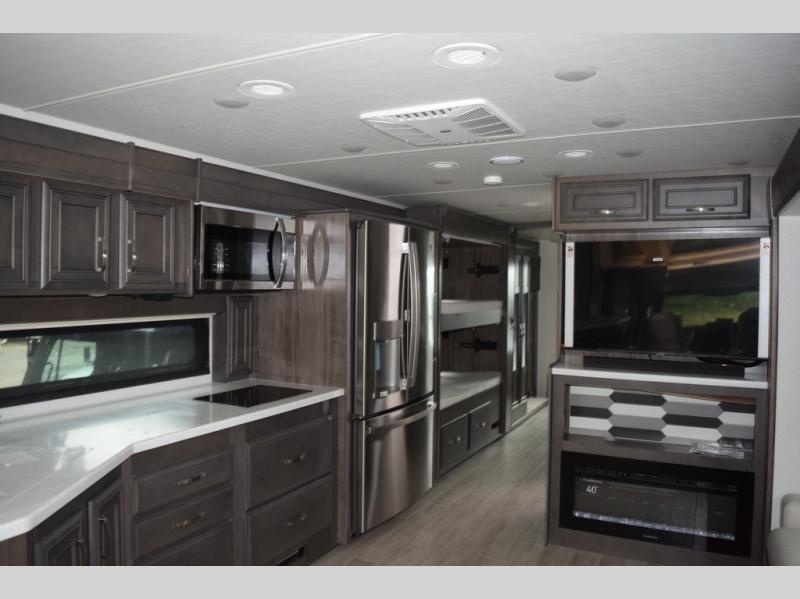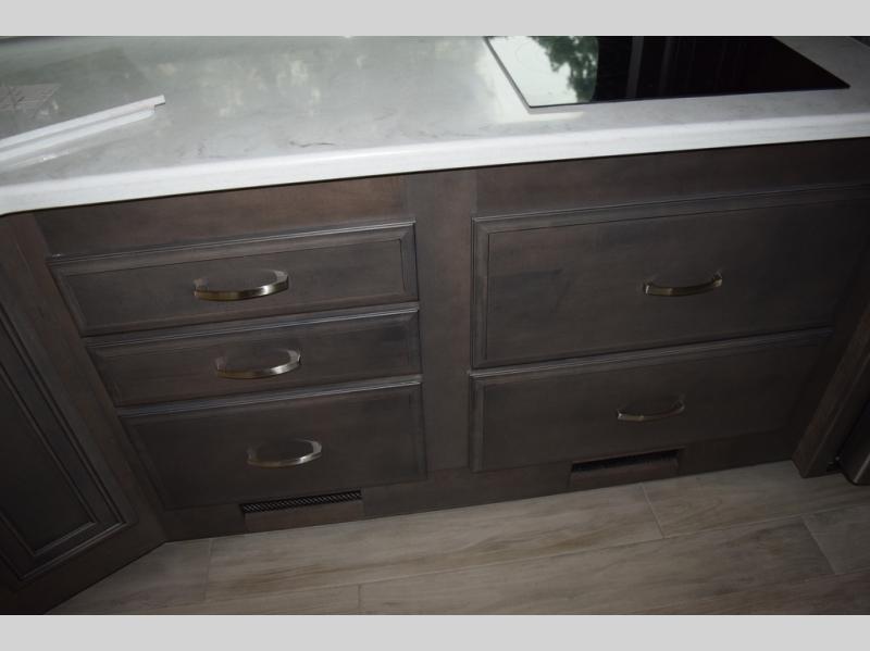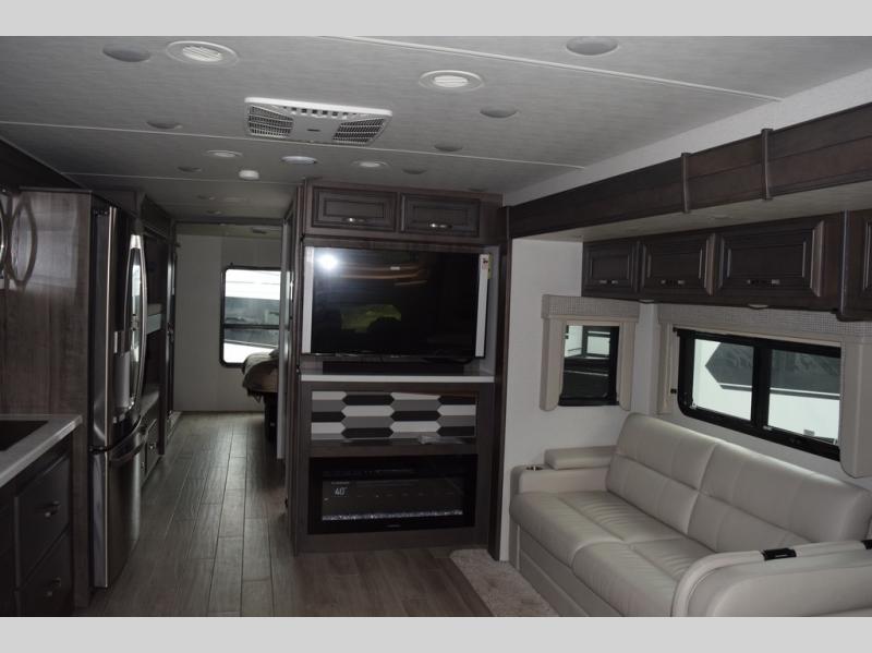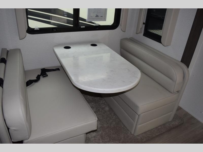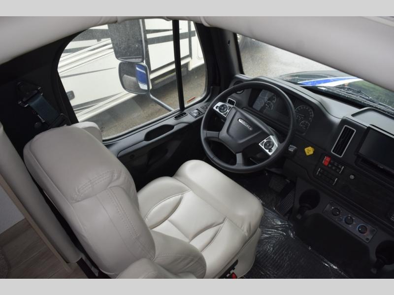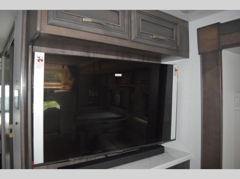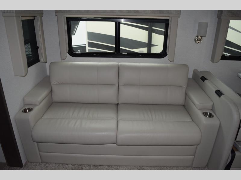 You will be quite impressed with the Jayco Seneca Prestige Super C diesel motorhome! The construction consists of a Stronghold VBL roof, floor, and sidewalls, and the premium Sikkens full-body paint is going to draw attention as you cruise down the highway. The entrance door has the industry's largest travel-view window, and you have four 6V AGM (220Ah) house batteries on a slide out tray for convenience. The JAYCOMMAND control system powered by Firefly will give you access to your coach's functions from the smartphone in your hand, and the matte-finish woodgrain polished porcelain tile flooring has a heated floor mat for extra comfort. The luxury continues on with the addition of the solid-surface countertops and water filtration system, and the 9" Sony® infotainment center with Apple CarPlay® and Android Auto™ as well as the backup and sideview cameras are an excellent contribution to the front cab area.