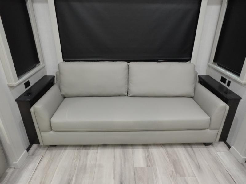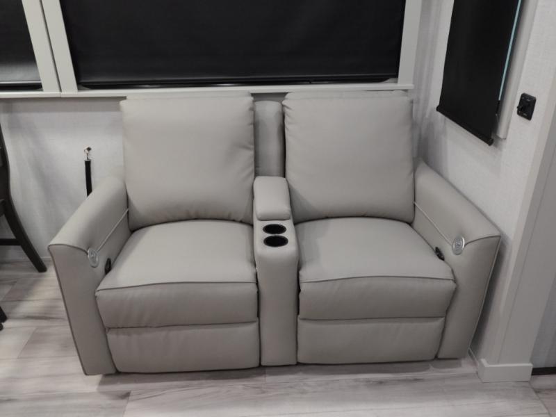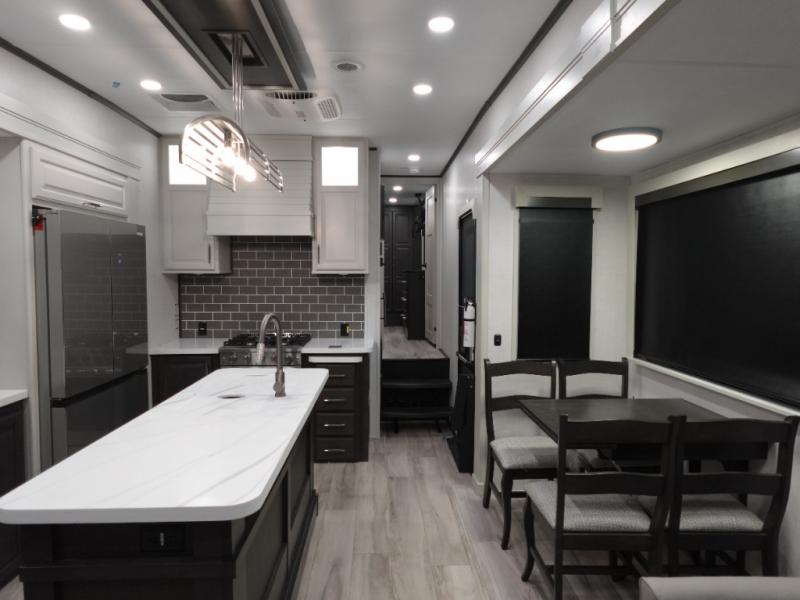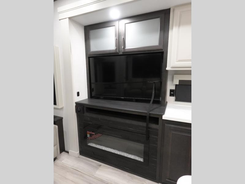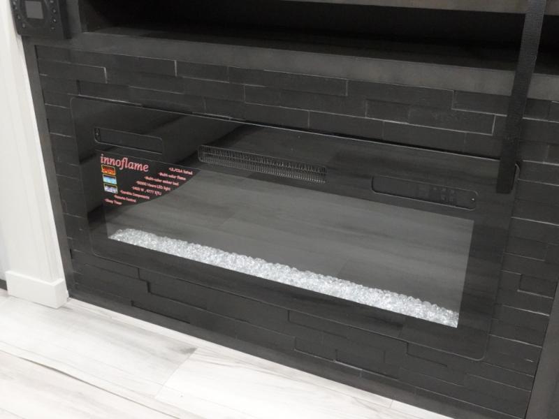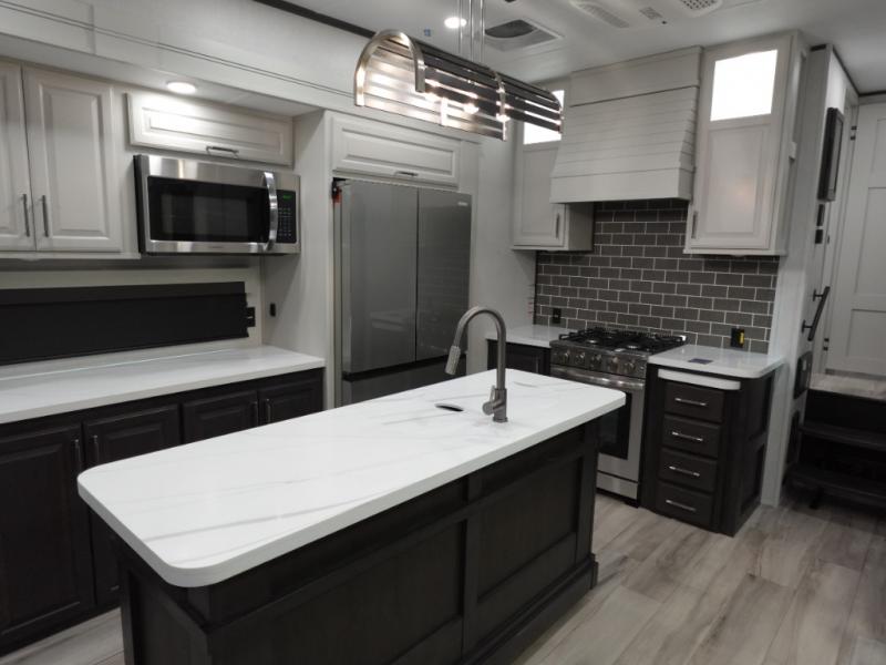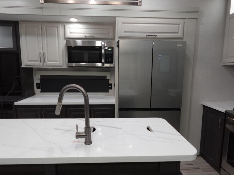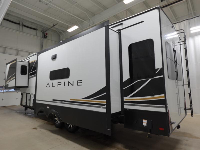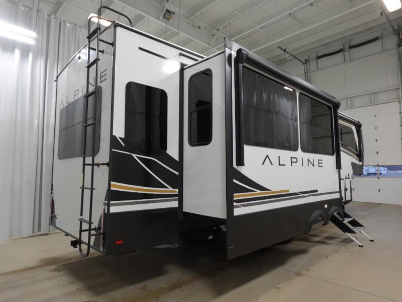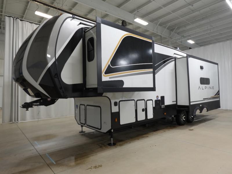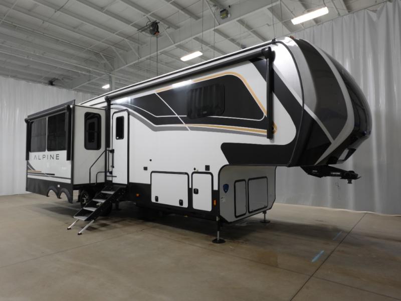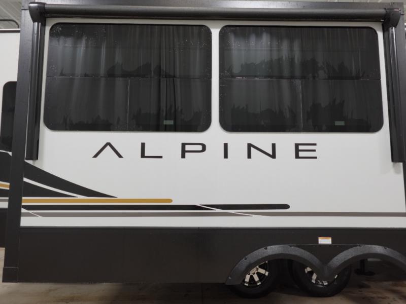 A great coach for an adventurous couple that loves to travel. This Alpine fifth wheel features wide open spaces thanks to triple slides with dual opposing slides in the main combined living and kitchen area. A center island with a sink is great for prep work, and you can easily entertain and have overnight guests with a hide-a-bed sofa sleeper. There is an entertainment center with a fireplace to enjoy when inside, and theater seating opposite for movie night. The chef will appreciate the full kitchen with an 18 cu. ft. residential refrigerator, a range hood, plus a convection microwave and a pull-out countertop to prep meals. Head up to the master suite which features a dual entry bath including a linen cabinet and large shower, plus a king bed that slides out and includes storage space underneath for extra blankets. There is also a master closet, a dresser with a Smart HDTV, and stackable washer and dryer prep if you plan to go full-time!