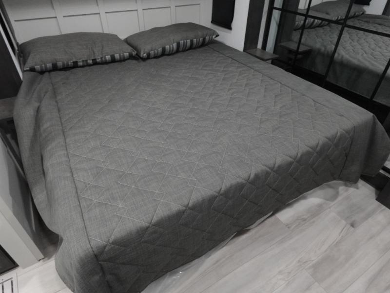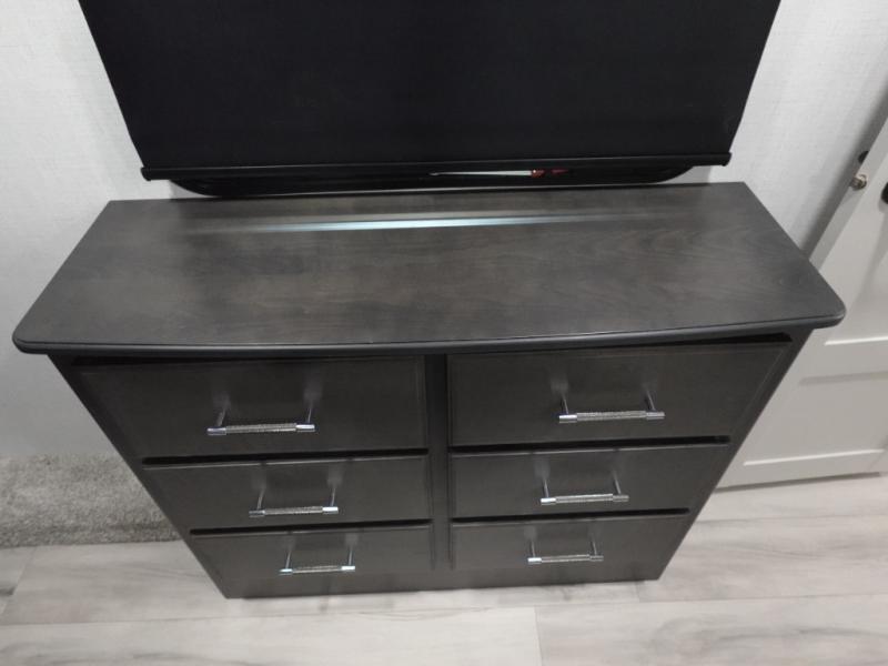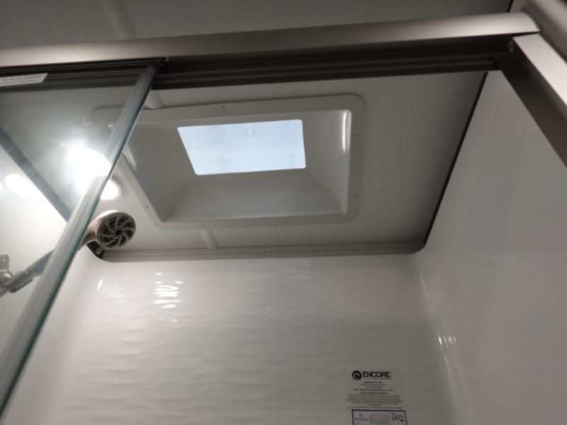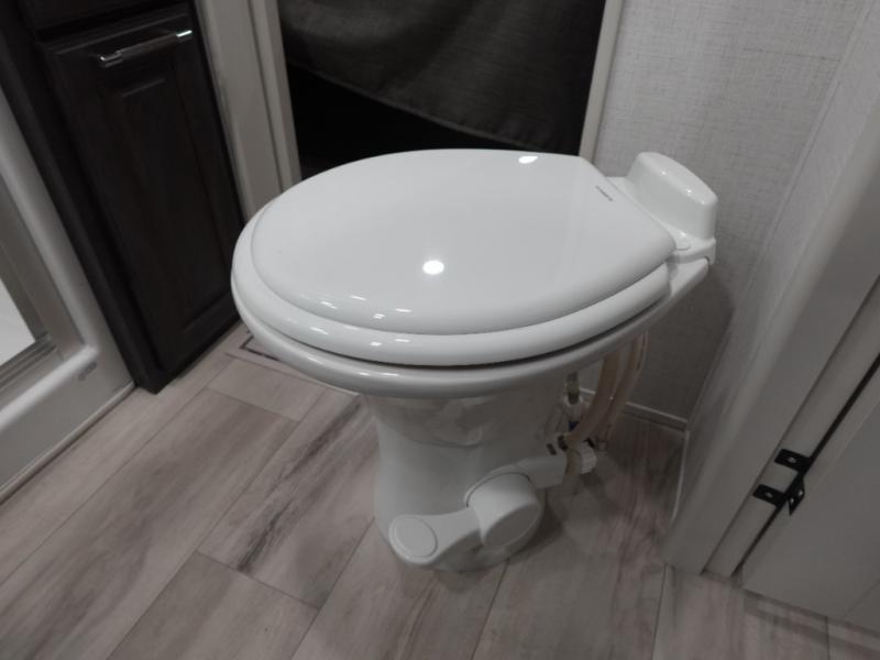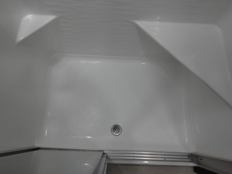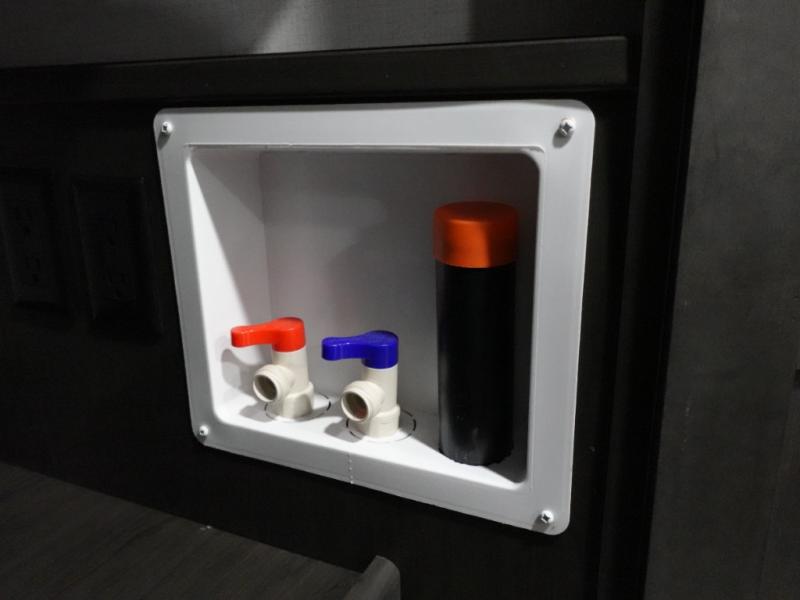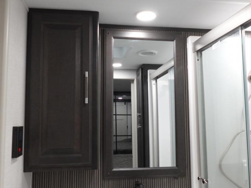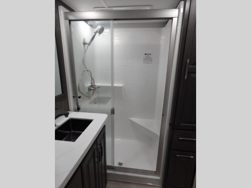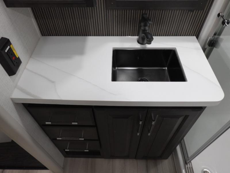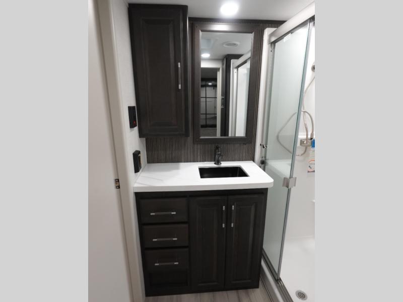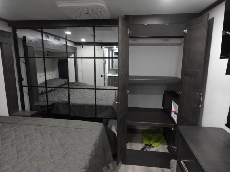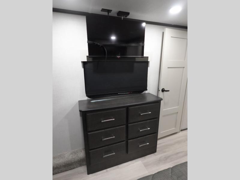 A great coach for an adventurous couple that loves to travel. This Alpine fifth wheel features wide open spaces thanks to triple slides with dual opposing slides in the main combined living and kitchen area. A center island with a sink is great for prep work, and you can easily entertain and have overnight guests with a hide-a-bed sofa sleeper. There is an entertainment center with a fireplace to enjoy when inside, and theater seating opposite for movie night. The chef will appreciate the full kitchen with an 18 cu. ft. residential refrigerator, a range hood, plus a convection microwave and a pull-out countertop to prep meals. Head up to the master suite which features a dual entry bath including a linen cabinet and large shower, plus a king bed that slides out and includes storage space underneath for extra blankets. There is also a master closet, a dresser with a Smart HDTV, and stackable washer and dryer prep if you plan to go full-time!