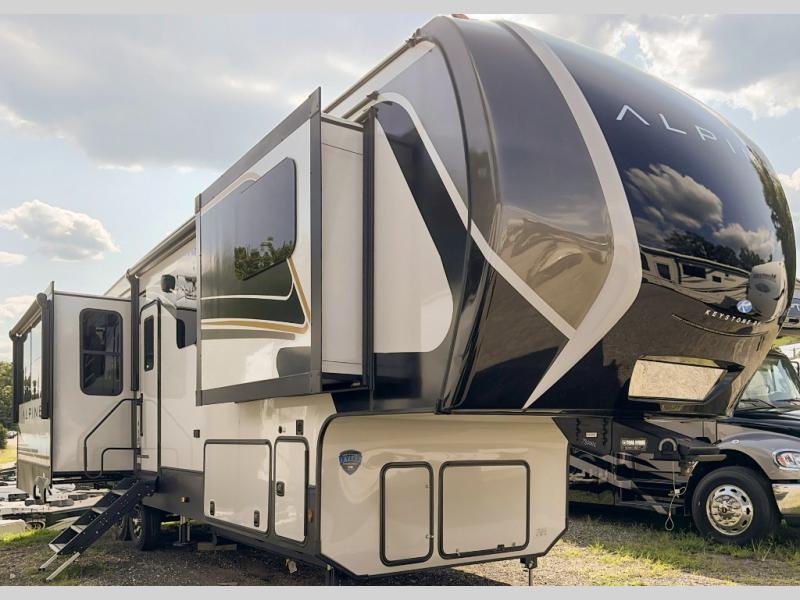 Luxury is not an option, it is a standard with each one of these Keystone RV Alpine fifth wheels! A 8' 4" wide body construction will create an open, residential feeling, and cutting-edge technology will provide a hassle-free camping experience. The Tru-Fit slide construction is more durable and minimizes motor structural stress, as well as resists leaking, and the Blade Pure airflow system provides residential comfort with its high-performance. Each fifth wheel includes designer flooring throughout, stunning solid wood cabinet doors, luxurious crown molding, and solid surface countertops in the kitchen. The exterior also includes an outside shower with hot and cold water, Lippert strut assisted SolidSteps, Hitch Vision with LED lighting, and many more conveniences!