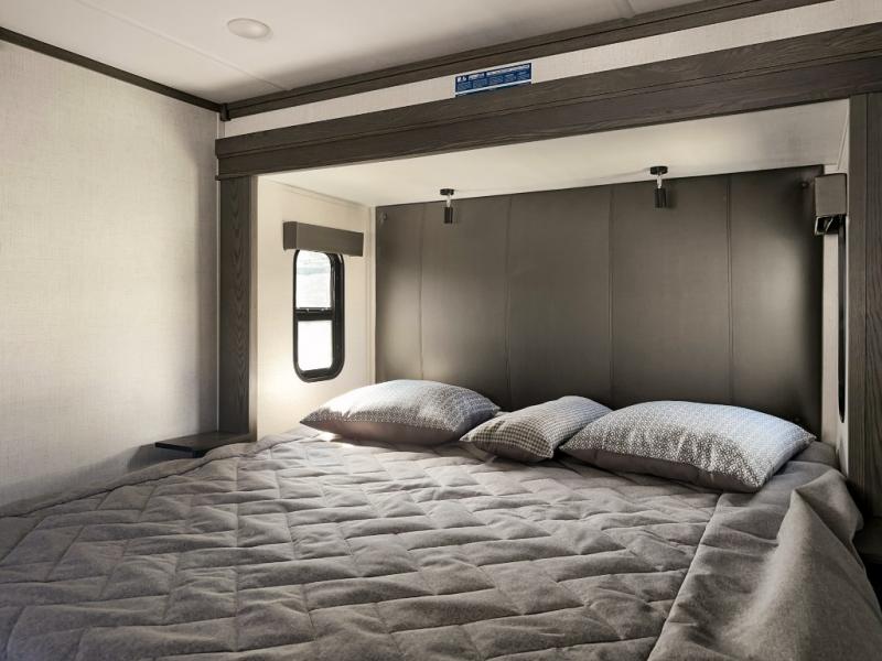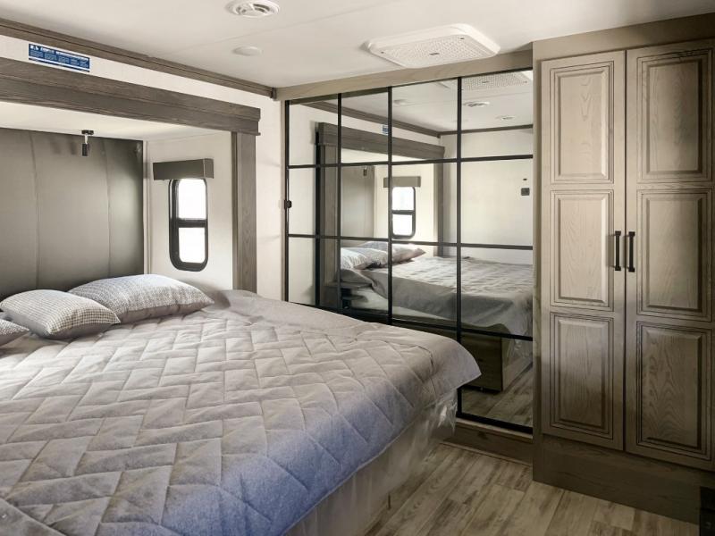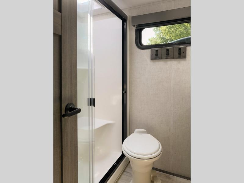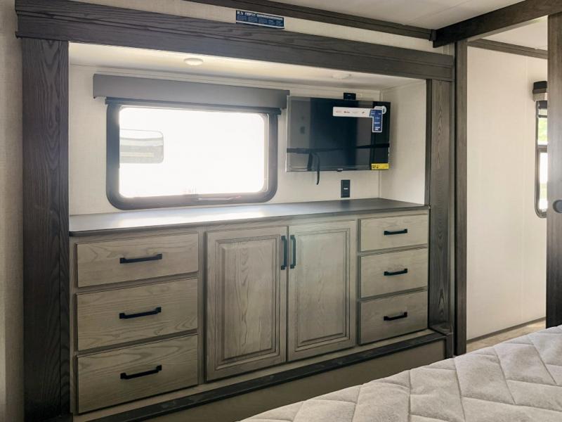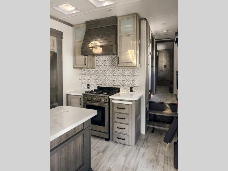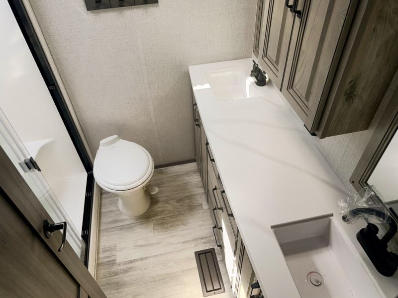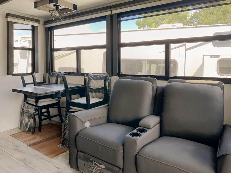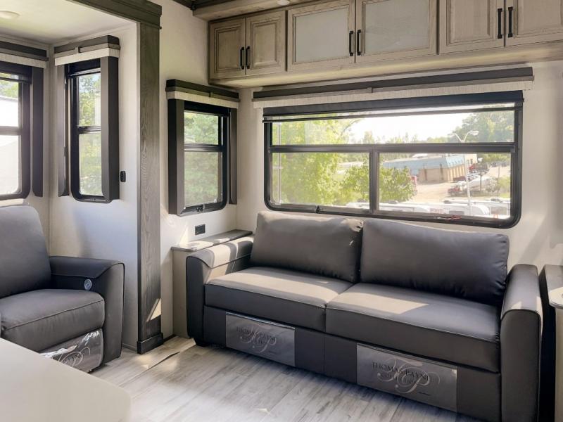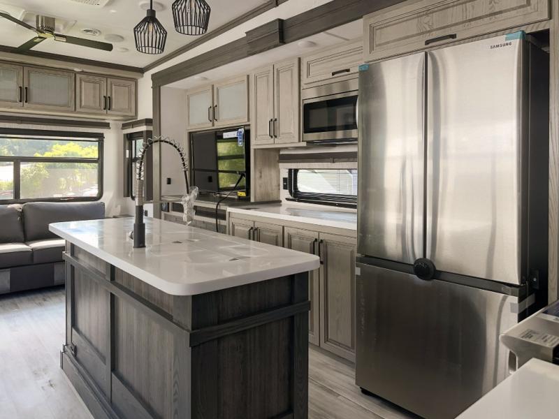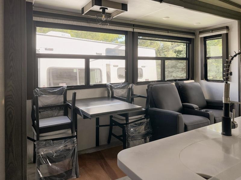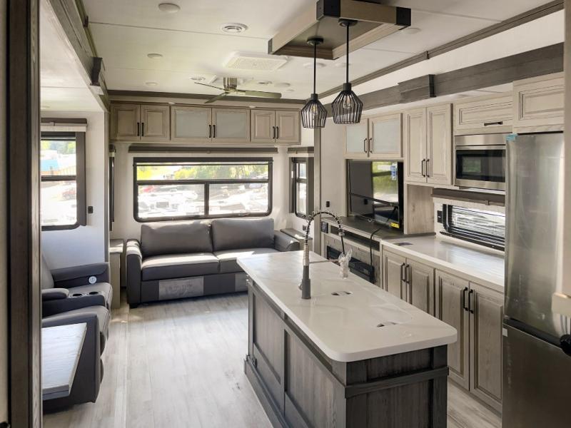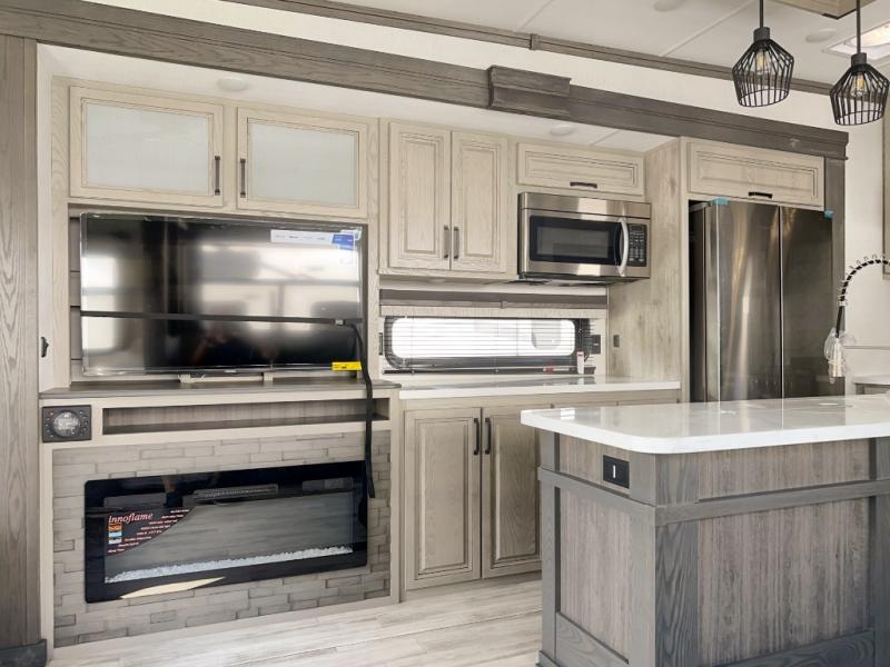 You will feel right at home camping in this fifth wheel! The chef will have lots of countertop space to prepare their best meals along with a kitchen island, two pull-out pantries to store your dishes, and an 18 cu. ft. residential refrigerator to store any leftovers. The free standing dinette offers a comfortable place to enjoy your meals, and the theater seating across from the fireplace and entertainment center will be perfect for movie nights. There is also a rear hide-a-bed sofa sleeper for any guests you may have. You will love the full bath that includes a shower with a seat, a linen closet, plus two bath sinks for convenience. And don't overlook the front bedroom with a stylish barn door, king bed slide out, and master closet for all your things. You'll also find stackable washer and dryer prep, two drawers, and a Smart HDTV for movies in bed.