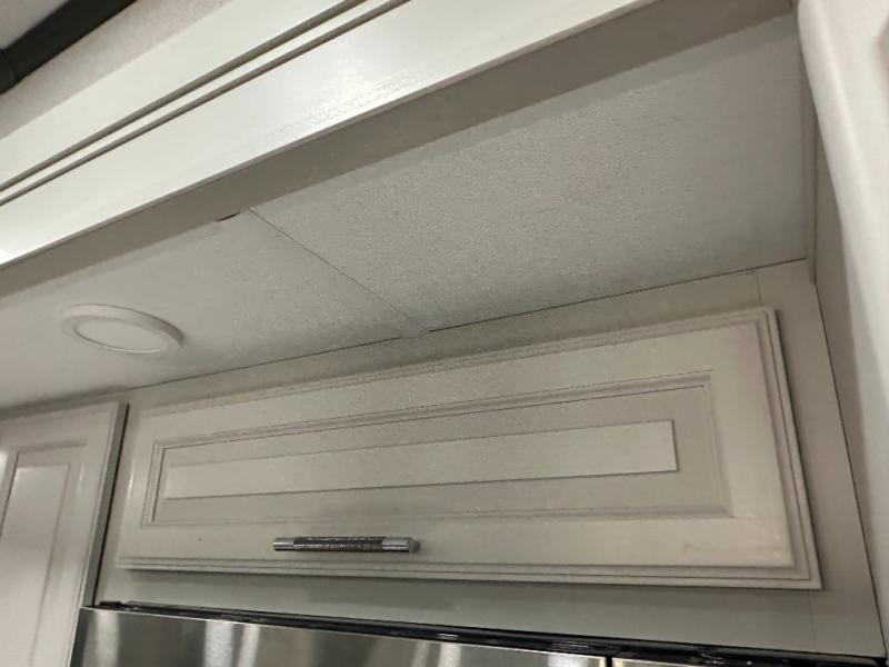 * Residential-style refrigerator (~18 cu ft) with ice maker, convection microwave, 3-burner cooktop, solid-surface counters.