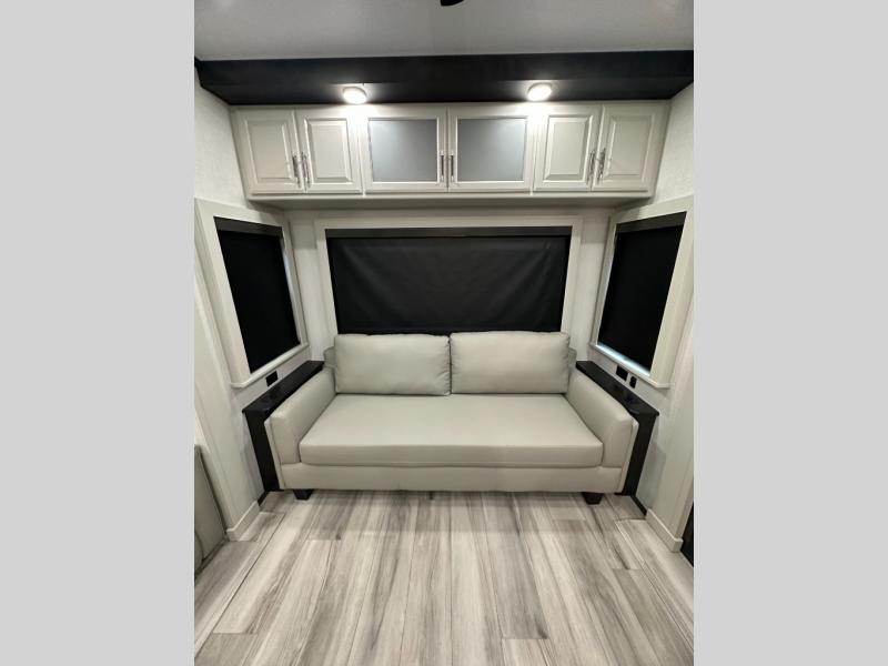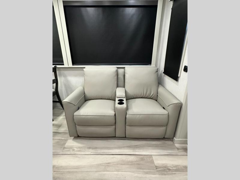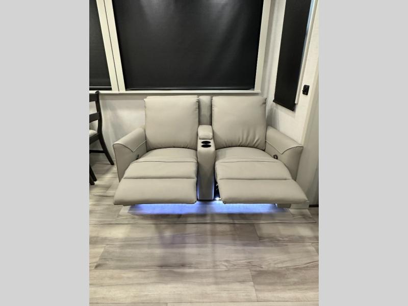* Rear living area with theater seating + sofa, fireplace + entertainment center.