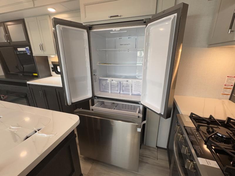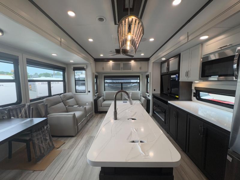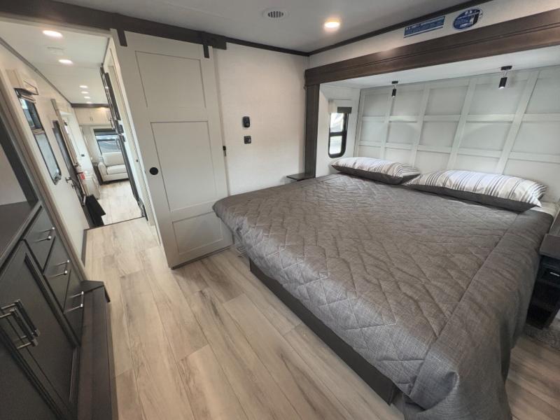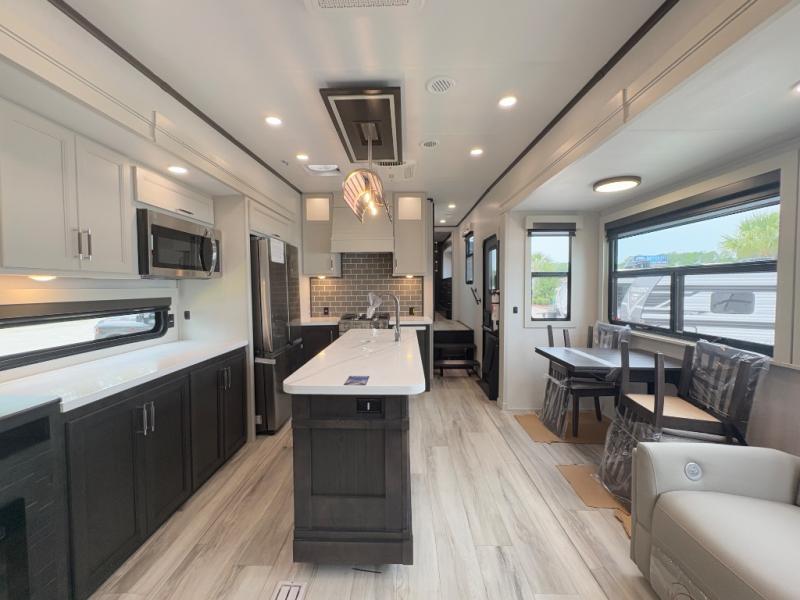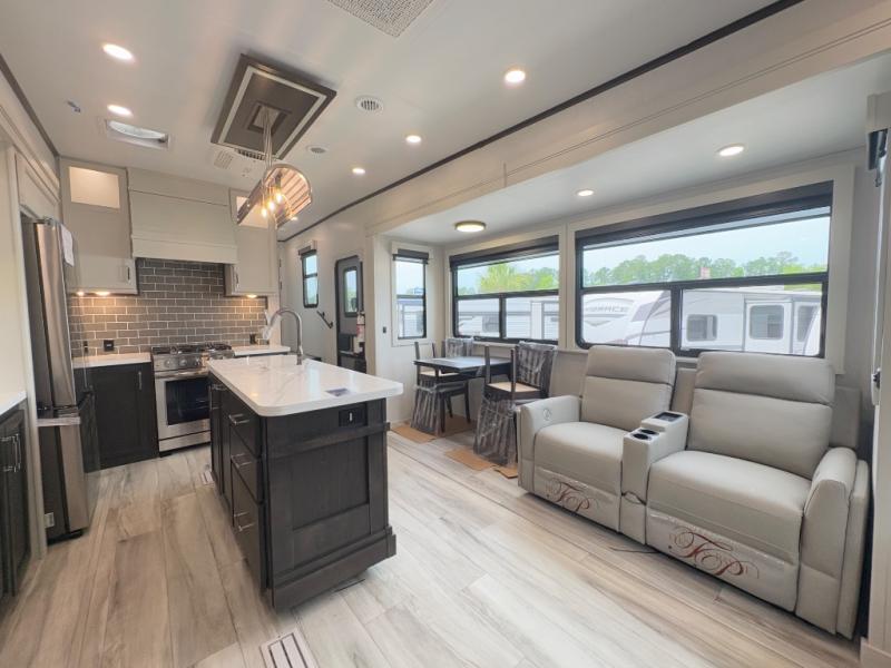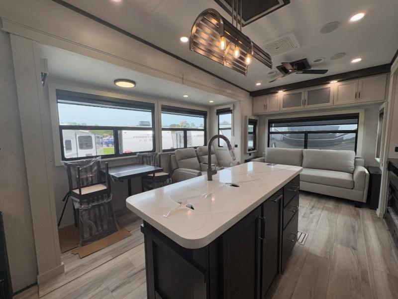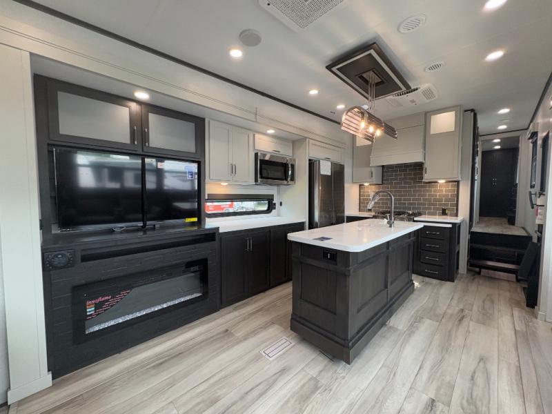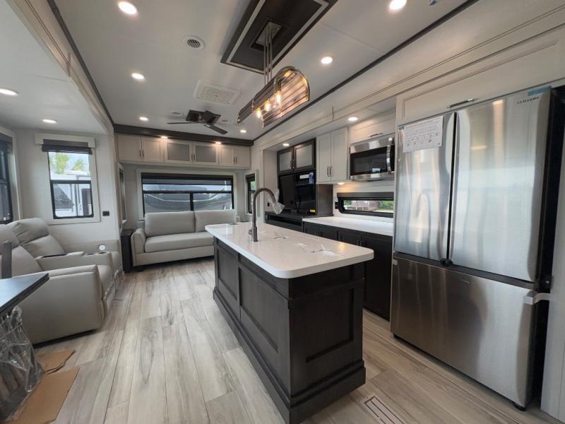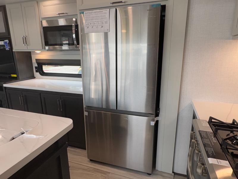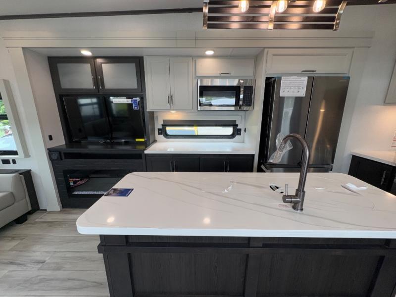 You will feel right at home camping in this fifth wheel! The chef will have lots of countertop space to prepare their best meals along with a kitchen island, two pull-out pantries to store your dishes, and an 18 cu. ft. residential refrigerator to store any leftovers. The free standing dinette offers a comfortable place to enjoy your meals, and the theater seating across from the fireplace and entertainment center will be perfect for movie nights. There is also a rear hide-a-bed sofa sleeper for any guests you may have. You will love the full bath that includes a shower with a seat, a linen closet, plus two bath sinks for convenience. And don't overlook the front bedroom with a stylish barn door, king bed slide out, and master closet for all your things. You'll also find stackable washer and dryer prep, two drawers, and a Smart HDTV for movies in bed.