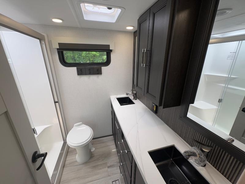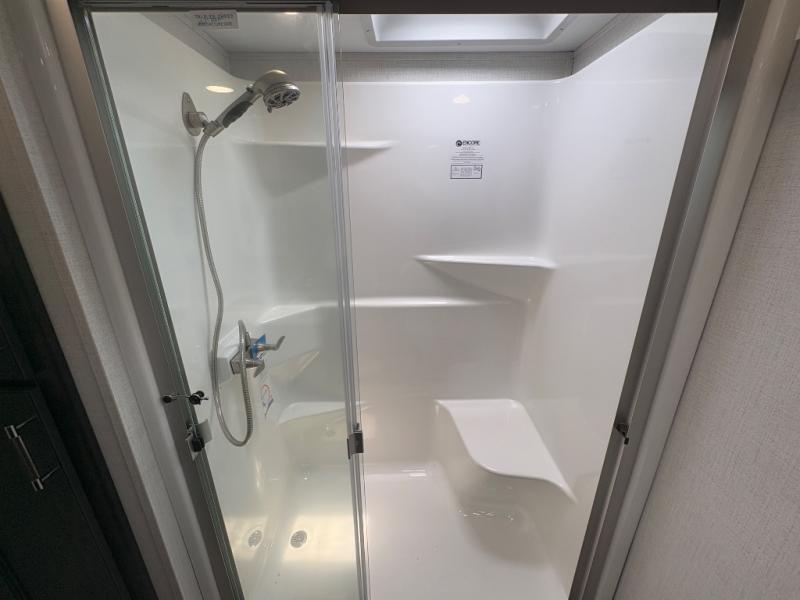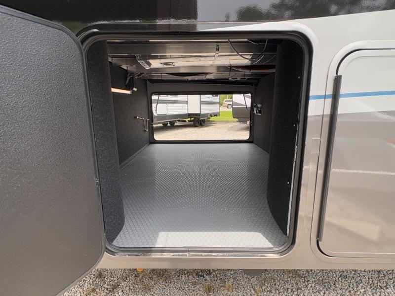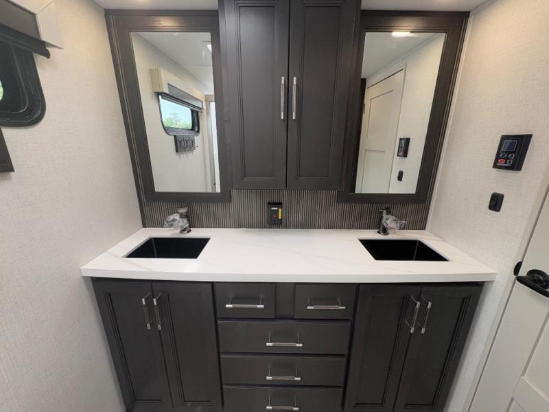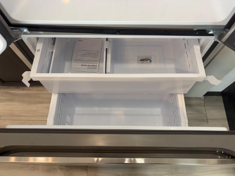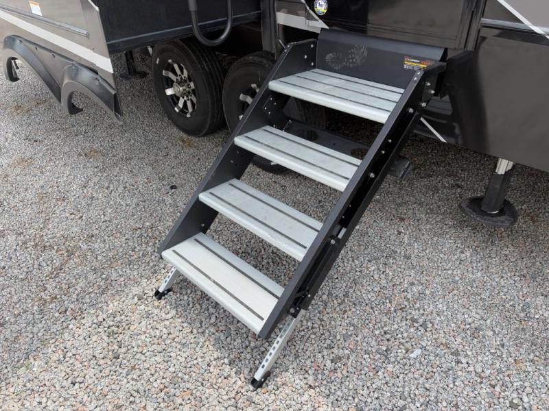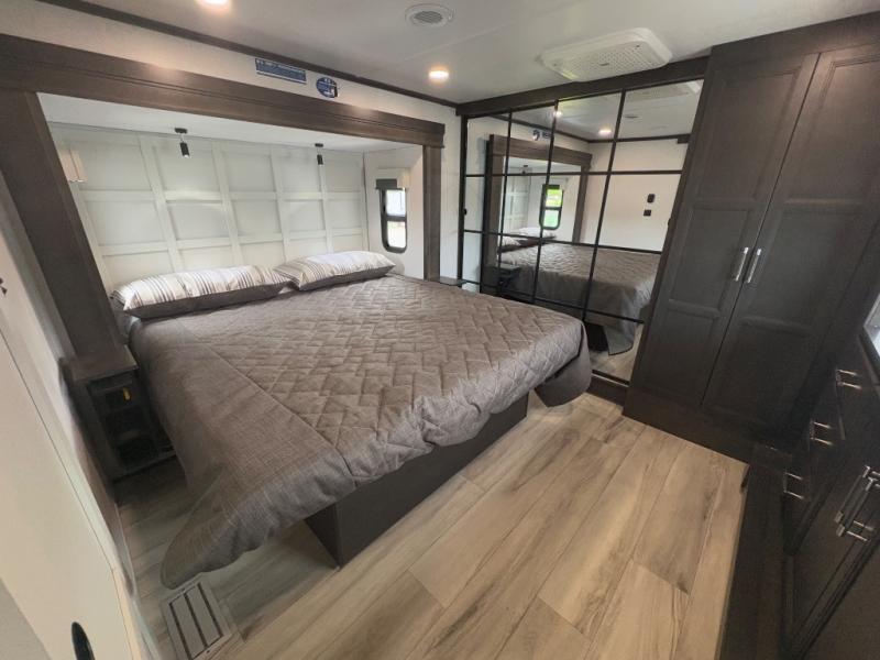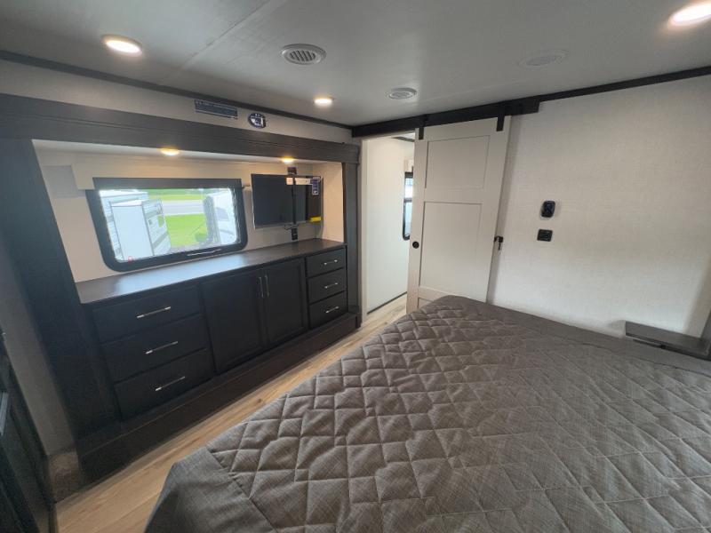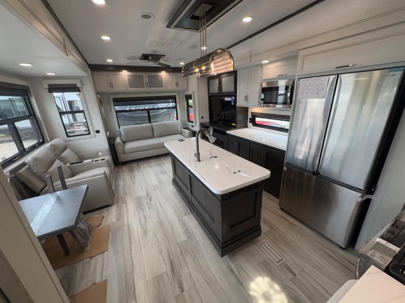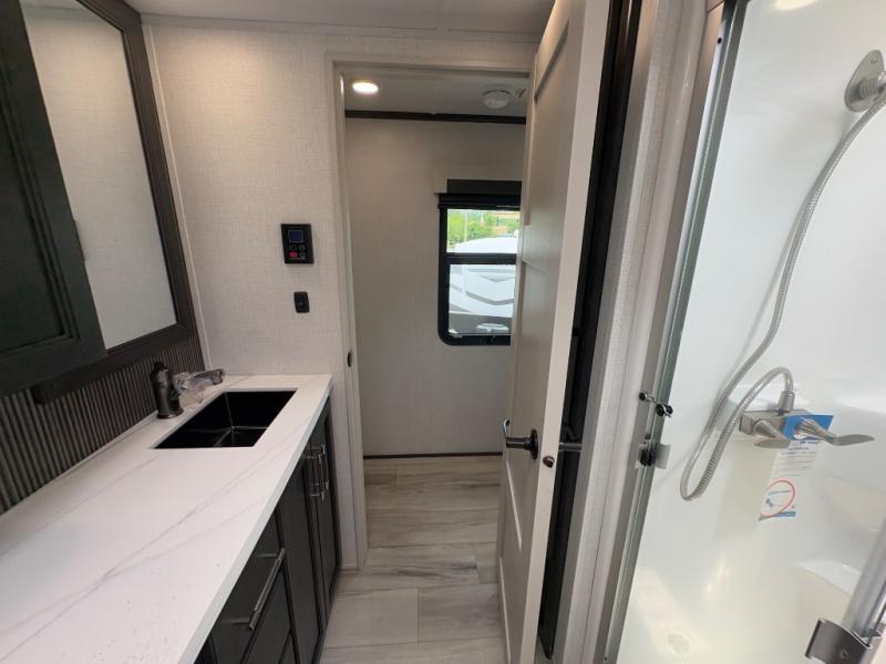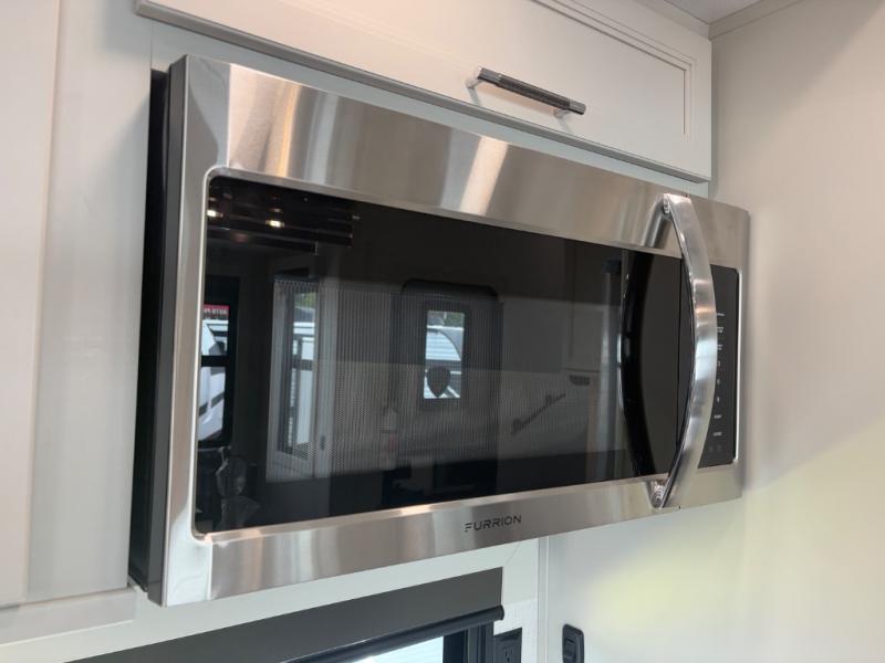 You will feel right at home camping in this fifth wheel! The chef will have lots of countertop space to prepare their best meals along with a kitchen island, two pull-out pantries to store your dishes, and an 18 cu. ft. residential refrigerator to store any leftovers. The free standing dinette offers a comfortable place to enjoy your meals, and the theater seating across from the fireplace and entertainment center will be perfect for movie nights. There is also a rear hide-a-bed sofa sleeper for any guests you may have. You will love the full bath that includes a shower with a seat, a linen closet, plus two bath sinks for convenience. And don't overlook the front bedroom with a stylish barn door, king bed slide out, and master closet for all your things. You'll also find stackable washer and dryer prep, two drawers, and a Smart HDTV for movies in bed.