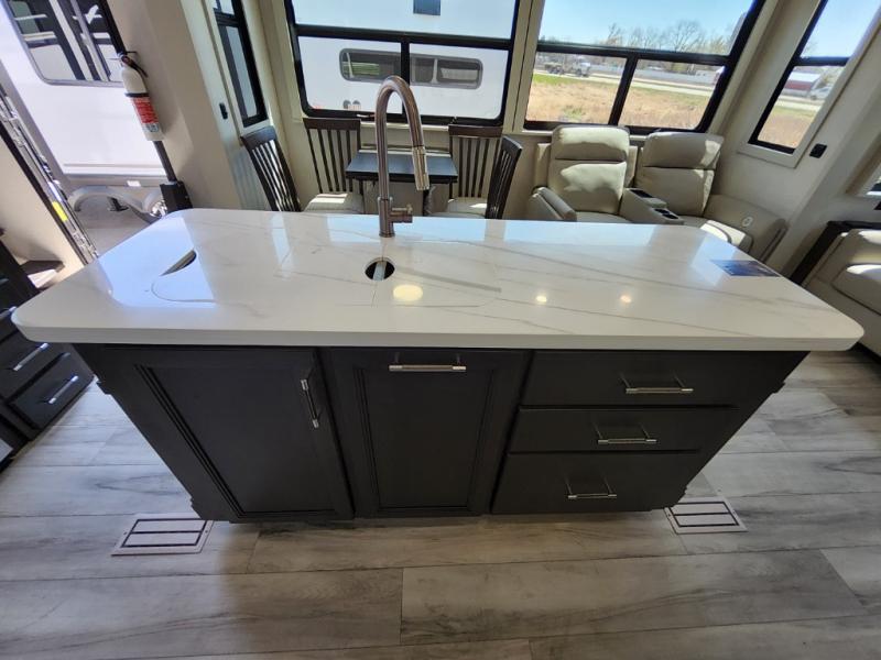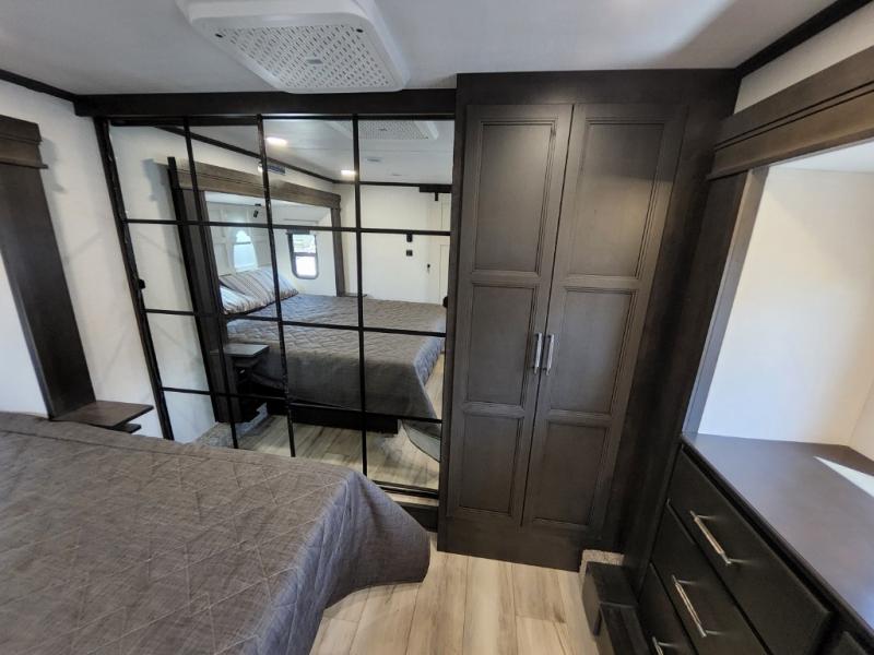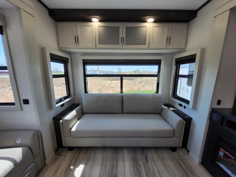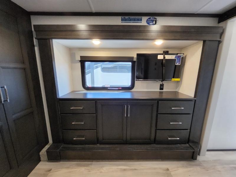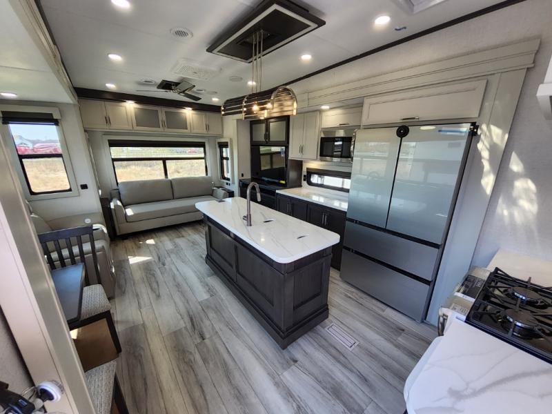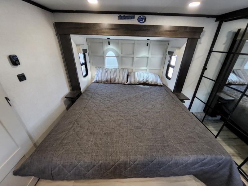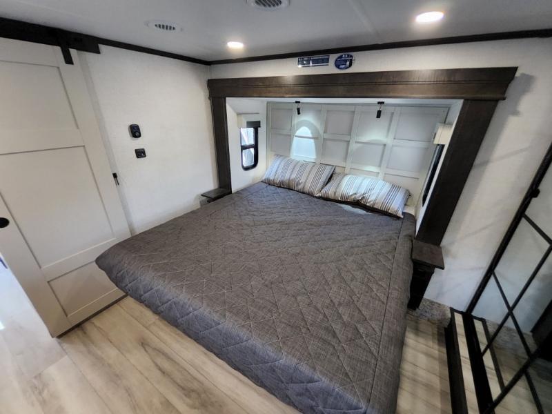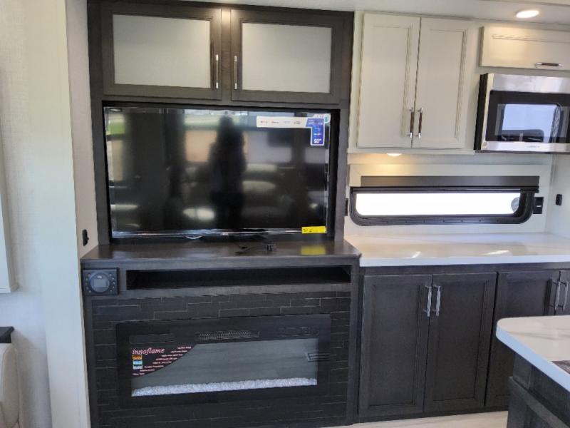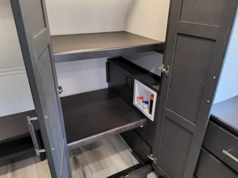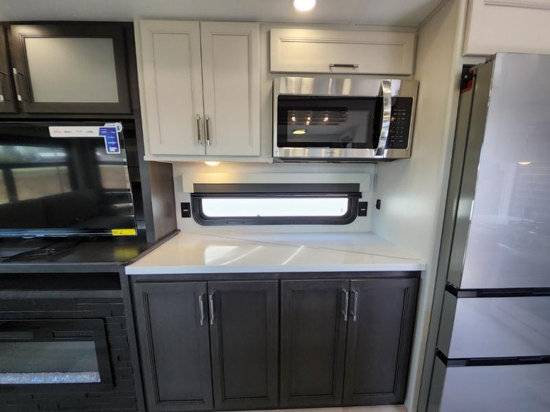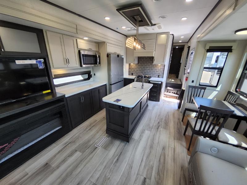 You will feel right at home camping in this fifth wheel! The chef will have lots of countertop space to prepare their best meals along with a kitchen island, two pull-out pantries to store your dishes, and an 18 cu. ft. residential refrigerator to store any leftovers. The free standing dinette offers a comfortable place to enjoy your meals, and the theater seating across from the fireplace and entertainment center will be perfect for movie nights. There is also a rear hide-a-bed sofa sleeper for any guests you may have. You will love the full bath that includes a shower with a seat, a linen closet, plus two bath sinks for convenience. And don't overlook the front bedroom with a stylish barn door, king bed slide out, and master closet for all your things. You'll also find stackable washer and dryer prep, two drawers, and a Smart HDTV for movies in bed.