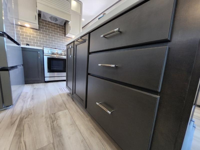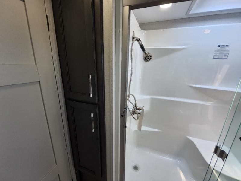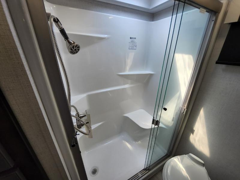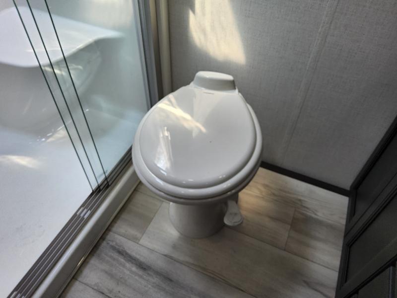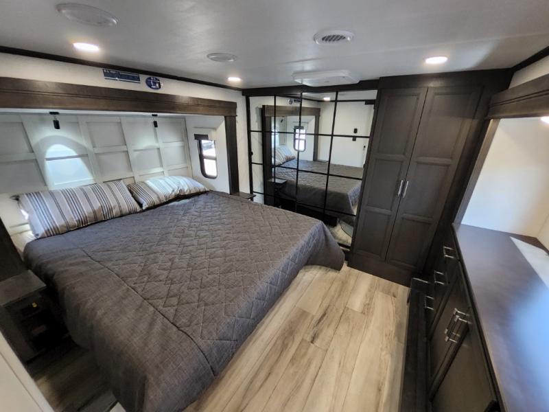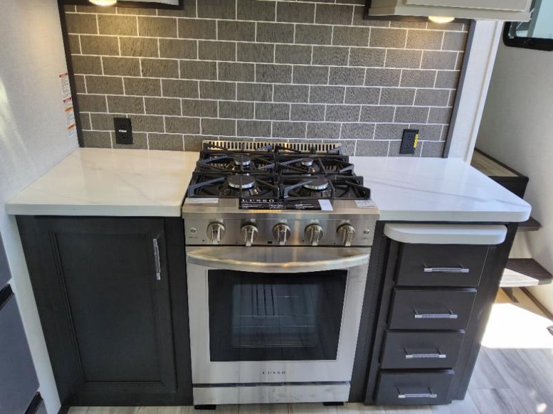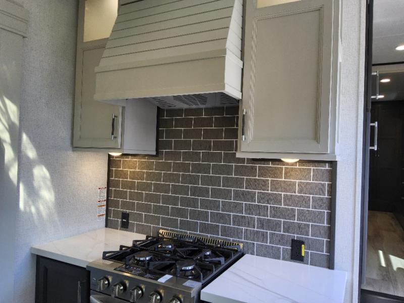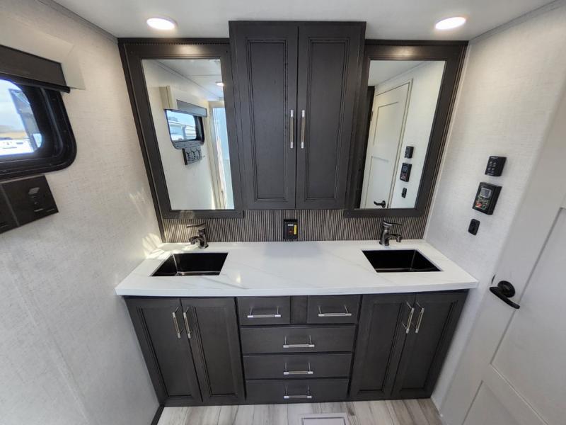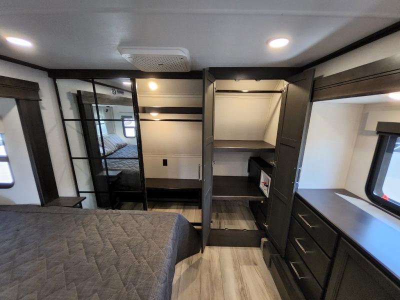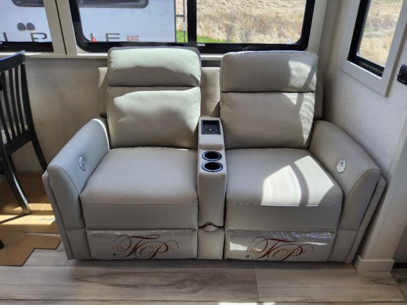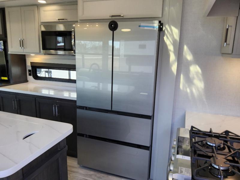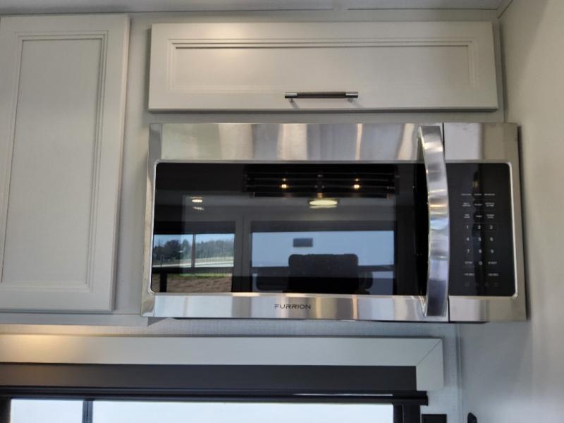 You will feel right at home camping in this fifth wheel! The chef will have lots of countertop space to prepare their best meals along with a kitchen island, two pull-out pantries to store your dishes, and an 18 cu. ft. residential refrigerator to store any leftovers. The free standing dinette offers a comfortable place to enjoy your meals, and the theater seating across from the fireplace and entertainment center will be perfect for movie nights. There is also a rear hide-a-bed sofa sleeper for any guests you may have. You will love the full bath that includes a shower with a seat, a linen closet, plus two bath sinks for convenience. And don't overlook the front bedroom with a stylish barn door, king bed slide out, and master closet for all your things. You'll also find stackable washer and dryer prep, two drawers, and a Smart HDTV for movies in bed.