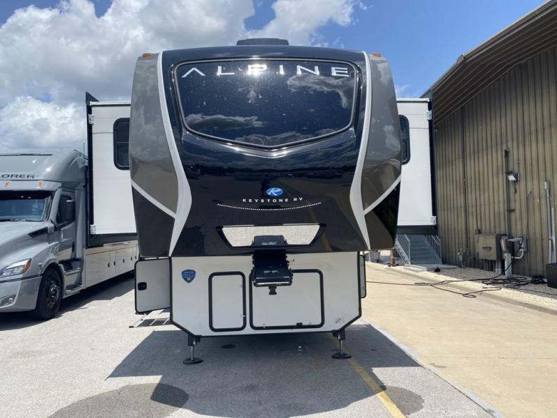 Luxury is not an option, it is a standard with each one of these Keystone RV Alpine fifth wheels! A 8' 4" wide body construction will create an open, residential feeling, and cutting-edge technology will provide a hassle-free camping experience. The Tru-Fit slide construction is more durable and minimizes motor structural stress, as well as resists leaking, and the Blade Pure airflow system provides residential comfort with its high-performance. Each fifth wheel includes designer flooring throughout, stunning solid wood cabinet doors, luxurious crown molding, and solid surface countertops in the kitchen. The SolarFlex Protect 200 comes standard or you can choose the optional SolarFlex Discover 440i for even more off-grid capabilities. The exterior also includes an outside shower with hot and cold water, Lippert strut assisted SolidSteps, Hitch Vision with LED lighting, and many more conveniences!