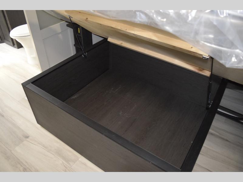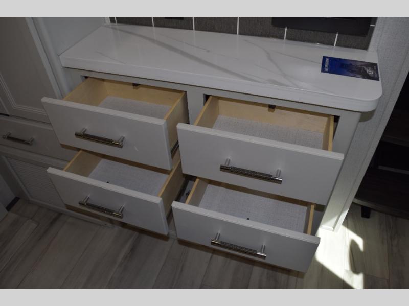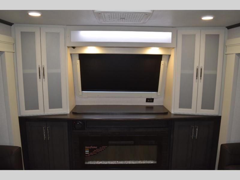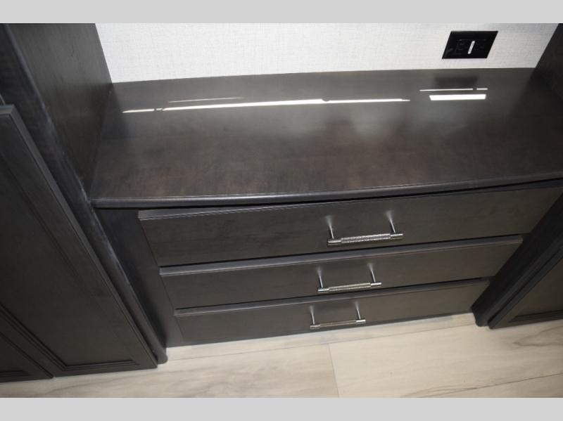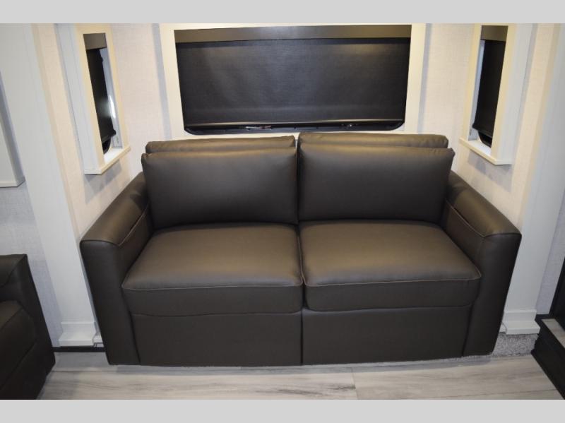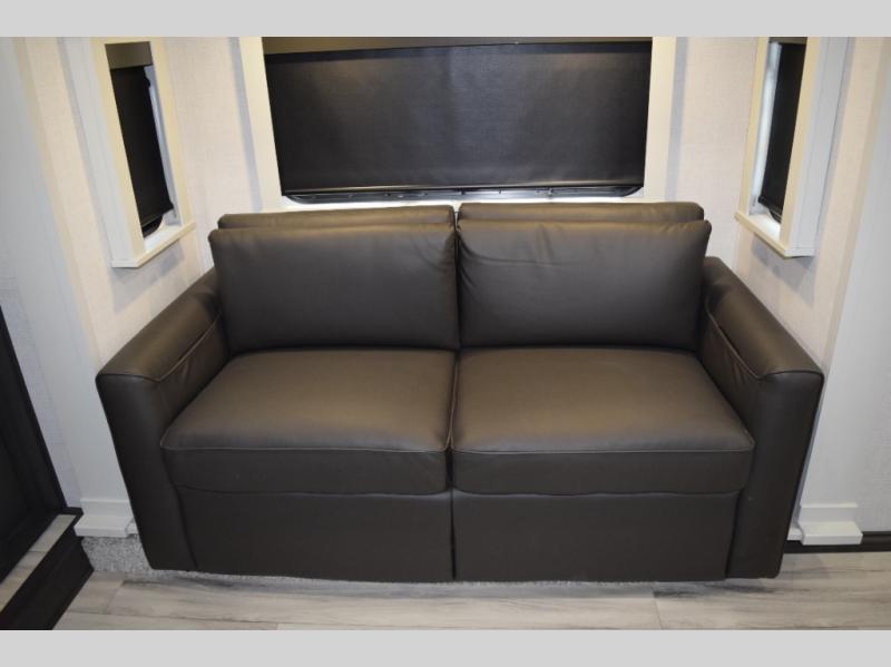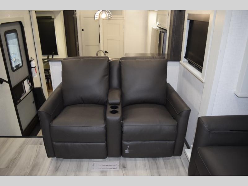 The front living area is where the magic happens! Gather with family and friends around the 40" fireplace and 50" TV in the front entertainment center, or sink into the opposing tri-fold sofa sleepers for a comfortable, relaxing evening. The Thomas Payne theater seating is the perfect spot to unwind, featuring heat, massage, LED lights, and a USB charging station for your devices.