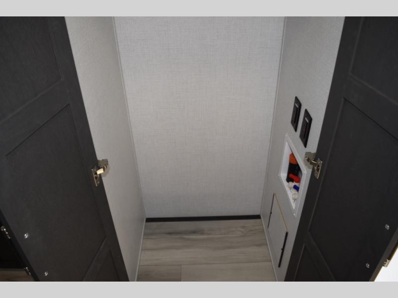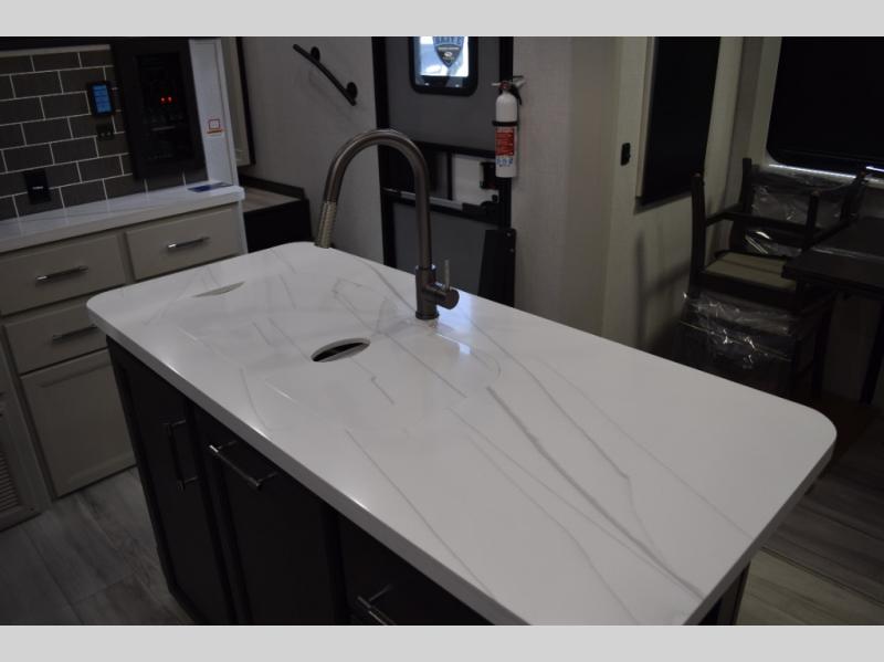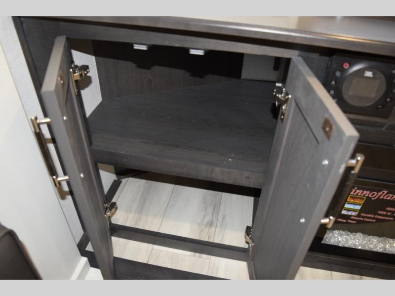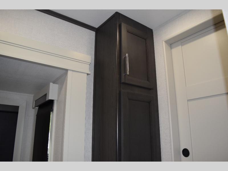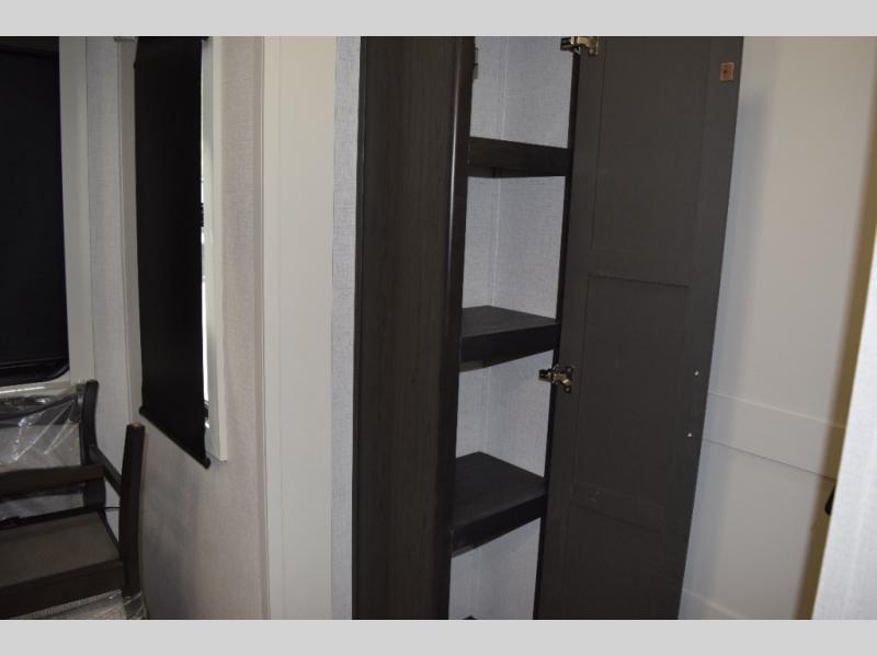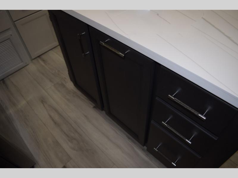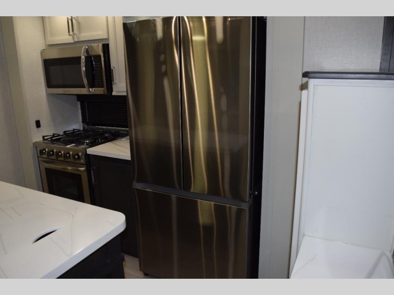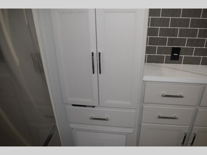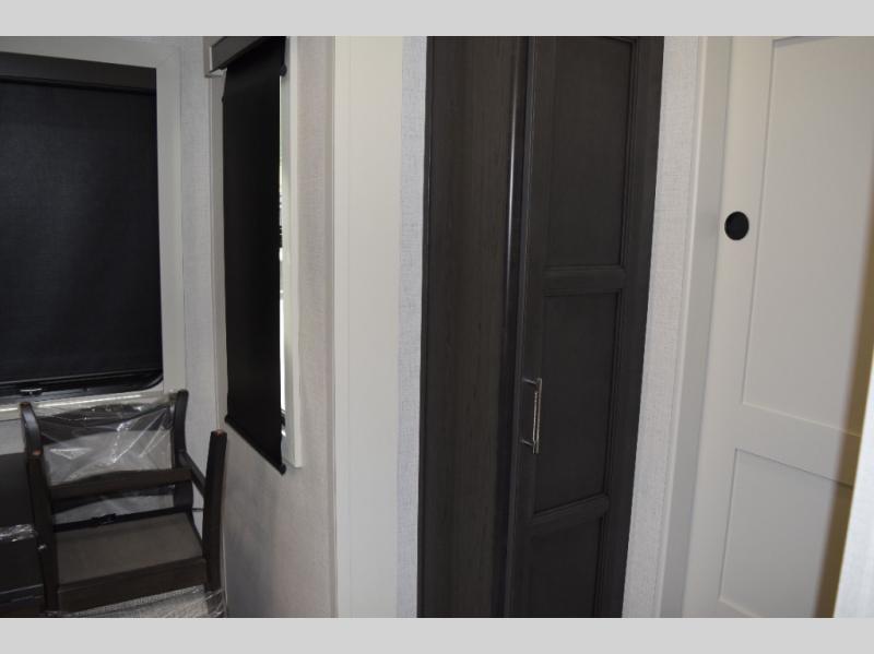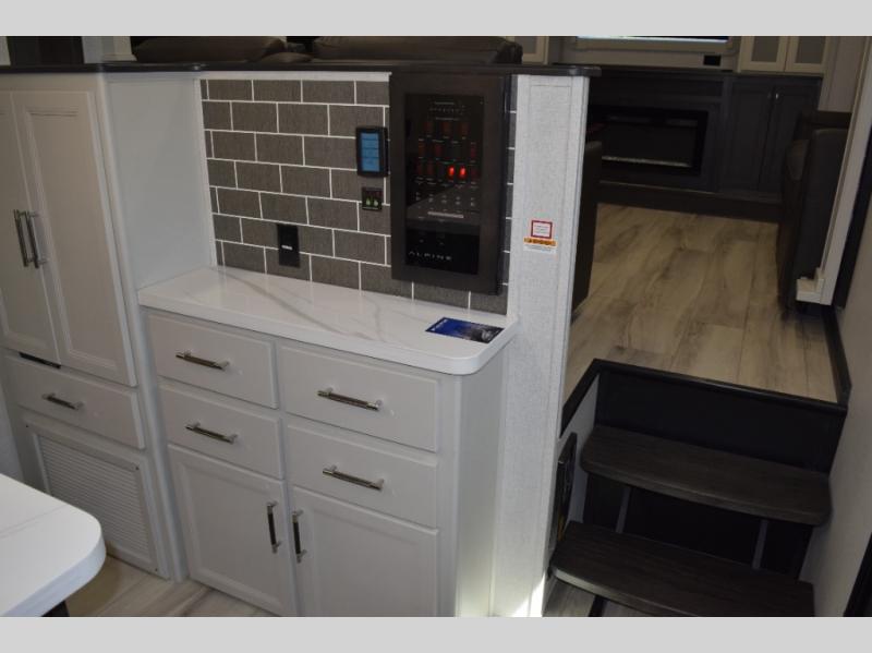 This Alpine Fifth Wheel takes luxury to the next level with a full rear bathroom that transforms your private bedroom into a true master suite. The king bed slide provides extra room, and with underbed storage for blankets and gear, you’ll have plenty of space to stay organized. Enjoy the convenience of a dual sink vanity, a shower with a seat, and a closet with stackable washer and dryer prep in the full bathroom.