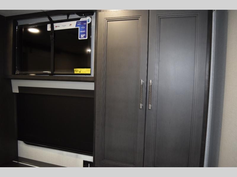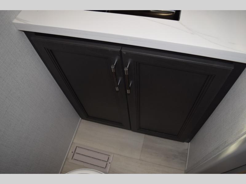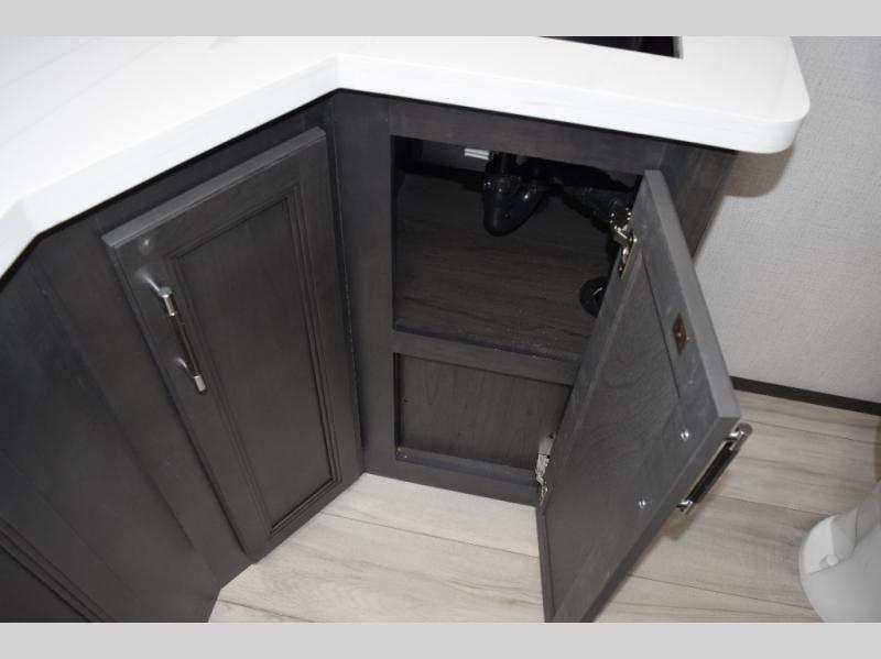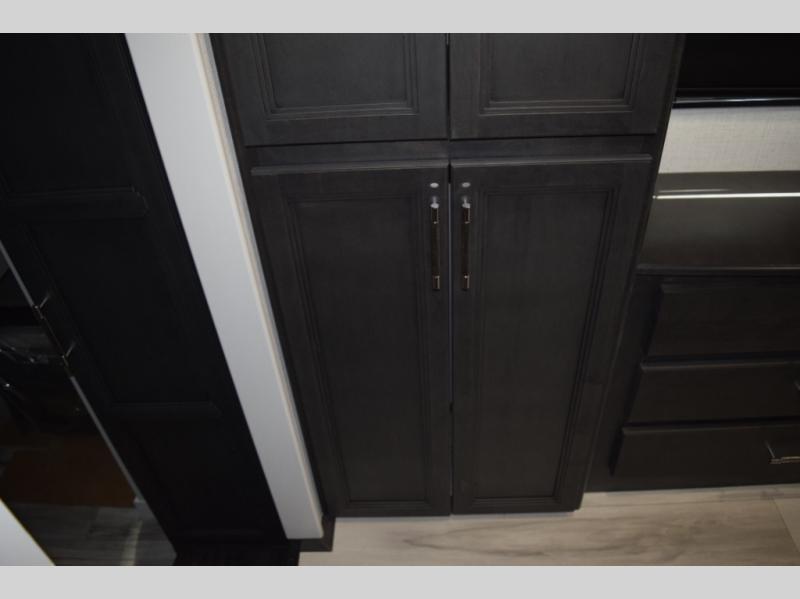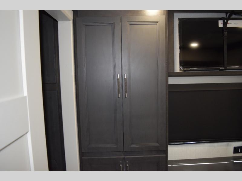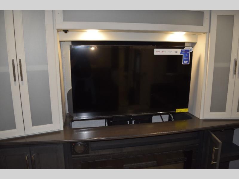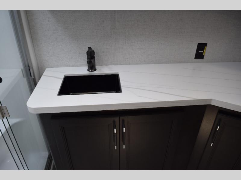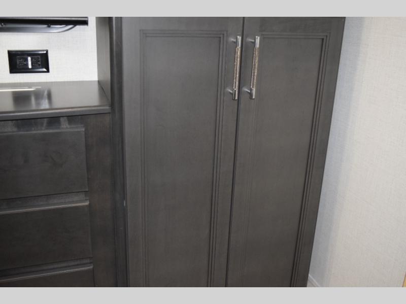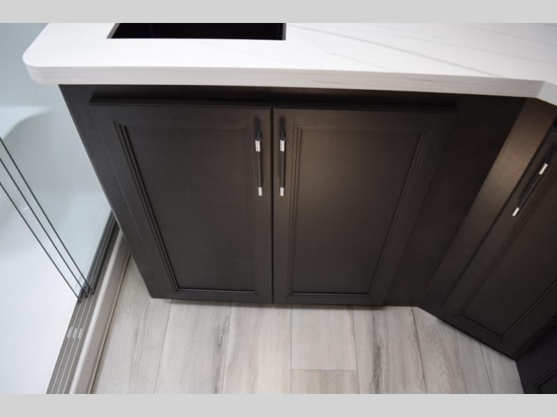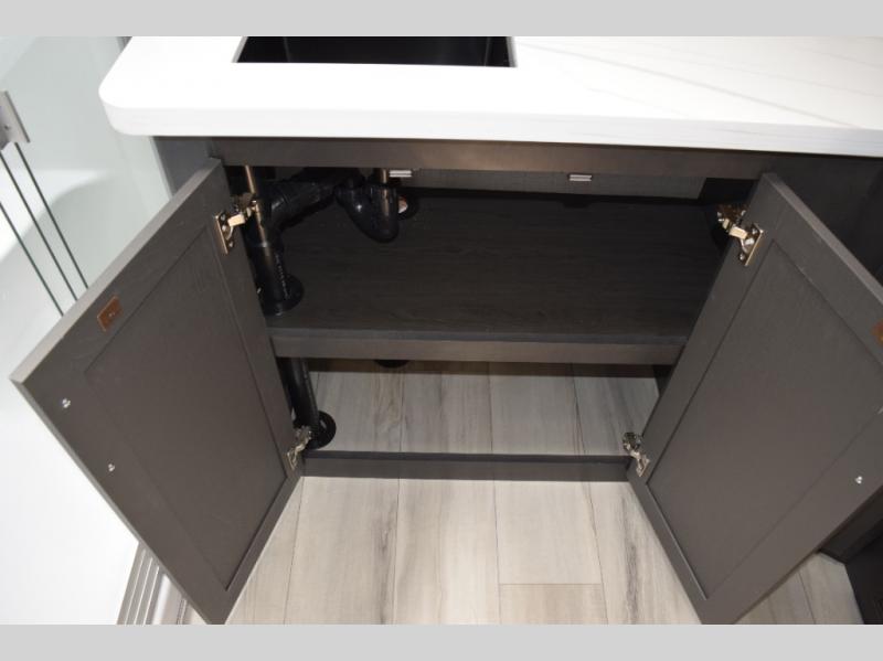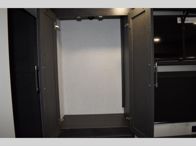 This Alpine Fifth Wheel takes luxury to the next level with a full rear bathroom that transforms your private bedroom into a true master suite. The king bed slide provides extra room, and with underbed storage for blankets and gear, you’ll have plenty of space to stay organized. Enjoy the convenience of a dual sink vanity, a shower with a seat, and a closet with stackable washer and dryer prep in the full bathroom.