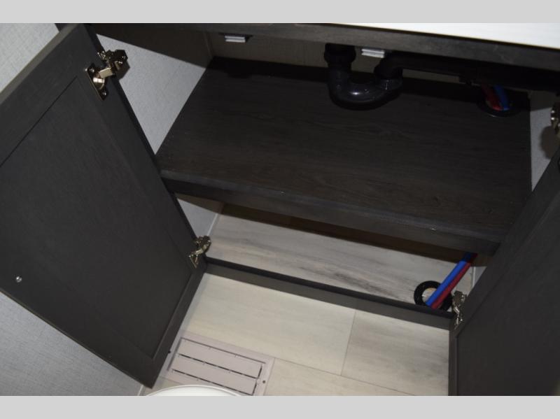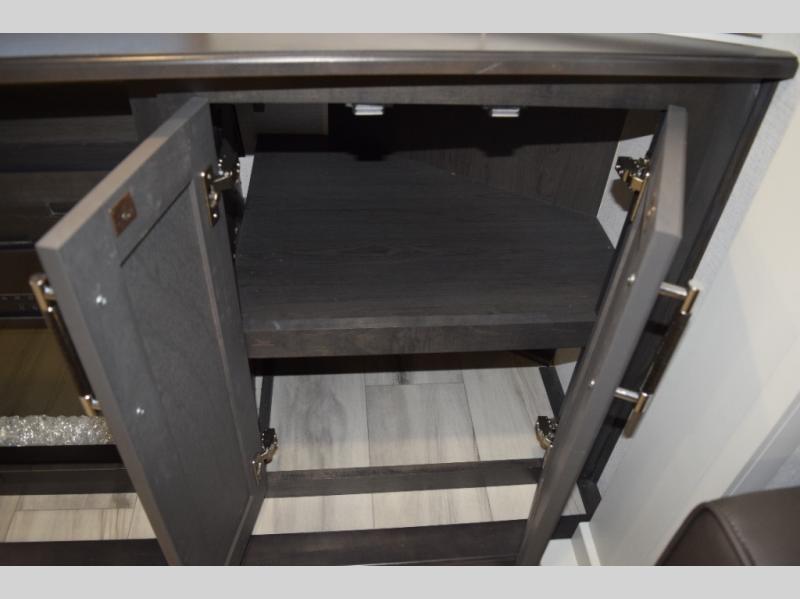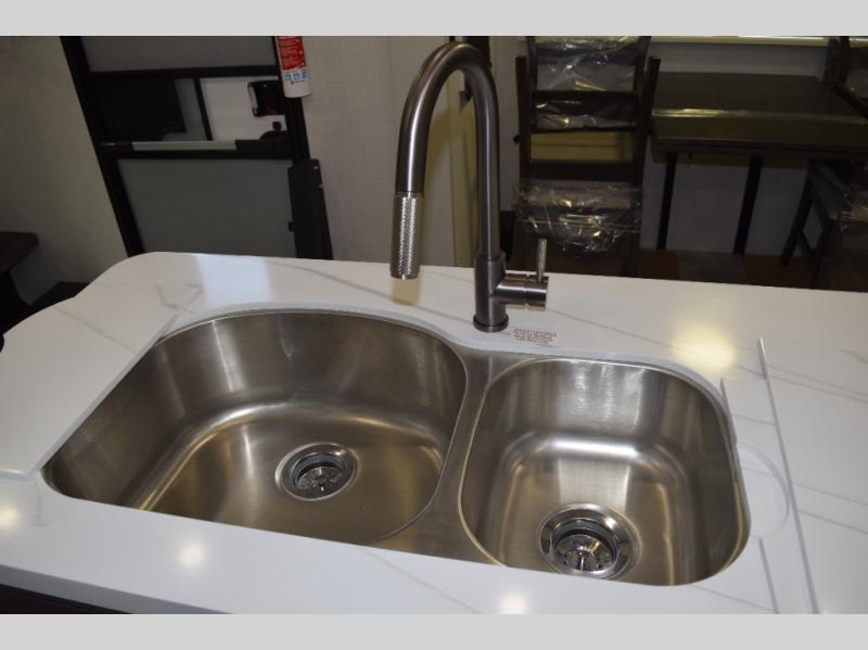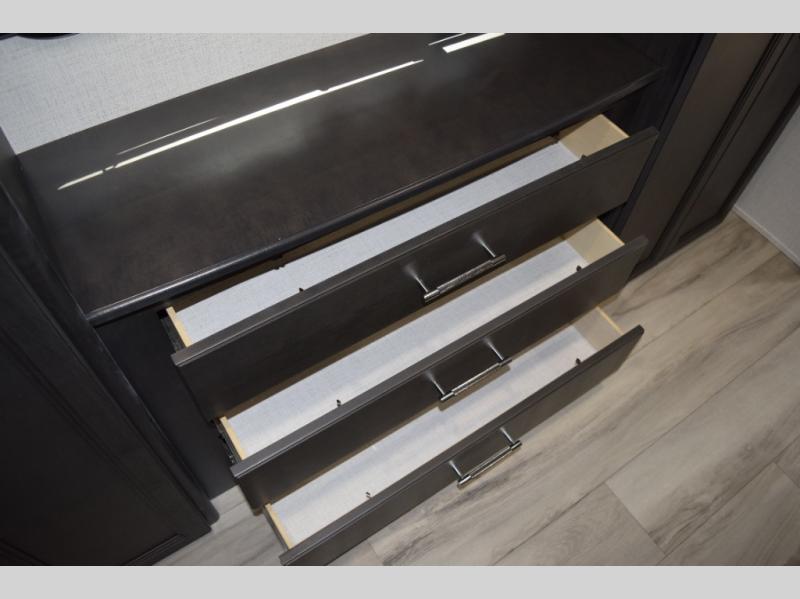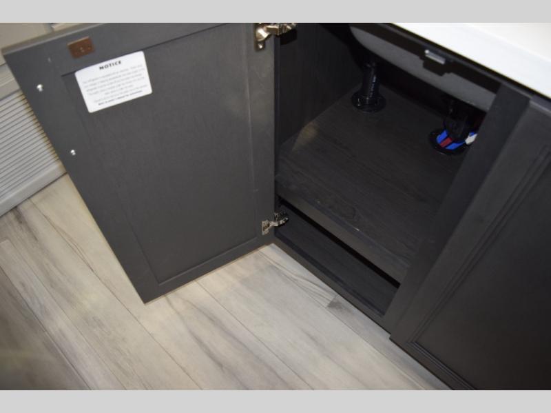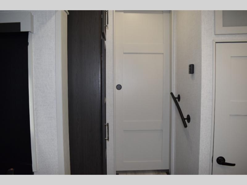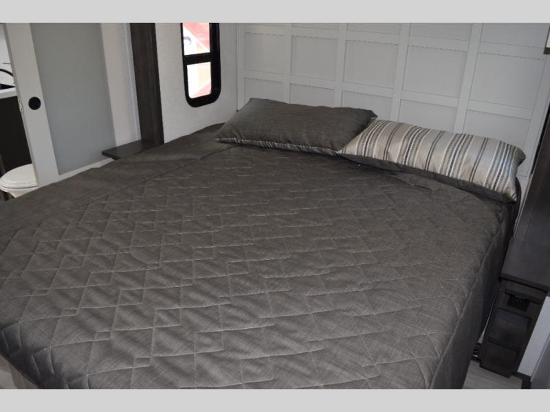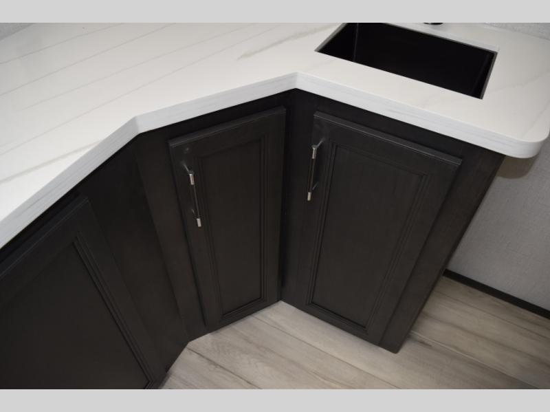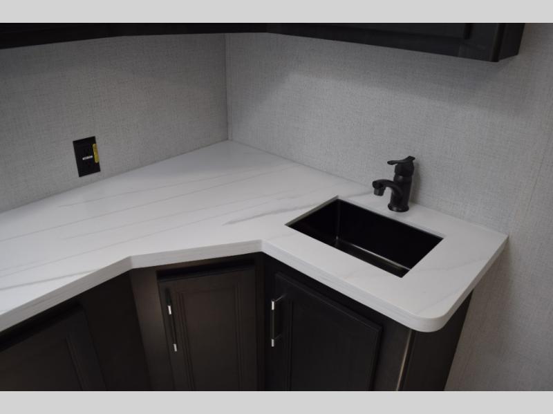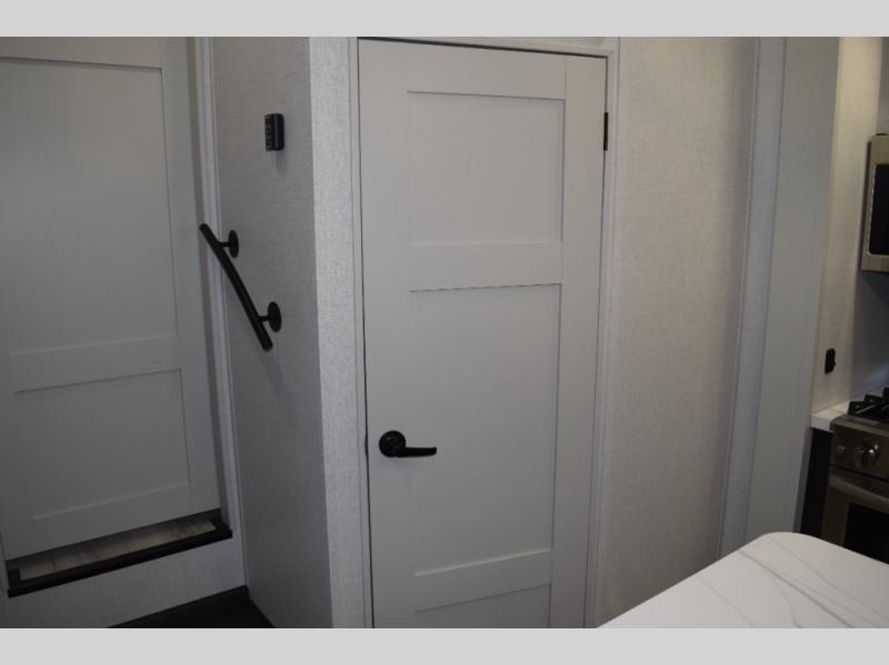 This Alpine Fifth Wheel takes luxury to the next level with a full rear bathroom that transforms your private bedroom into a true master suite. The king bed slide provides extra room, and with underbed storage for blankets and gear, you’ll have plenty of space to stay organized. Enjoy the convenience of a dual sink vanity, a shower with a seat, and a closet with stackable washer and dryer prep in the full bathroom.