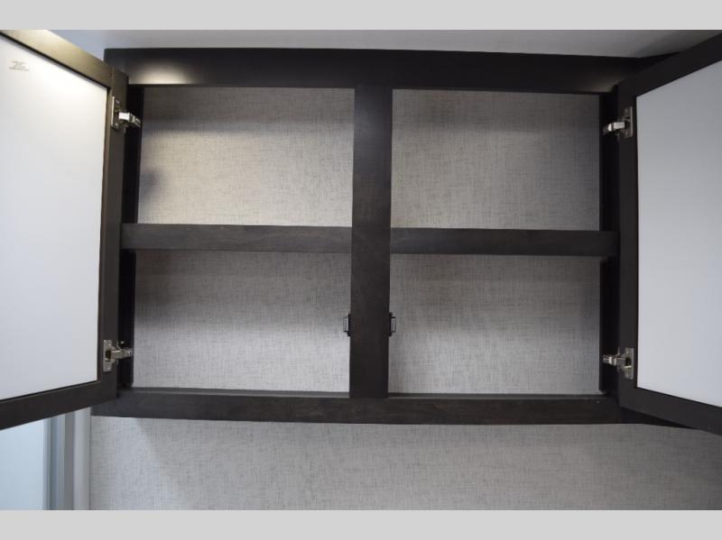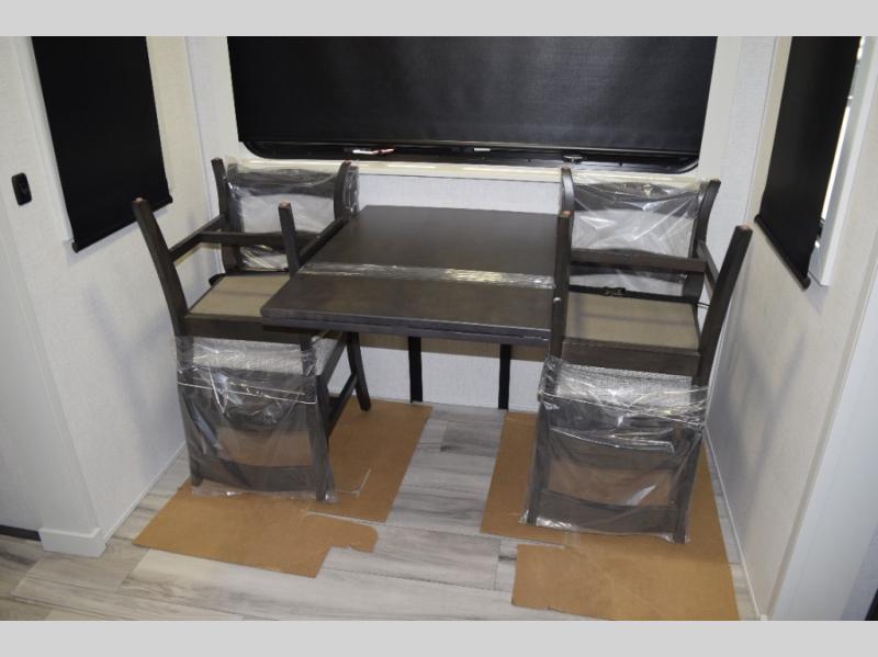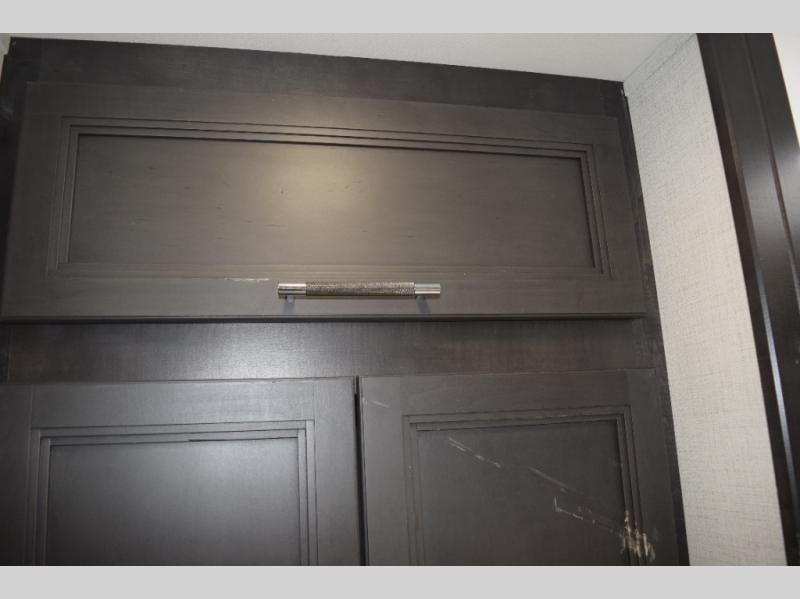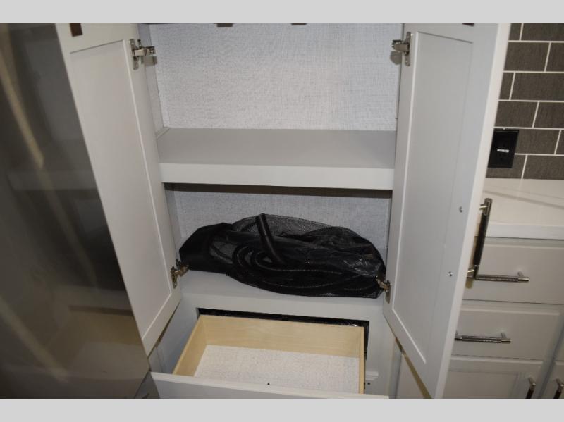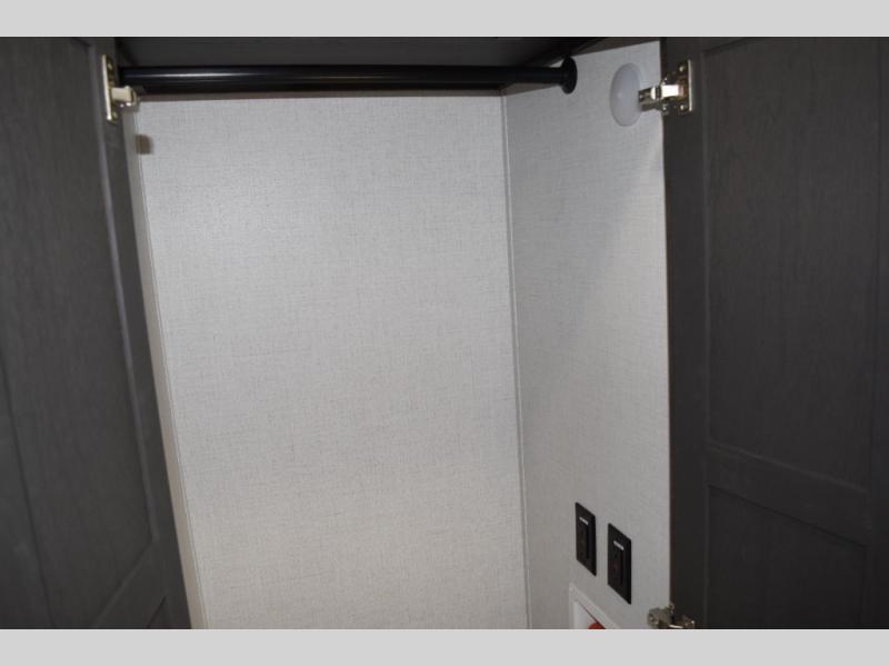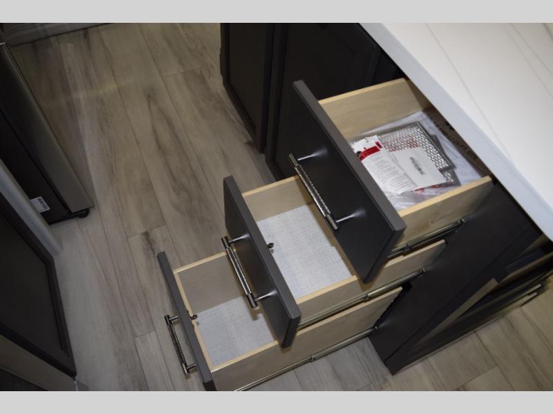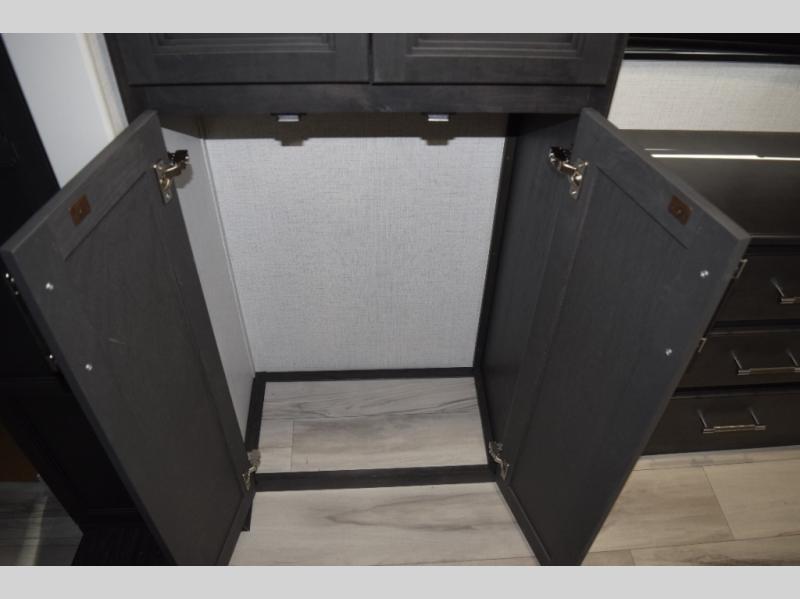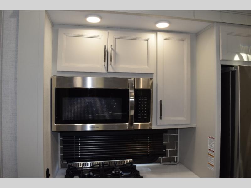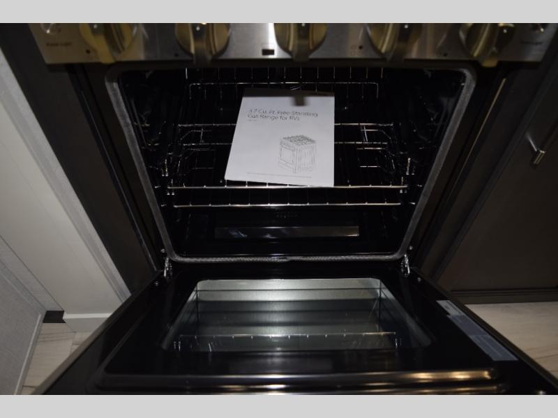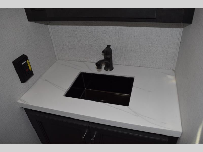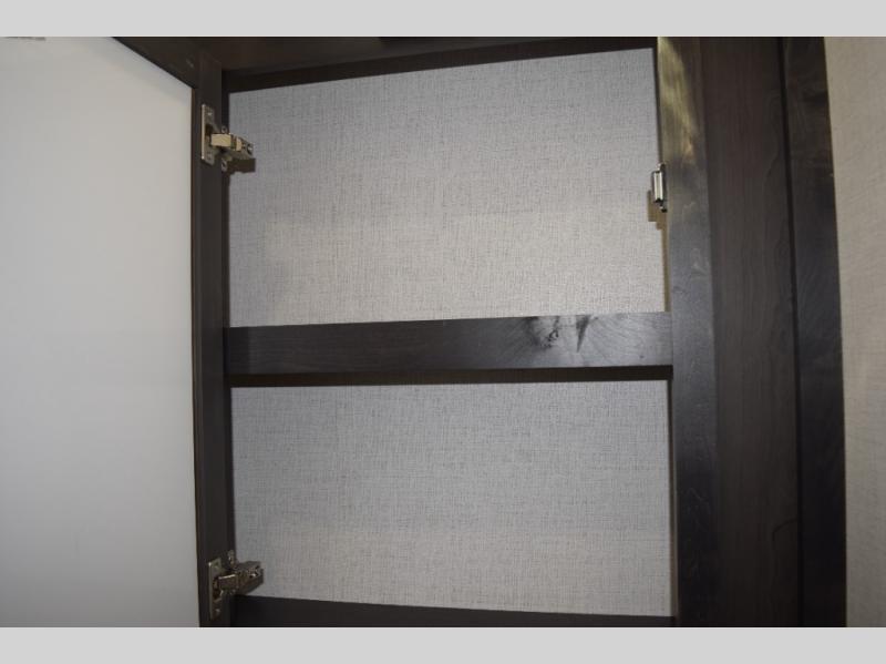 This Alpine Fifth Wheel takes luxury to the next level with a full rear bathroom that transforms your private bedroom into a true master suite. The king bed slide provides extra room, and with underbed storage for blankets and gear, you’ll have plenty of space to stay organized. Enjoy the convenience of a dual sink vanity, a shower with a seat, and a closet with stackable washer and dryer prep in the full bathroom.