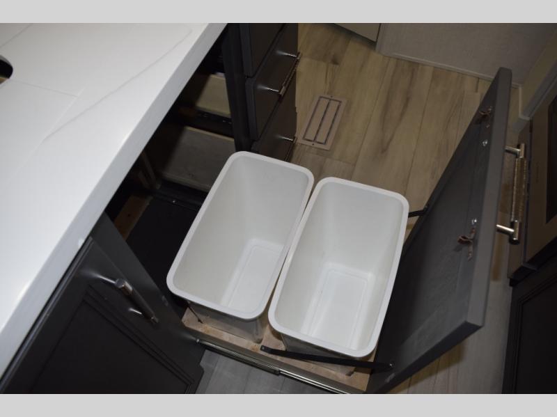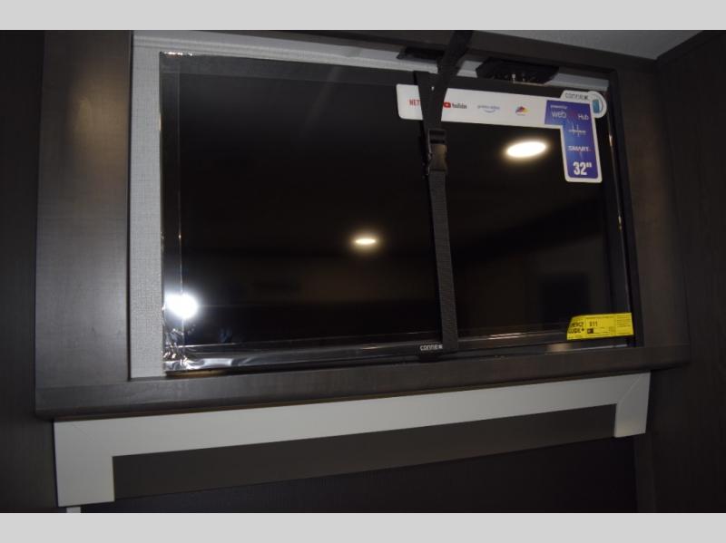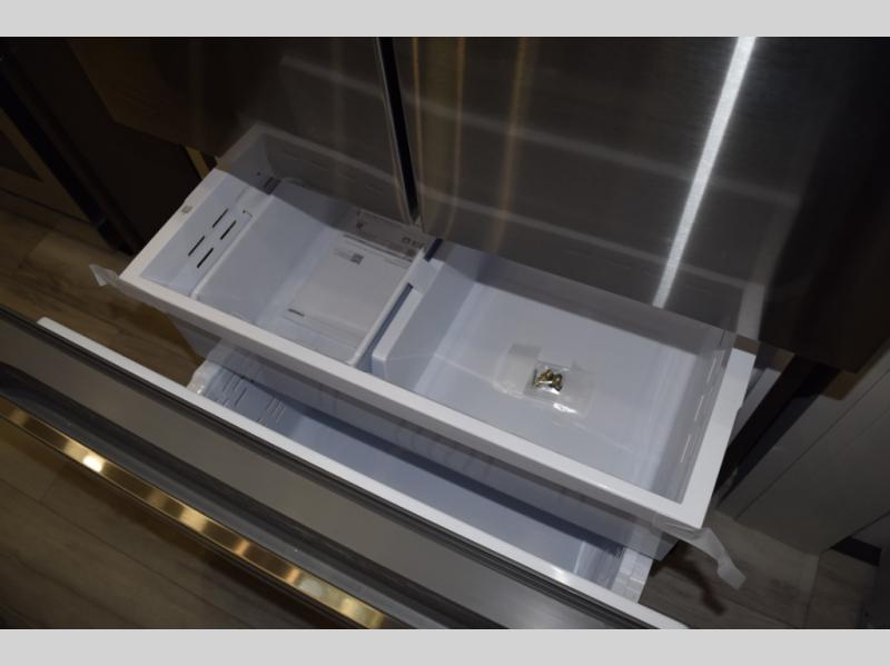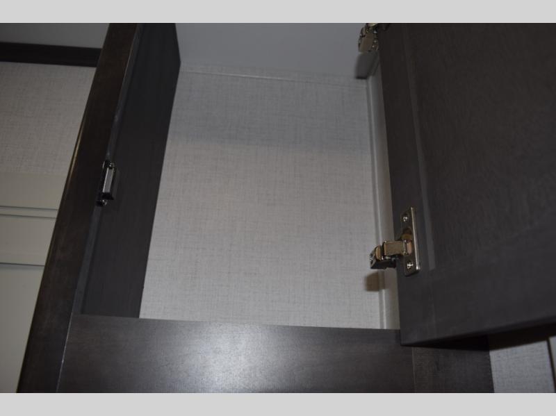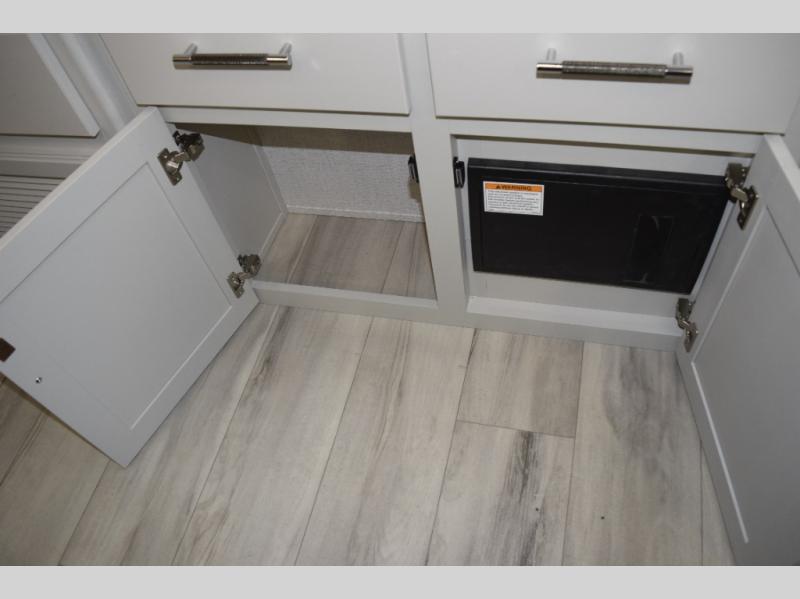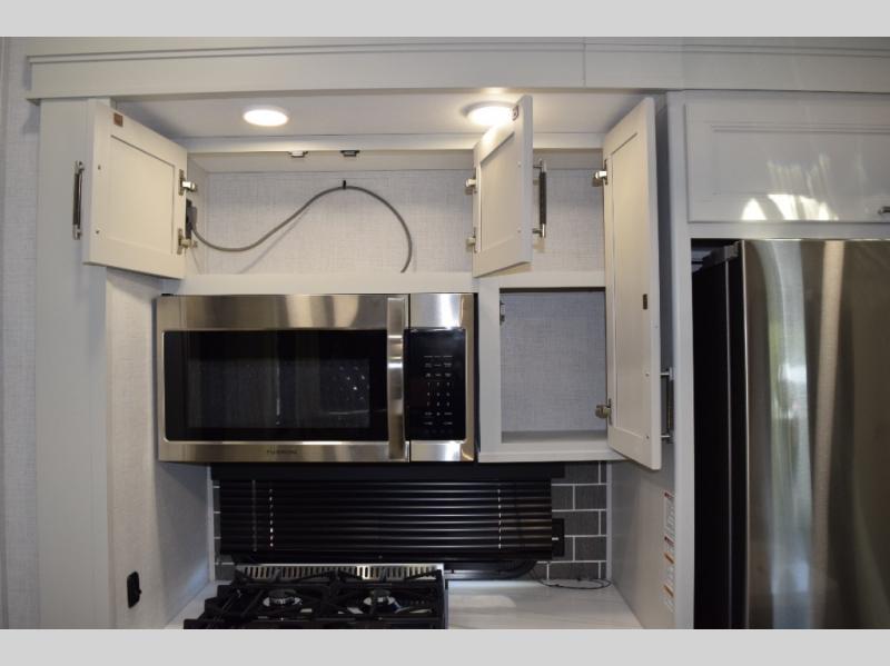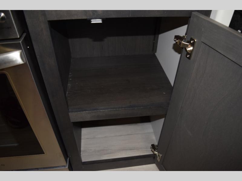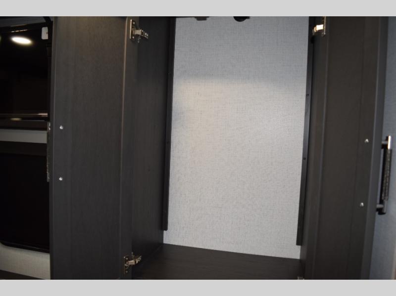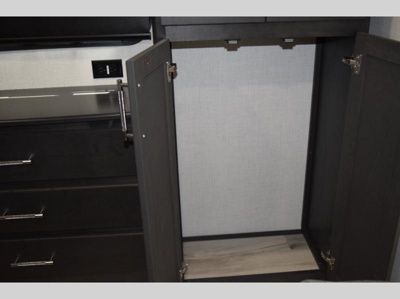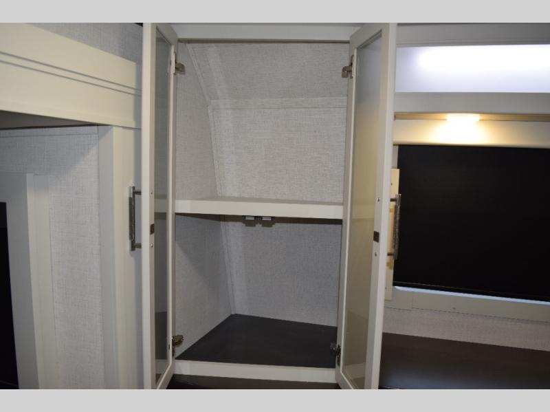 This Alpine Fifth Wheel takes luxury to the next level with a full rear bathroom that transforms your private bedroom into a true master suite. The king bed slide provides extra room, and with underbed storage for blankets and gear, you’ll have plenty of space to stay organized. Enjoy the convenience of a dual sink vanity, a shower with a seat, and a closet with stackable washer and dryer prep in the full bathroom.