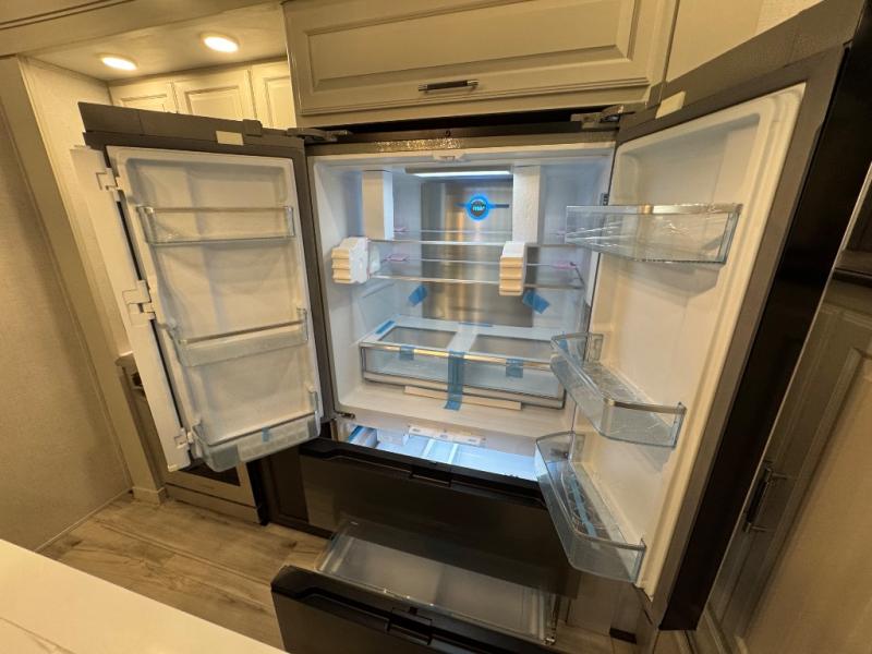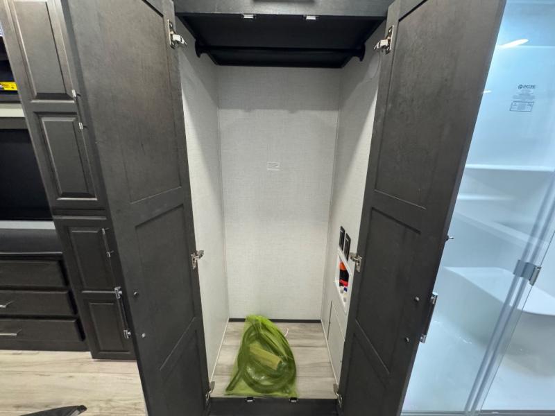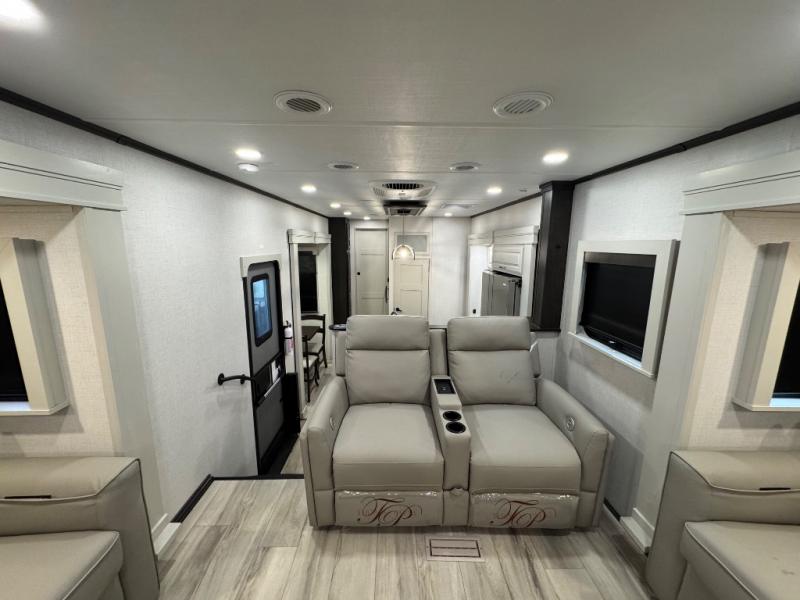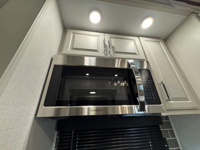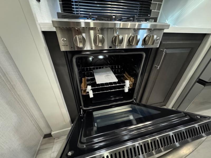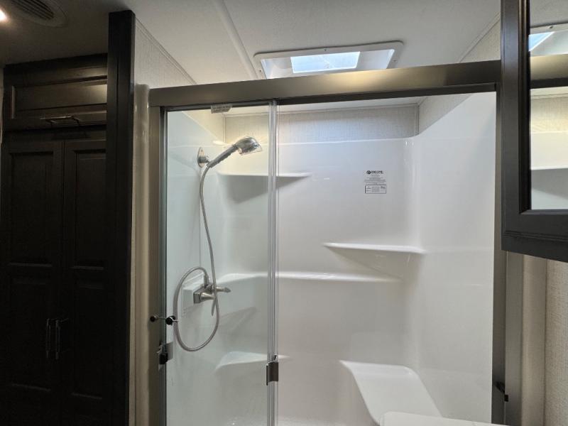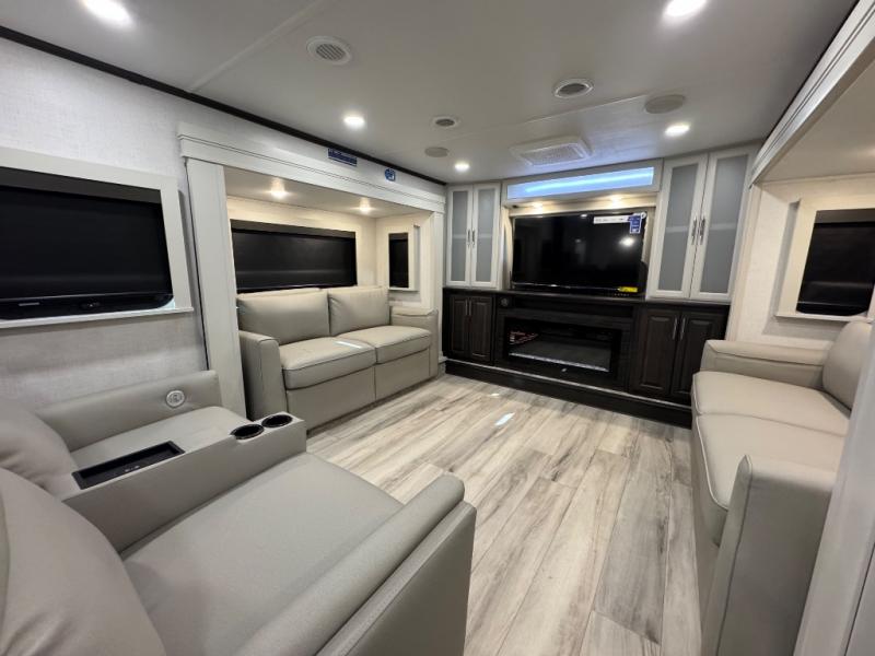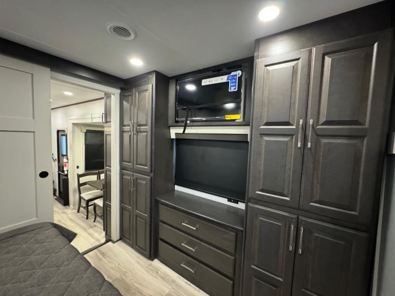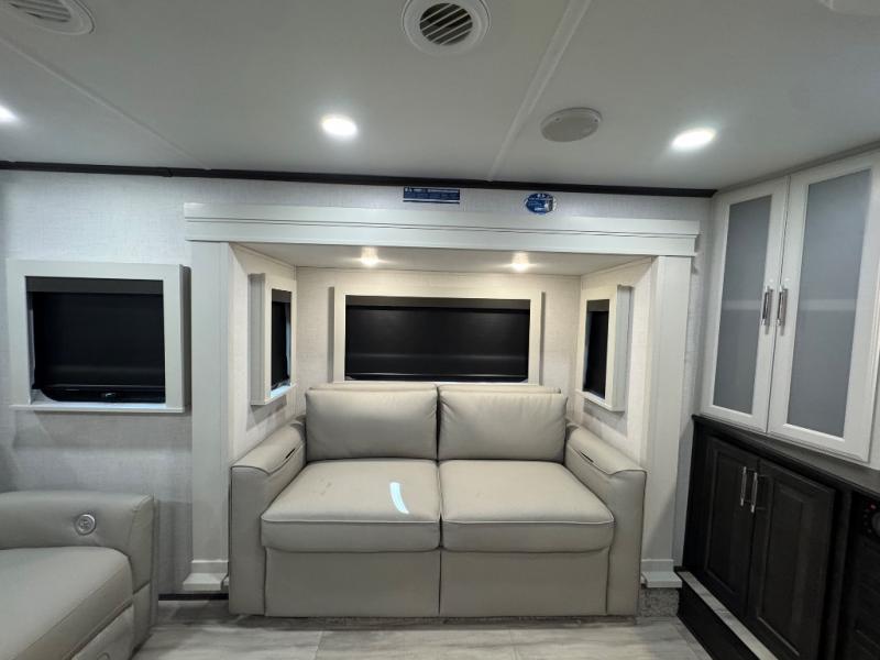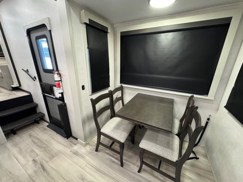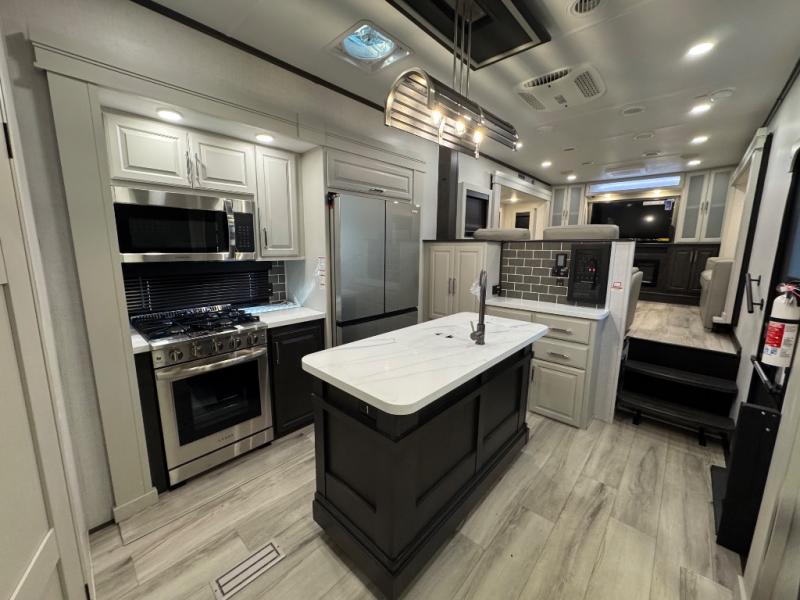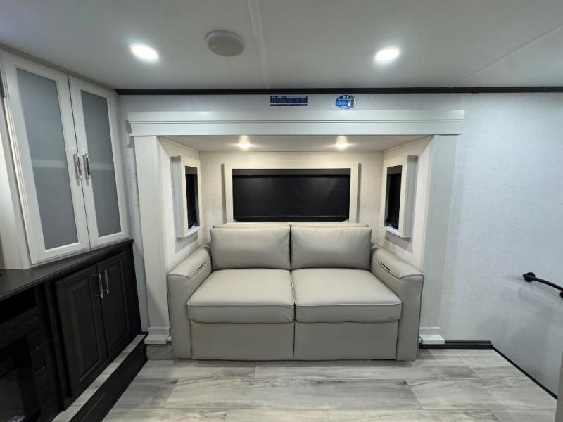 A full rear bathroom creates a master suite in this fifth wheel! The private bedroom has a king bed slide with storage underneath for extra blankets, a chest with a TV, and access to the full bathroom which has a dual sink vanity, a shower with a seat, and a closet with stackable washer and dryer prep. The half bathroom is by the kitchen so you can quickly get back to preparing your delicious meal with the three burner cooktop and kitchen island then enjoy your meals at the free standing dinette. The front living area has a front entertainment center with a 40" fireplace and 50" TV with overhead cabinets to store your movies, as well as opposing tri-fold sofa sleeper slides and Thomas Payne theater seating with heat, massage, LED lights, and a USB charging station.