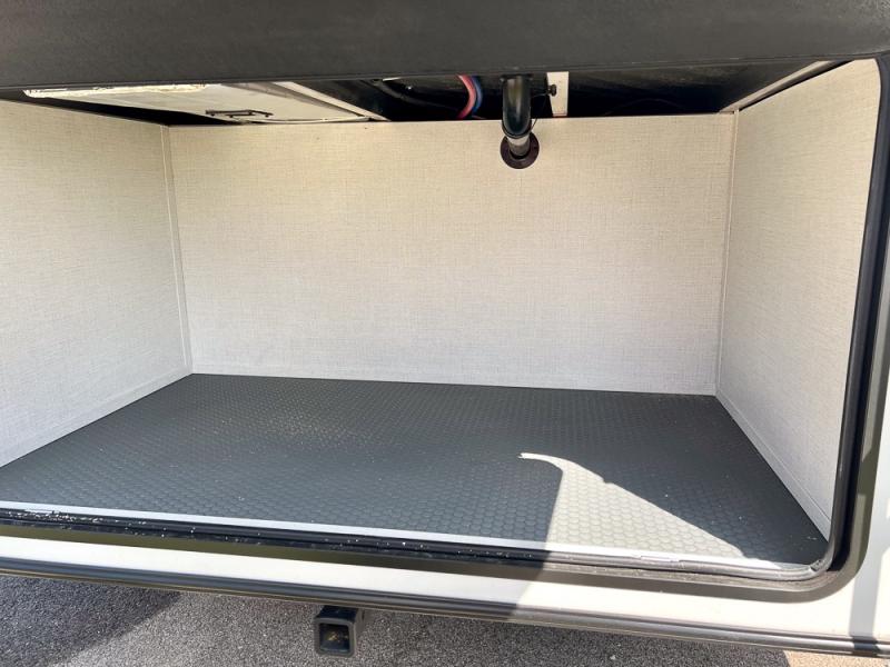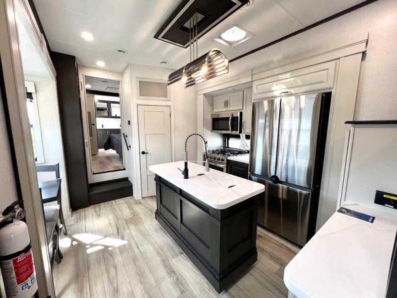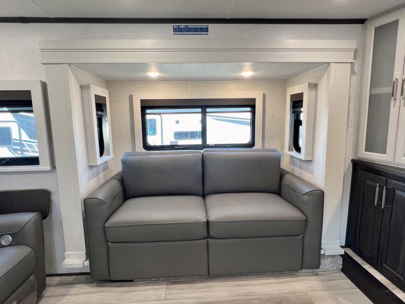 A full rear bathroom creates a master suite in this fifth wheel! The private bedroom has a king bed slide with storage underneath for extra blankets, a chest with a TV, and access to the full bathroom which has a dual sink vanity, a shower with a seat, and a closet with stackable washer and dryer prep. The half bathroom is by the kitchen so you can quickly get back to preparing your delicious meal with the three burner cooktop and kitchen island then enjoy your meals at the free standing dinette. The front living area has a front entertainment center with a 40" fireplace and 50" TV with overhead cabinets to store your movies, as well as opposing tri-fold sofa sleeper slides and Thomas Payne theater seating with heat, massage, LED lights, and a USB charging station.