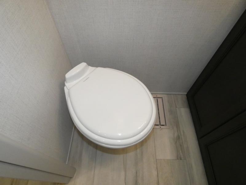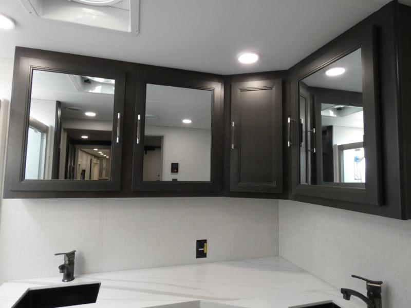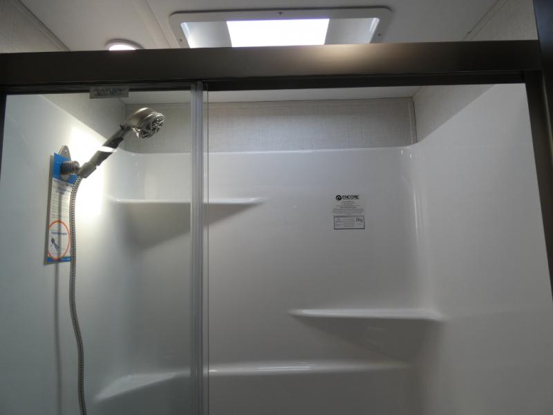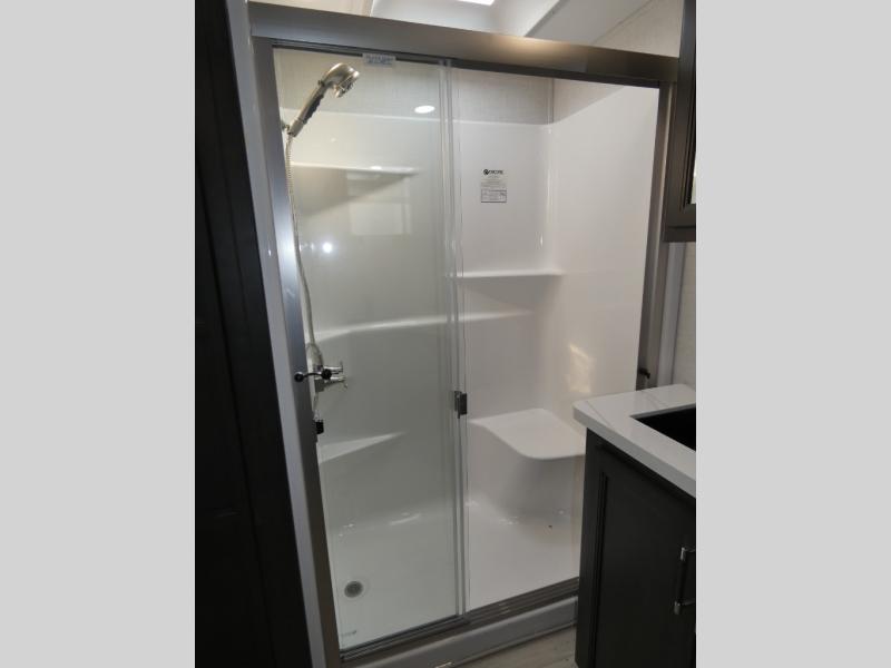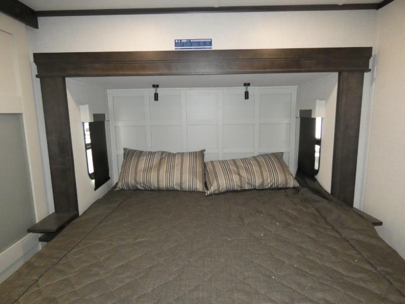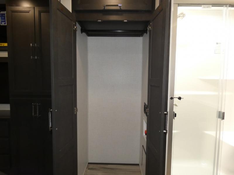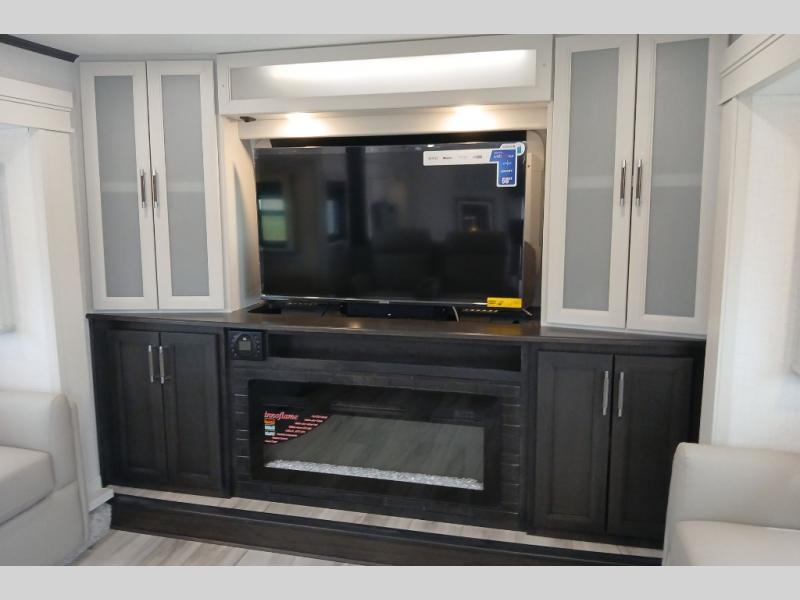 A full rear bathroom creates a master suite in this fifth wheel! The private bedroom has a king bed slide with storage underneath for extra blankets, a chest with a TV, and access to the full bathroom which has a dual sink vanity, a shower with a seat, and a closet with stackable washer and dryer prep. The half bathroom is by the kitchen so you can quickly get back to preparing your delicious meal with the three burner cooktop and kitchen island then enjoy your meals at the free standing dinette. The front living area has a front entertainment center with a 40" fireplace and 50" TV with overhead cabinets to store your movies, as well as opposing tri-fold sofa sleeper slides and Thomas Payne theater seating with heat, massage, LED lights, and a USB charging station.
