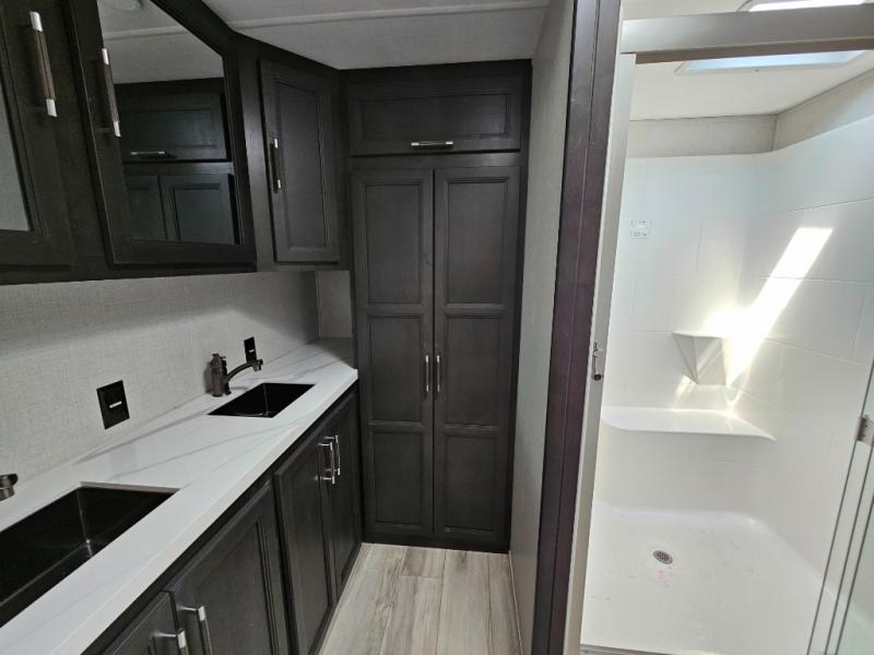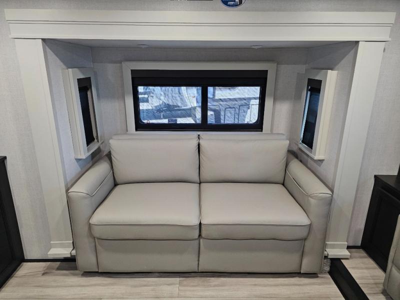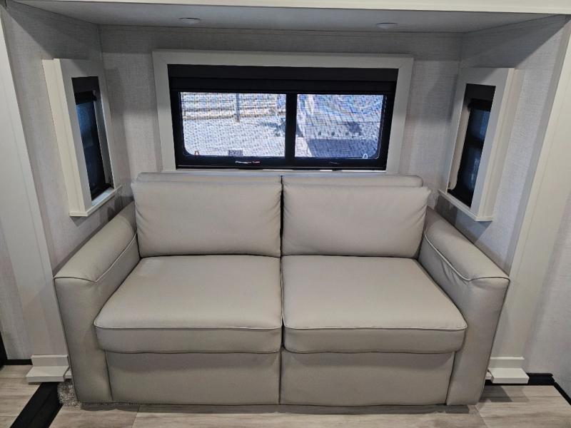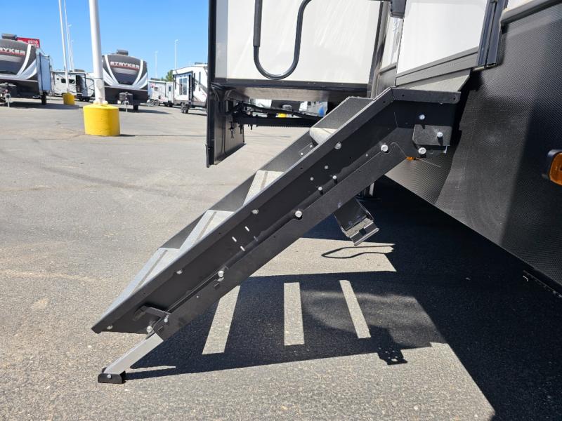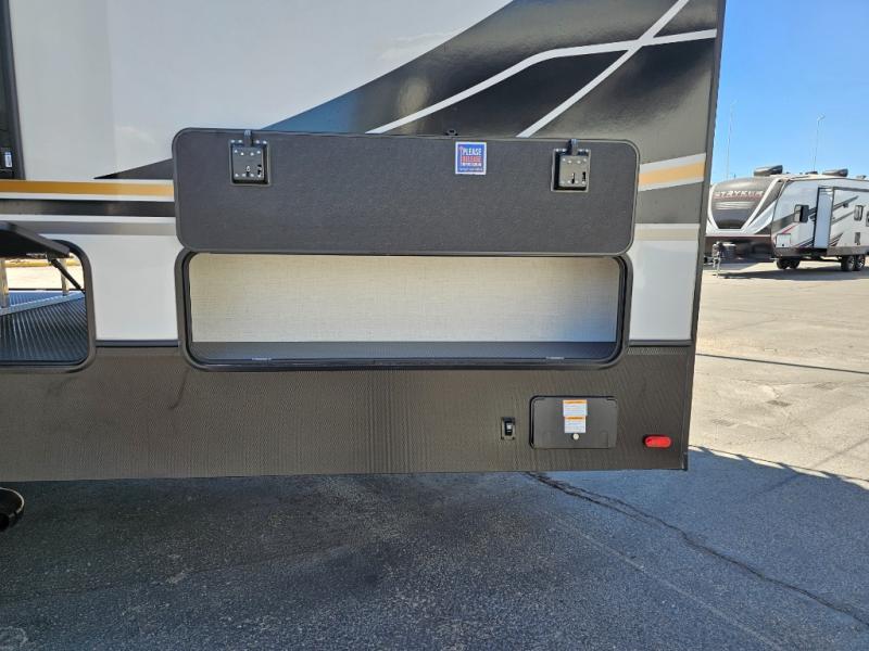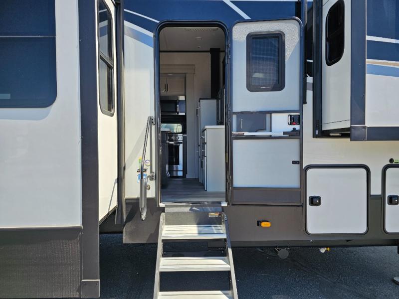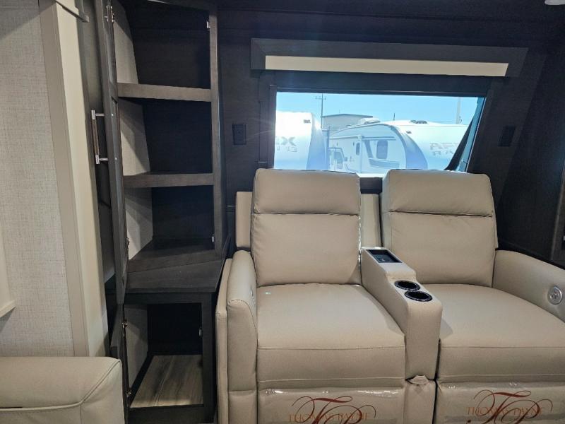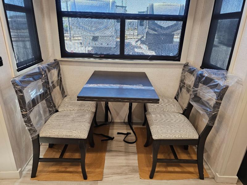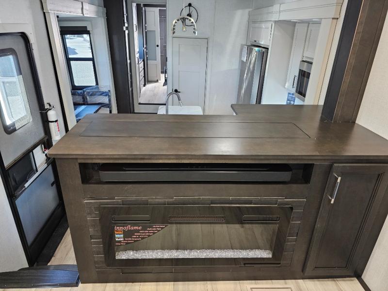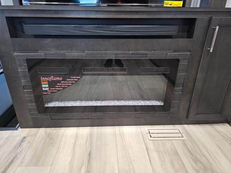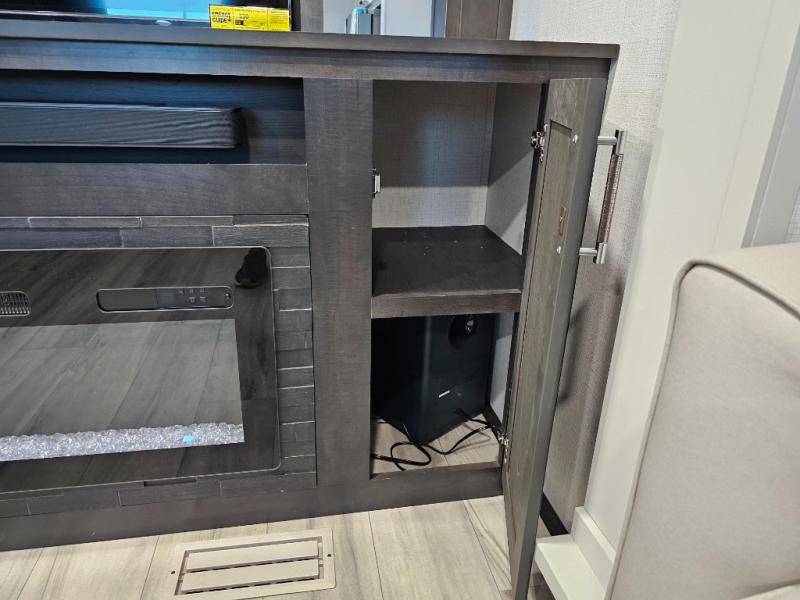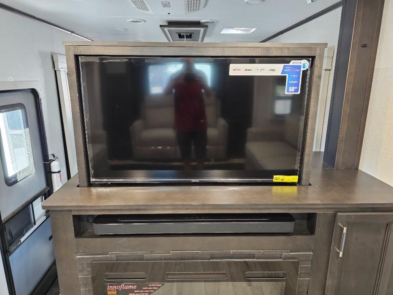 A full rear bathroom creates a master suite in this fifth wheel! The private bedroom has a king bed slide with storage underneath for extra blankets, a chest with a TV, and access to the full bathroom which has a dual sink vanity, a shower with a seat, and a closet with stackable washer and dryer prep. The half bathroom is by the kitchen so you can quickly get back to preparing your delicious meal with the three burner cooktop and kitchen island then enjoy your meals at the free standing dinette. The front living area has a front entertainment center with a 40" fireplace and 50" TV with overhead cabinets to store your movies, as well as opposing tri-fold sofa sleeper slides and Thomas Payne theater seating with heat, massage, LED lights, and a USB charging station.