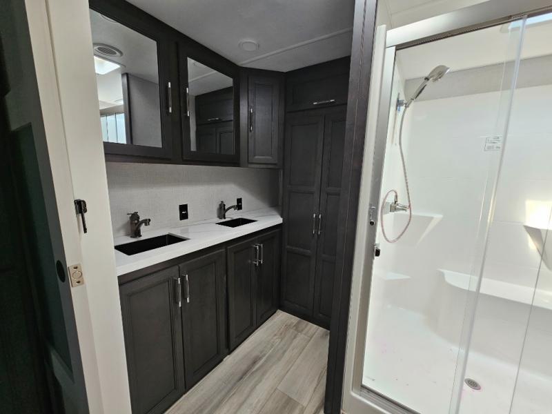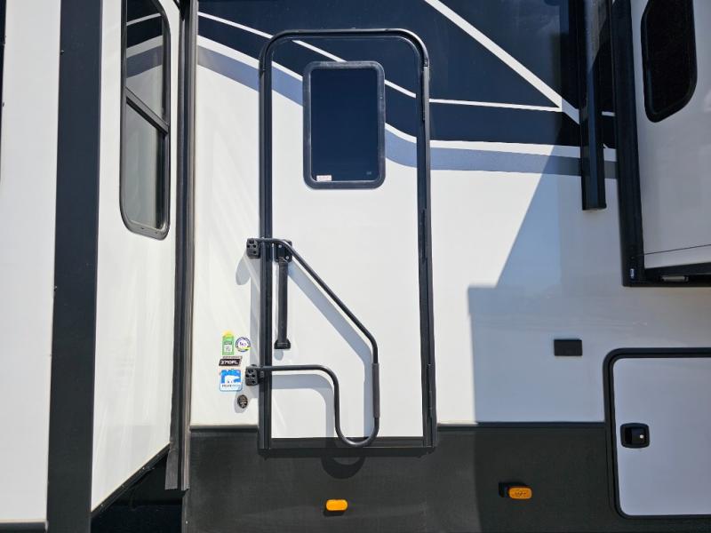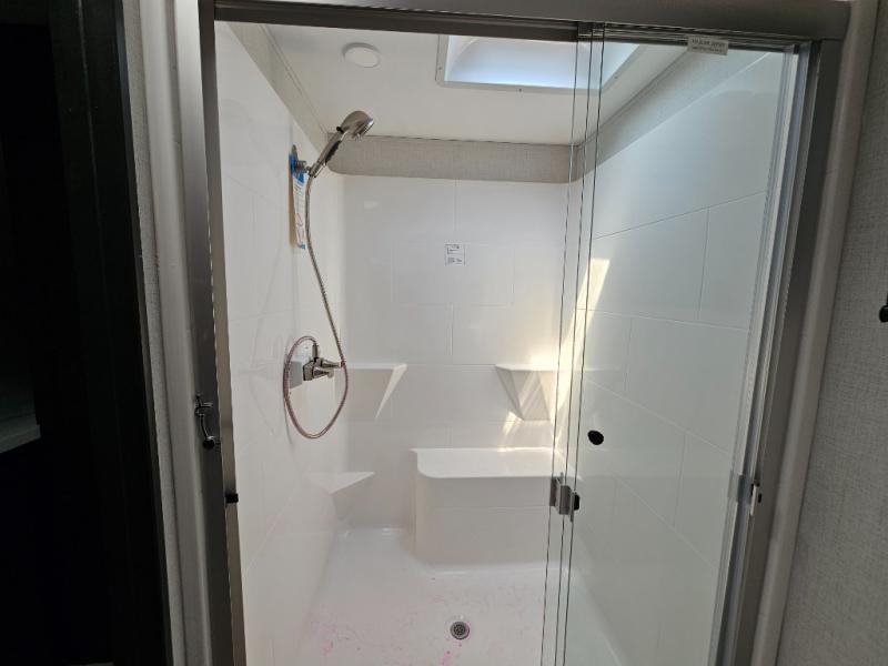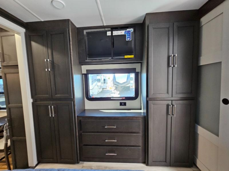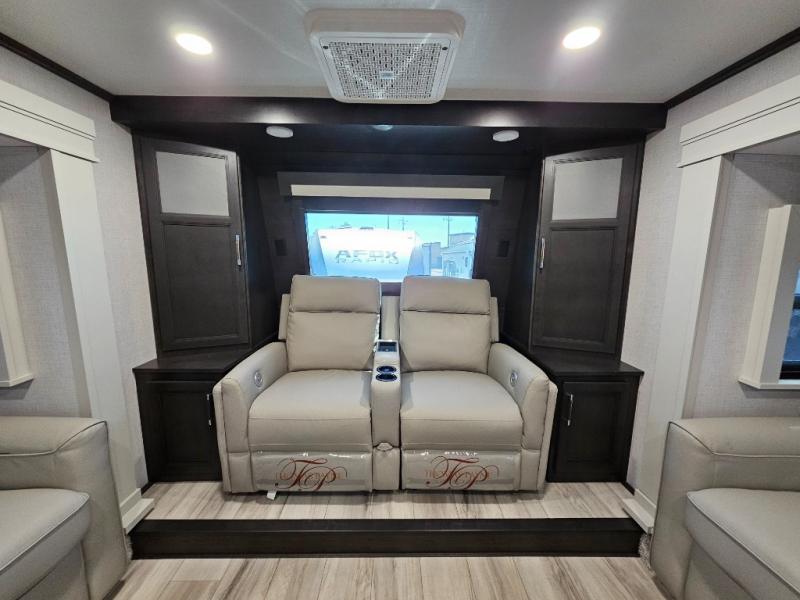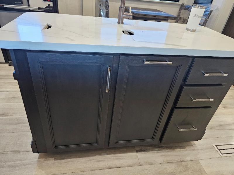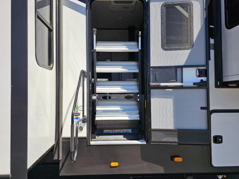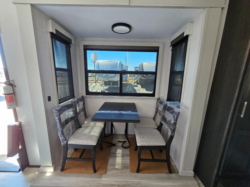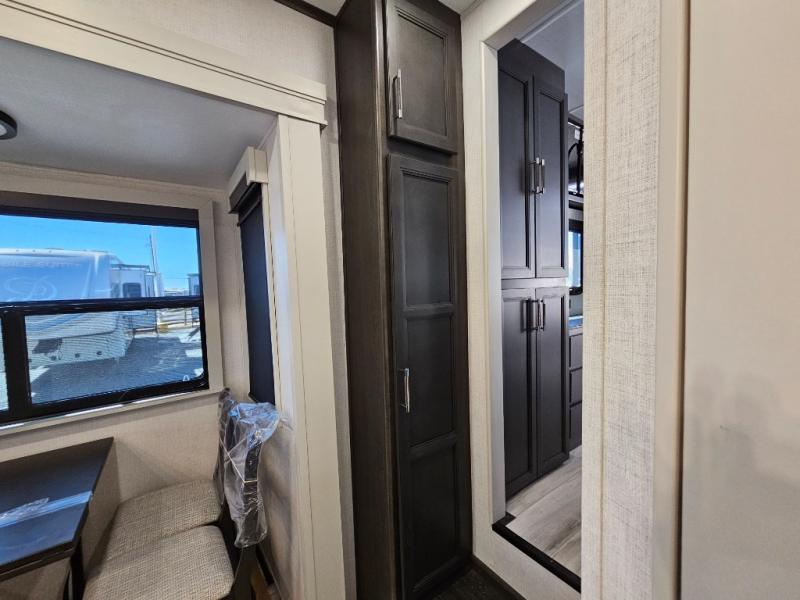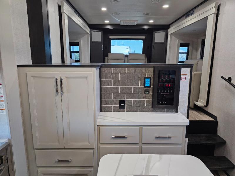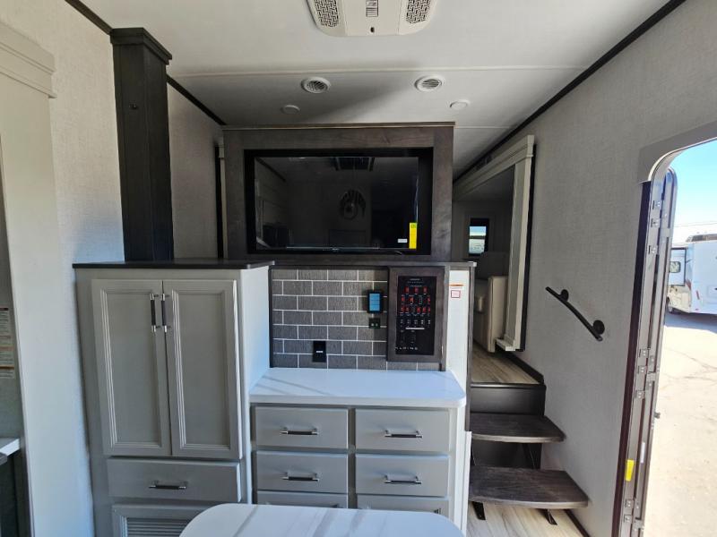 A full rear bathroom creates a master suite in this fifth wheel! The private bedroom has a king bed slide with storage underneath for extra blankets, a chest with a TV, and access to the full bathroom which has a dual sink vanity, a shower with a seat, and a closet with stackable washer and dryer prep. The half bathroom is by the kitchen so you can quickly get back to preparing your delicious meal with the three burner cooktop and kitchen island then enjoy your meals at the free standing dinette. The front living area has a front entertainment center with a 40" fireplace and 50" TV with overhead cabinets to store your movies, as well as opposing tri-fold sofa sleeper slides and Thomas Payne theater seating with heat, massage, LED lights, and a USB charging station.