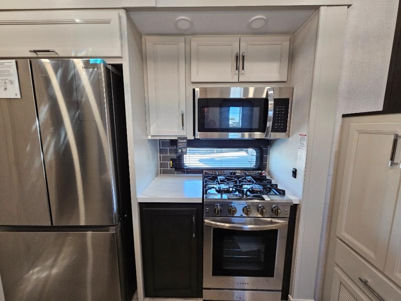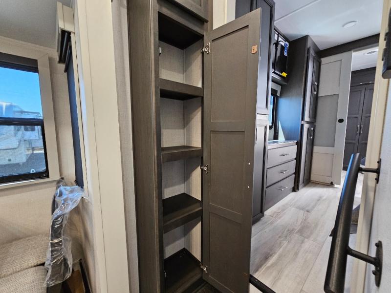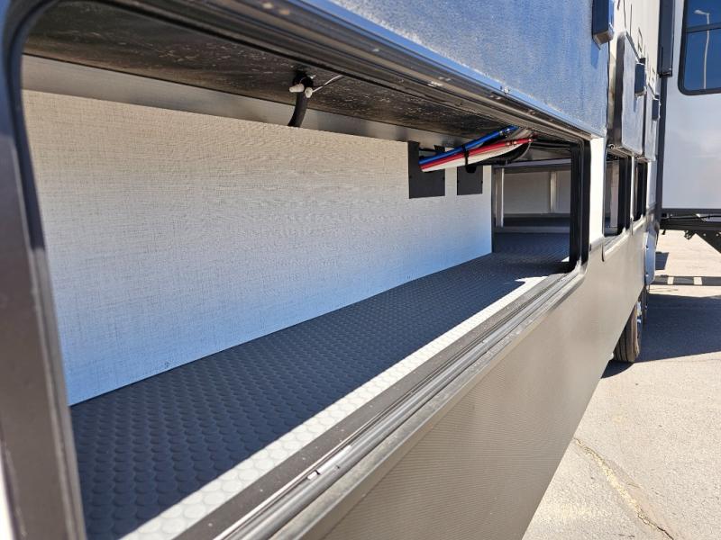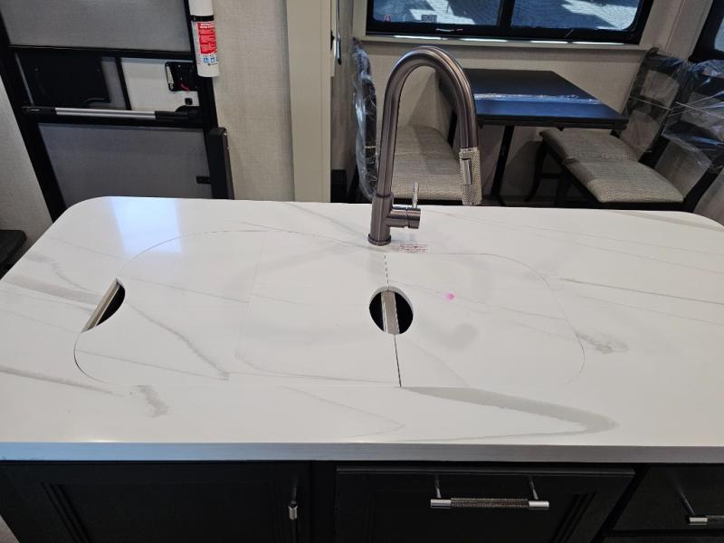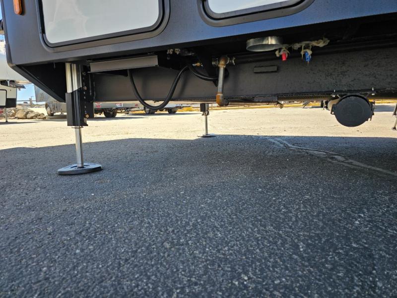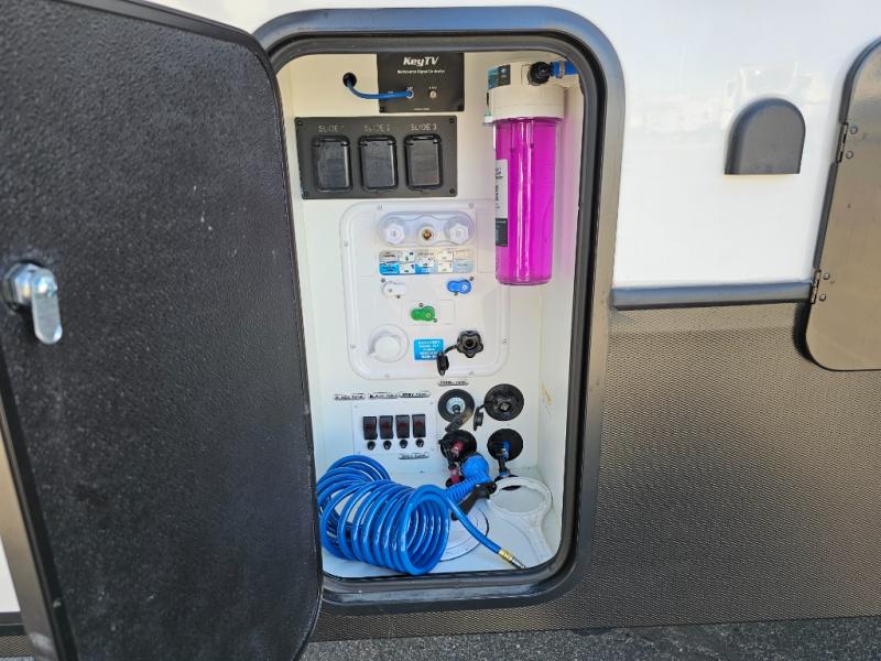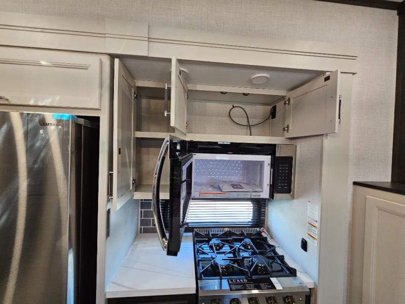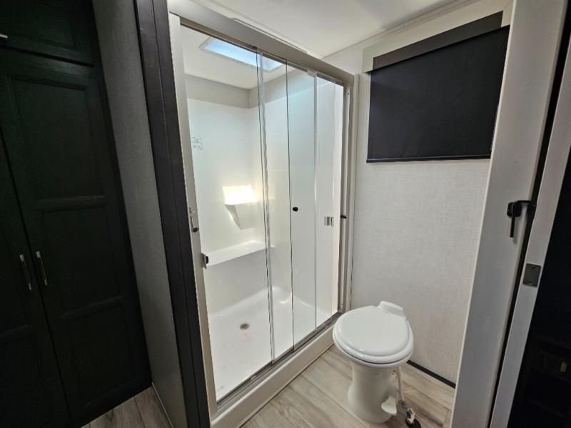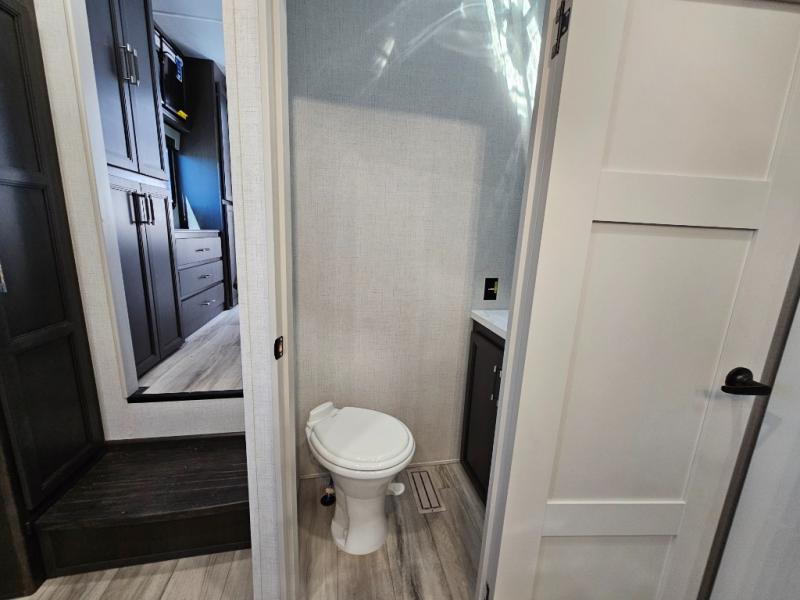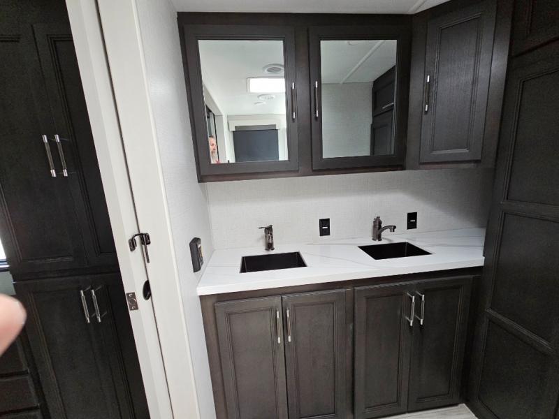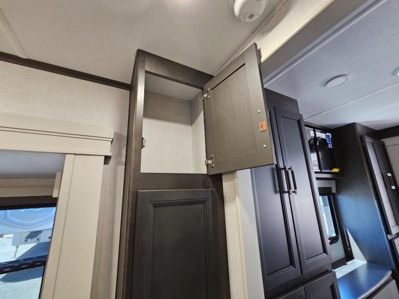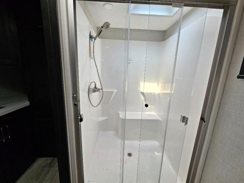 A full rear bathroom creates a master suite in this fifth wheel! The private bedroom has a king bed slide with storage underneath for extra blankets, a chest with a TV, and access to the full bathroom which has a dual sink vanity, a shower with a seat, and a closet with stackable washer and dryer prep. The half bathroom is by the kitchen so you can quickly get back to preparing your delicious meal with the three burner cooktop and kitchen island then enjoy your meals at the free standing dinette. The front living area has a front entertainment center with a 40" fireplace and 50" TV with overhead cabinets to store your movies, as well as opposing tri-fold sofa sleeper slides and Thomas Payne theater seating with heat, massage, LED lights, and a USB charging station.