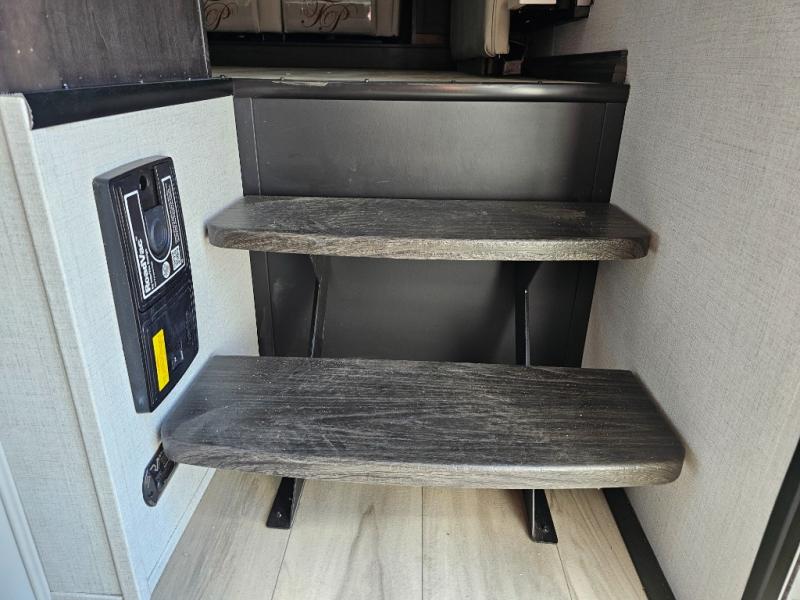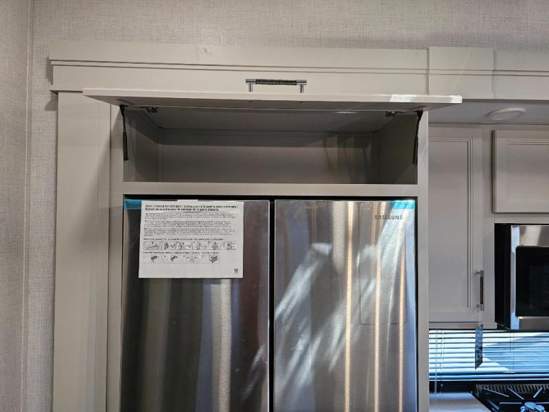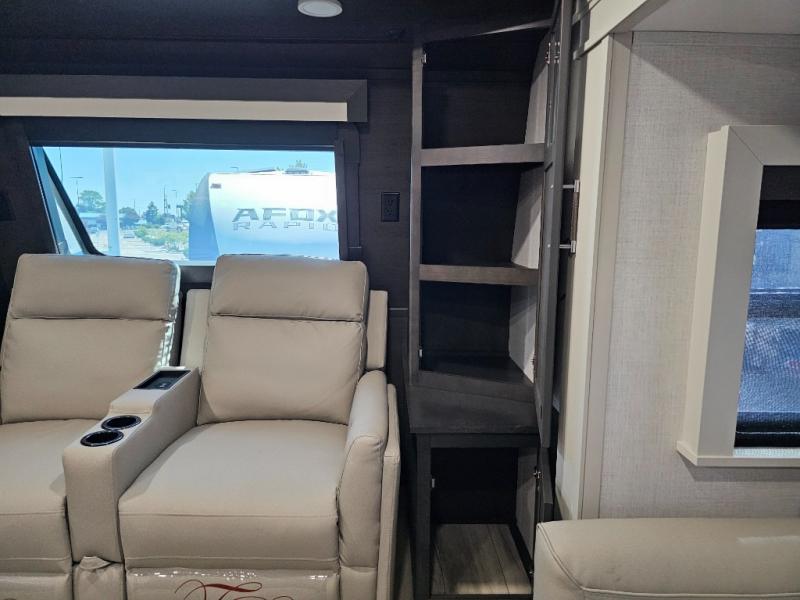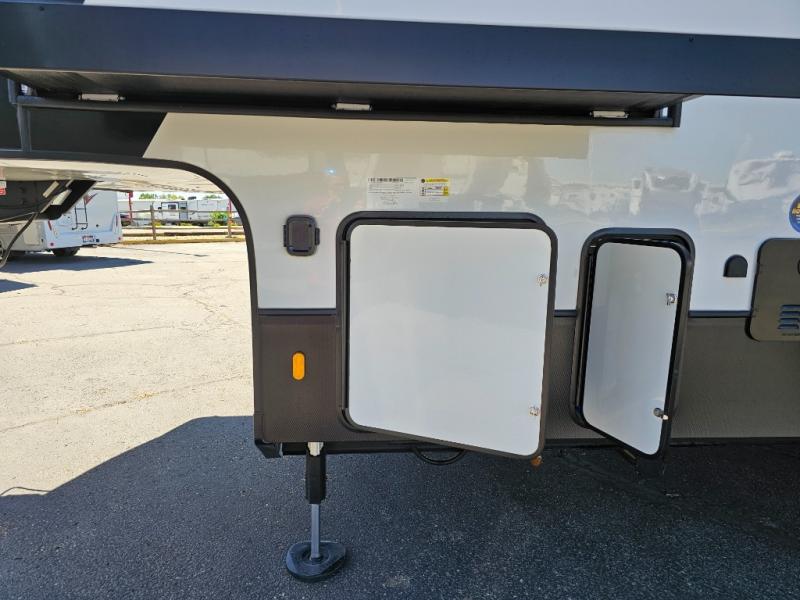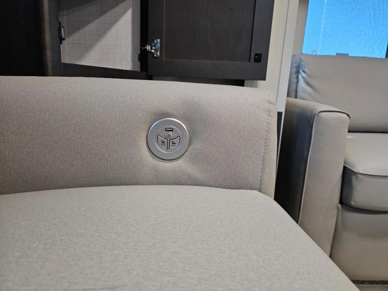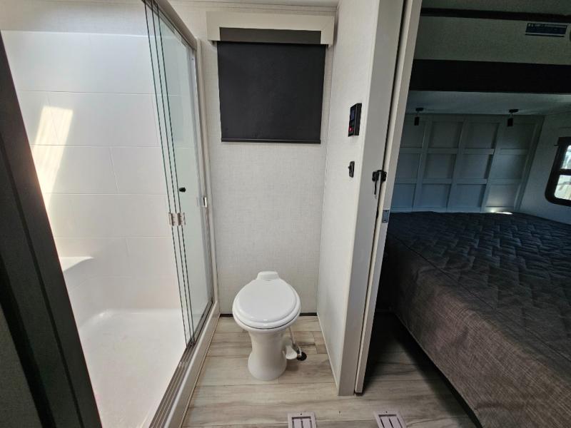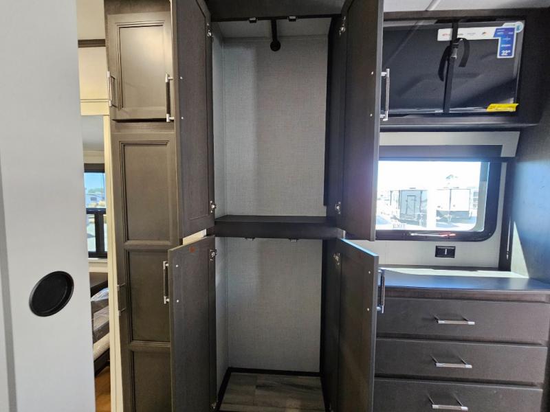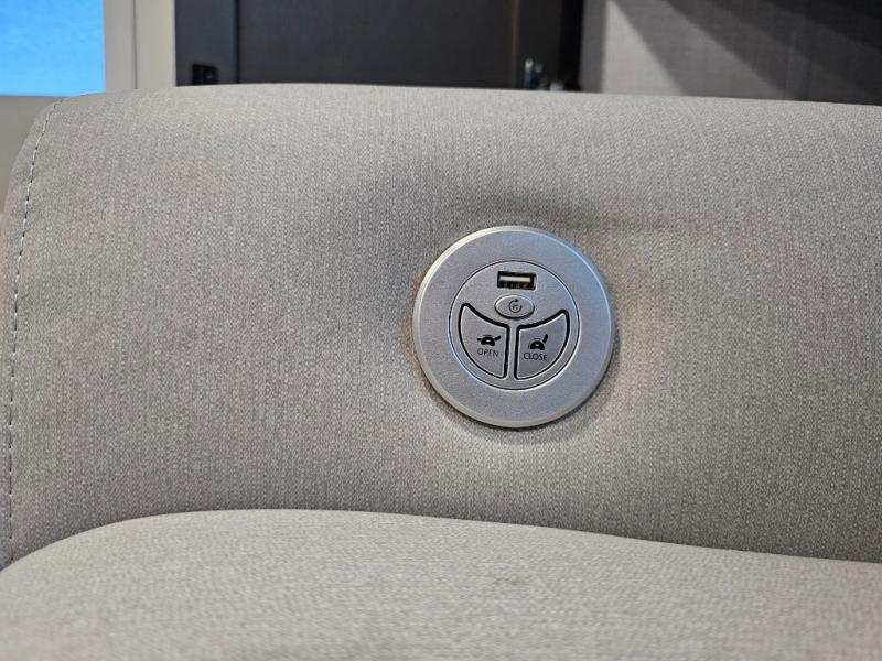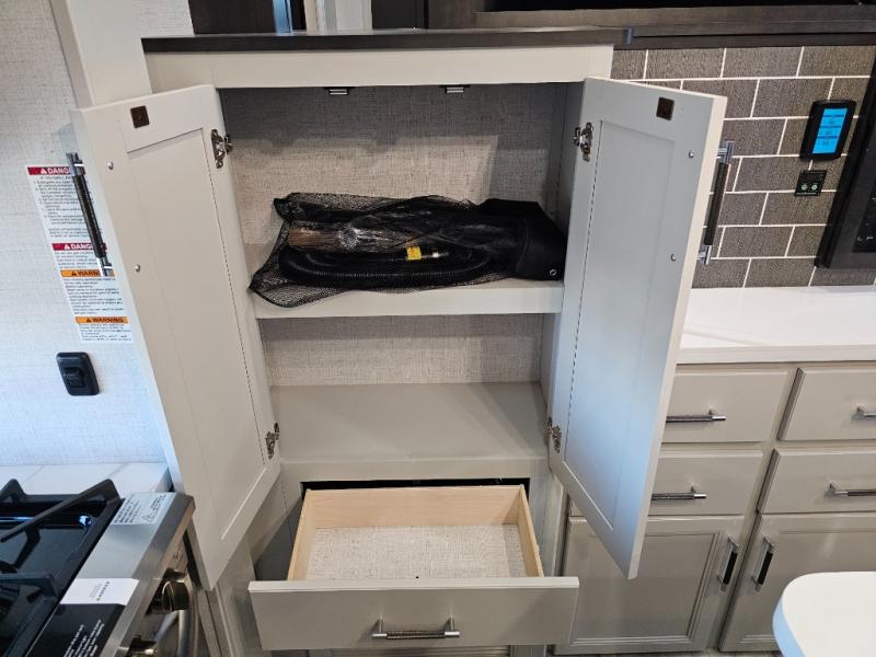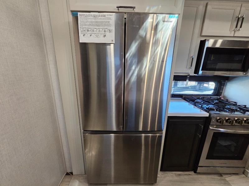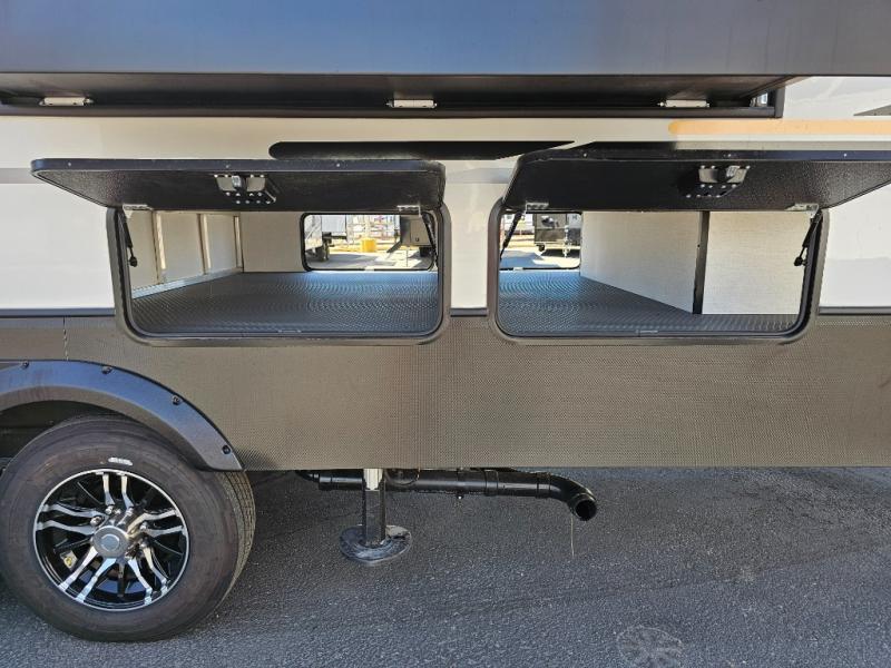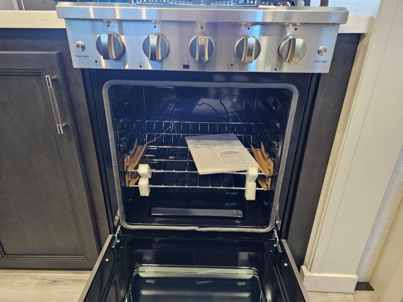 A full rear bathroom creates a master suite in this fifth wheel! The private bedroom has a king bed slide with storage underneath for extra blankets, a chest with a TV, and access to the full bathroom which has a dual sink vanity, a shower with a seat, and a closet with stackable washer and dryer prep. The half bathroom is by the kitchen so you can quickly get back to preparing your delicious meal with the three burner cooktop and kitchen island then enjoy your meals at the free standing dinette. The front living area has a front entertainment center with a 40" fireplace and 50" TV with overhead cabinets to store your movies, as well as opposing tri-fold sofa sleeper slides and Thomas Payne theater seating with heat, massage, LED lights, and a USB charging station.