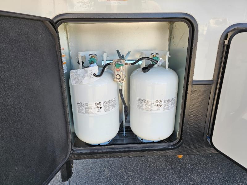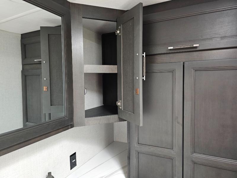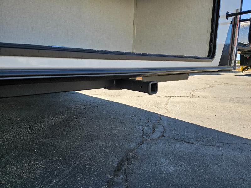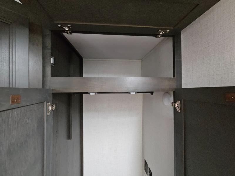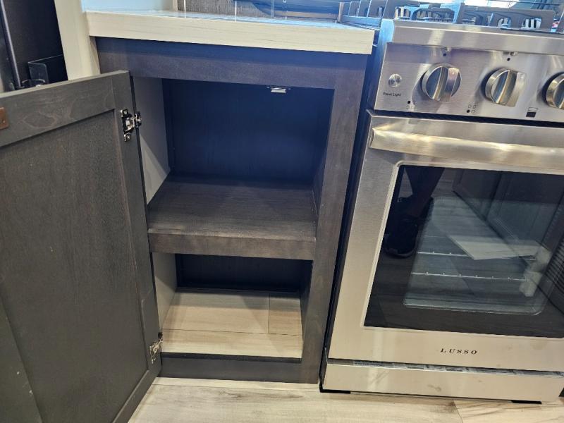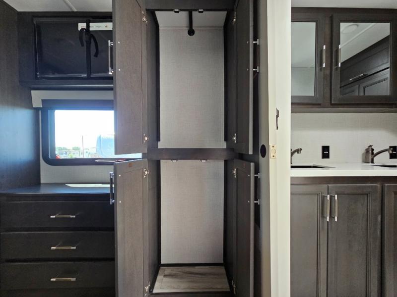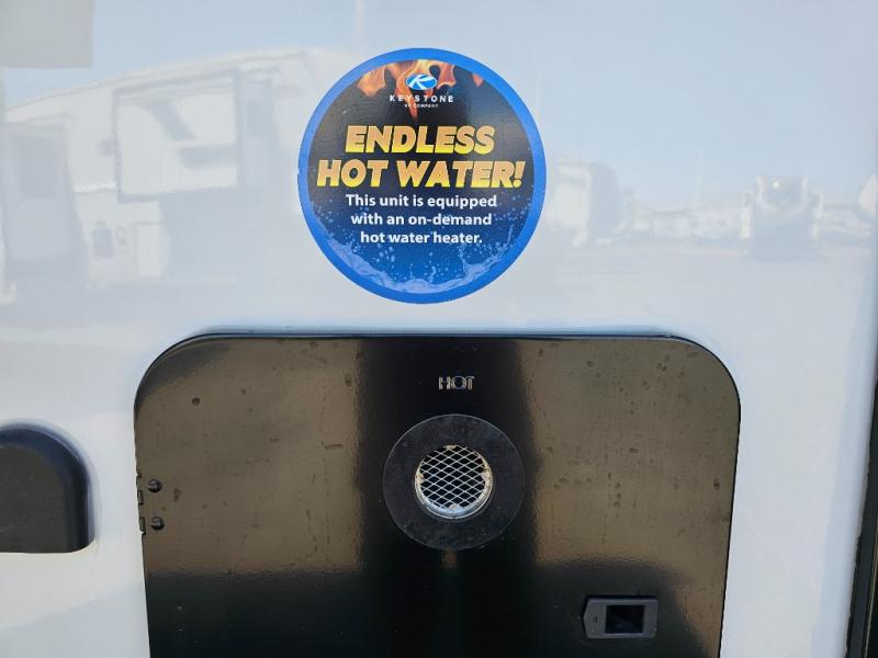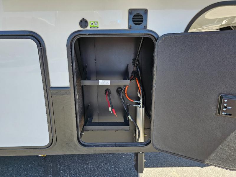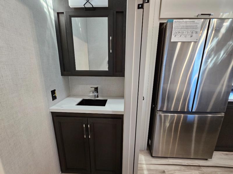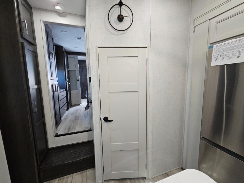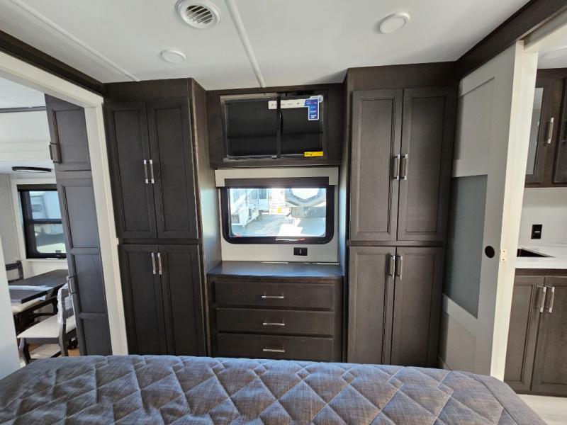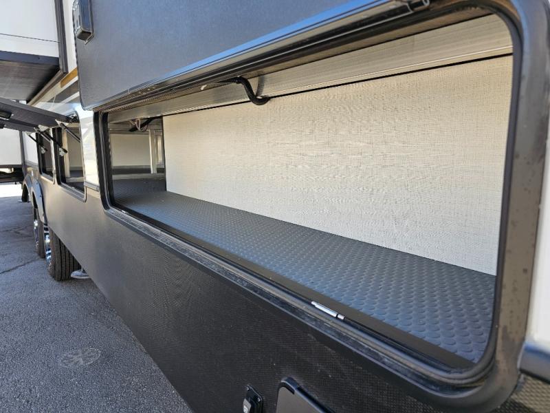 A full rear bathroom creates a master suite in this fifth wheel! The private bedroom has a king bed slide with storage underneath for extra blankets, a chest with a TV, and access to the full bathroom which has a dual sink vanity, a shower with a seat, and a closet with stackable washer and dryer prep. The half bathroom is by the kitchen so you can quickly get back to preparing your delicious meal with the three burner cooktop and kitchen island then enjoy your meals at the free standing dinette. The front living area has a front entertainment center with a 40" fireplace and 50" TV with overhead cabinets to store your movies, as well as opposing tri-fold sofa sleeper slides and Thomas Payne theater seating with heat, massage, LED lights, and a USB charging station.