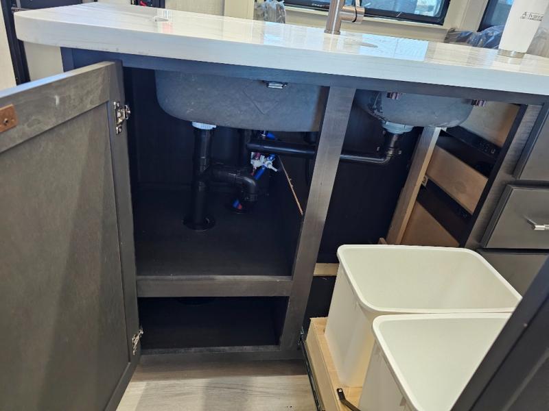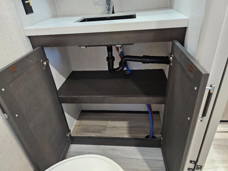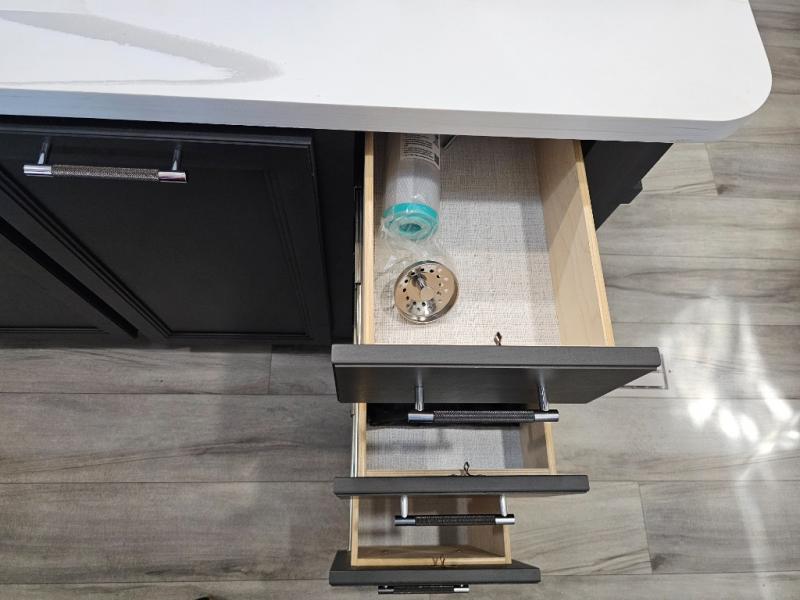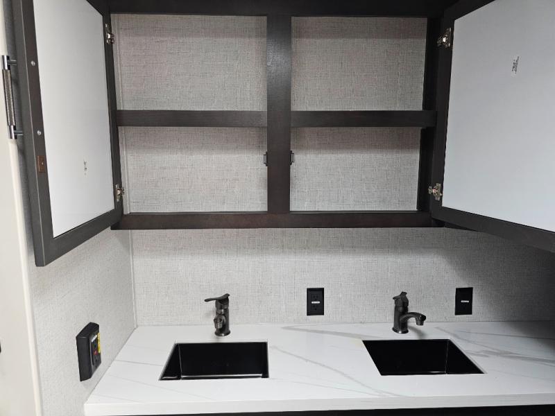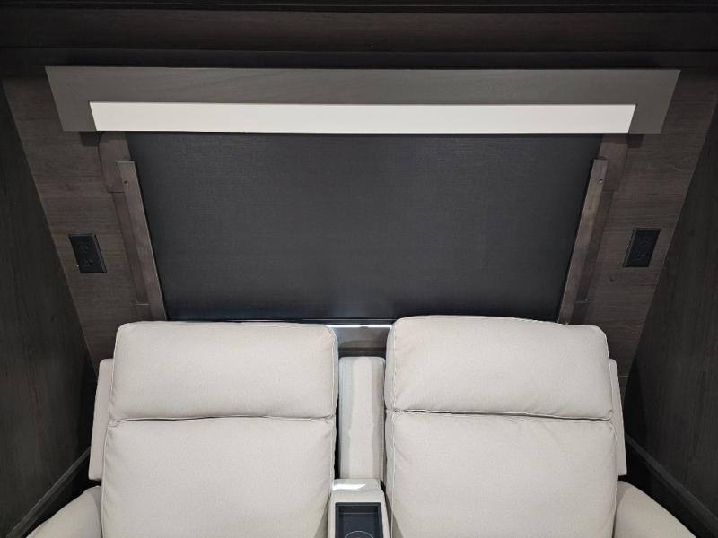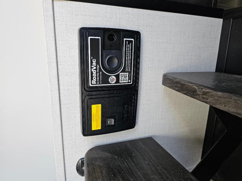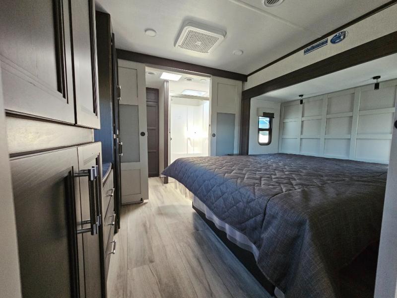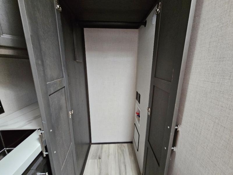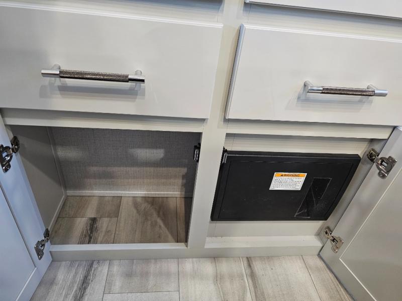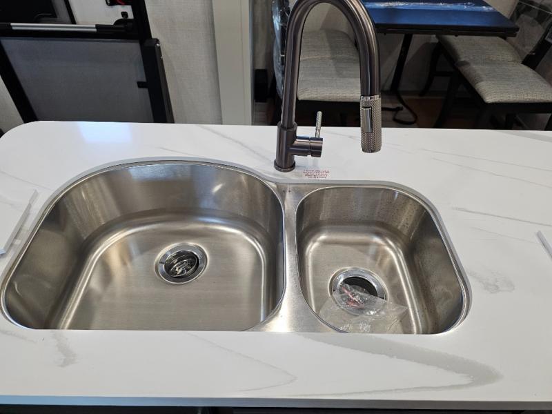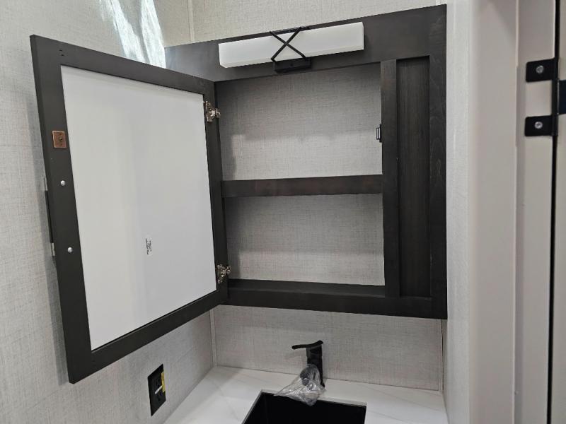 A full rear bathroom creates a master suite in this fifth wheel! The private bedroom has a king bed slide with storage underneath for extra blankets, a chest with a TV, and access to the full bathroom which has a dual sink vanity, a shower with a seat, and a closet with stackable washer and dryer prep. The half bathroom is by the kitchen so you can quickly get back to preparing your delicious meal with the three burner cooktop and kitchen island then enjoy your meals at the free standing dinette. The front living area has a front entertainment center with a 40" fireplace and 50" TV with overhead cabinets to store your movies, as well as opposing tri-fold sofa sleeper slides and Thomas Payne theater seating with heat, massage, LED lights, and a USB charging station.