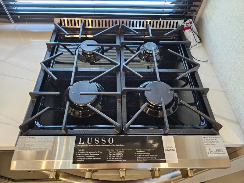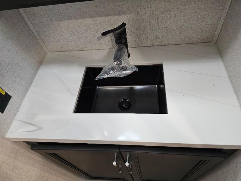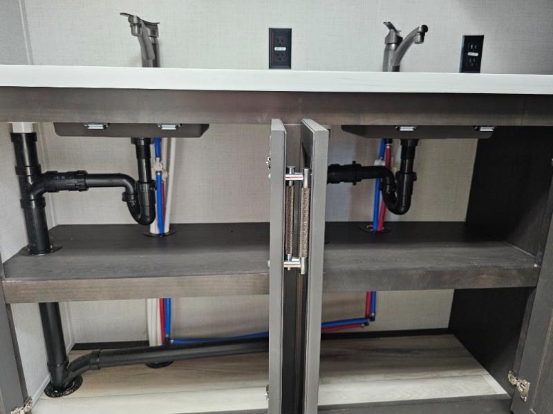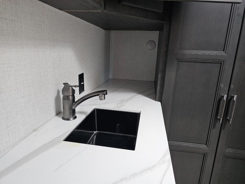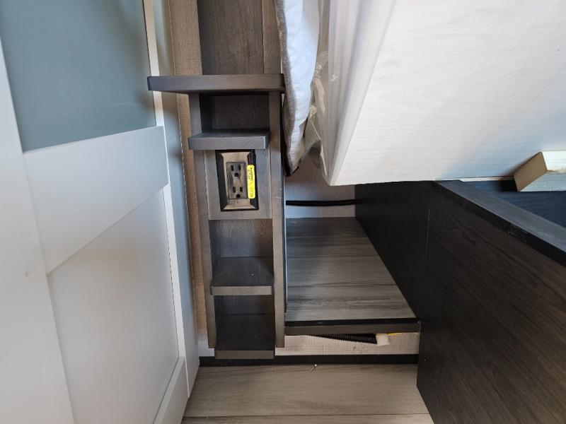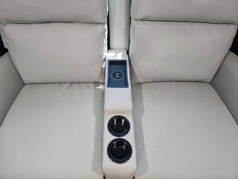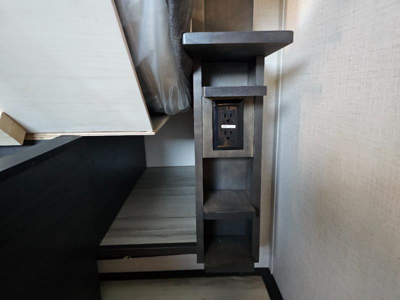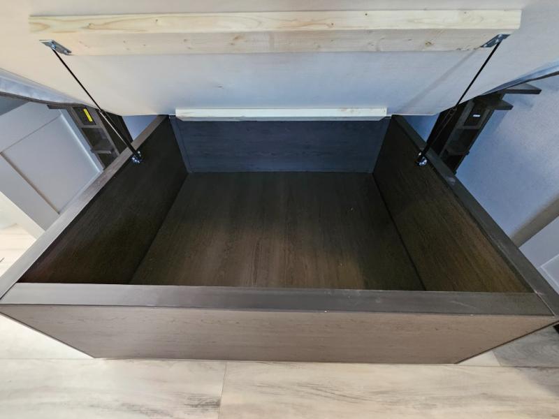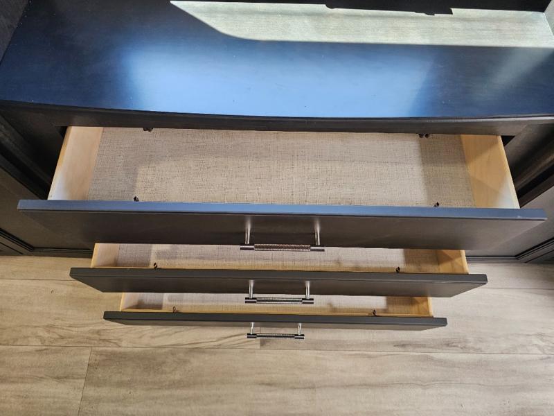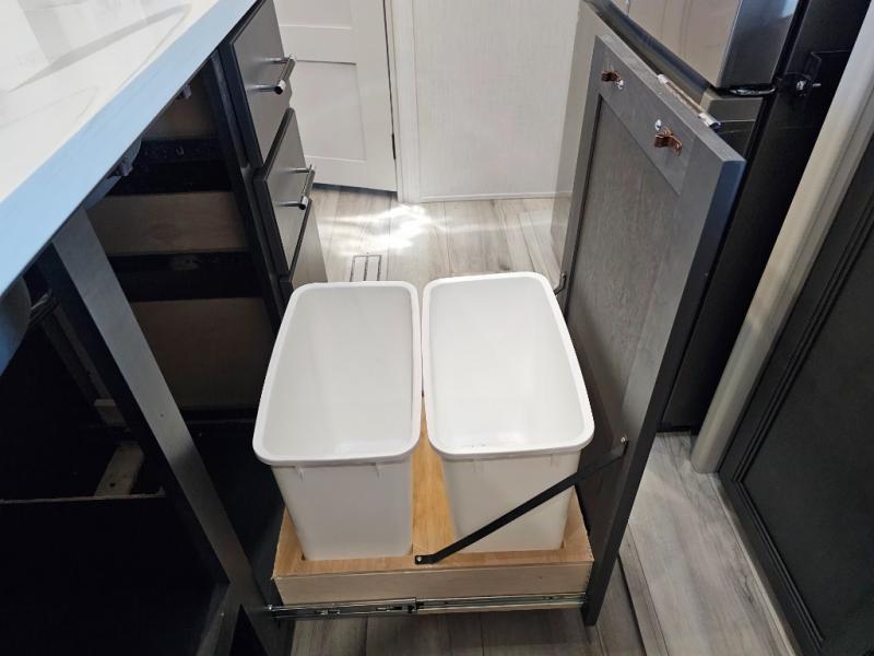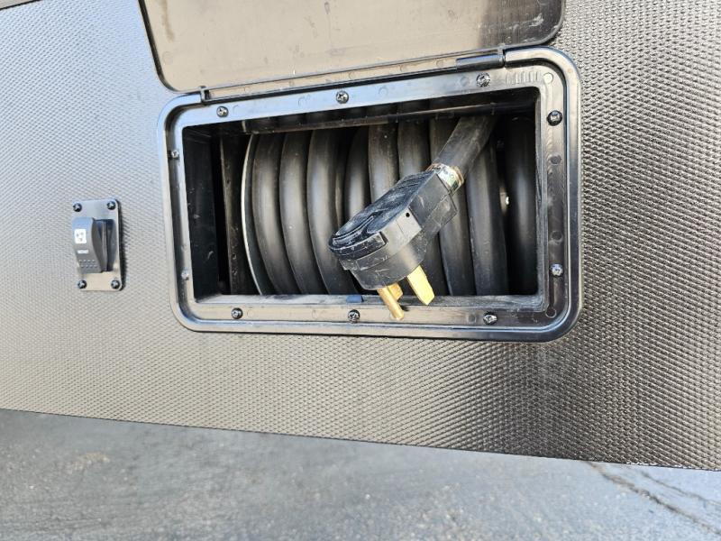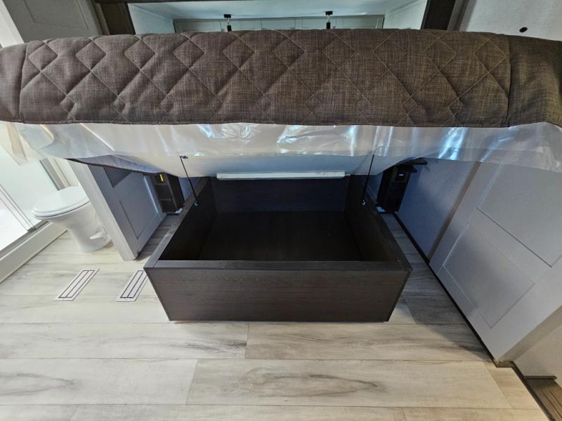 A full rear bathroom creates a master suite in this fifth wheel! The private bedroom has a king bed slide with storage underneath for extra blankets, a chest with a TV, and access to the full bathroom which has a dual sink vanity, a shower with a seat, and a closet with stackable washer and dryer prep. The half bathroom is by the kitchen so you can quickly get back to preparing your delicious meal with the three burner cooktop and kitchen island then enjoy your meals at the free standing dinette. The front living area has a front entertainment center with a 40" fireplace and 50" TV with overhead cabinets to store your movies, as well as opposing tri-fold sofa sleeper slides and Thomas Payne theater seating with heat, massage, LED lights, and a USB charging station.