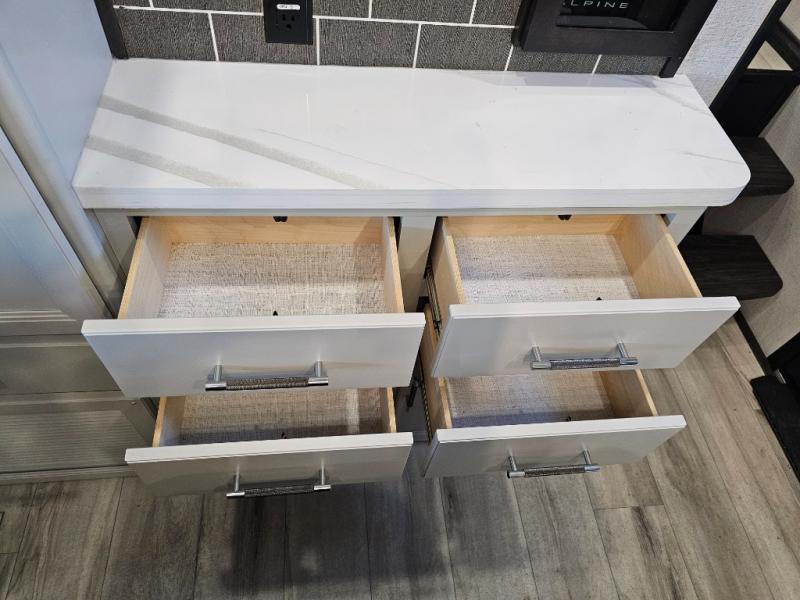 Luxury is not an option, it is a standard with each one of these Keystone RV Alpine fifth wheels! A 8' 4" wide body construction will create an open, residential feeling, and cutting-edge technology will provide a hassle-free camping experience. The Tru-Fit slide construction is more durable and minimizes motor structural stress, as well as resists leaking, and the Blade Pure airflow system provides residential comfort with its high-performance. Each fifth wheel includes designer flooring throughout, stunning solid wood cabinet doors, luxurious crown molding, and solid surface countertops in the kitchen. The exterior also includes an outside shower with hot and cold water, Lippert strut assisted SolidSteps, Hitch Vision with LED lighting, and many more conveniences!