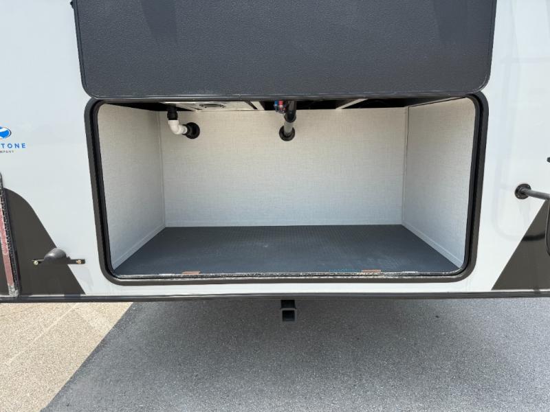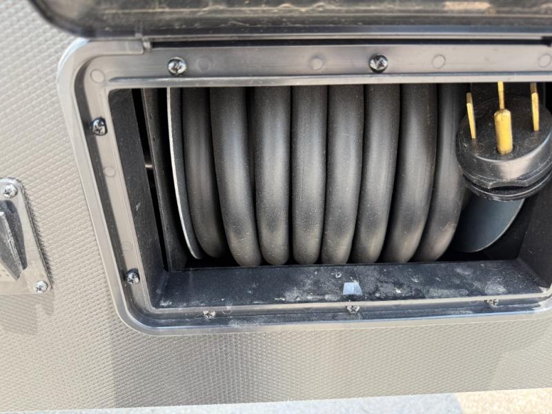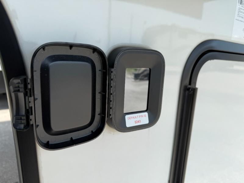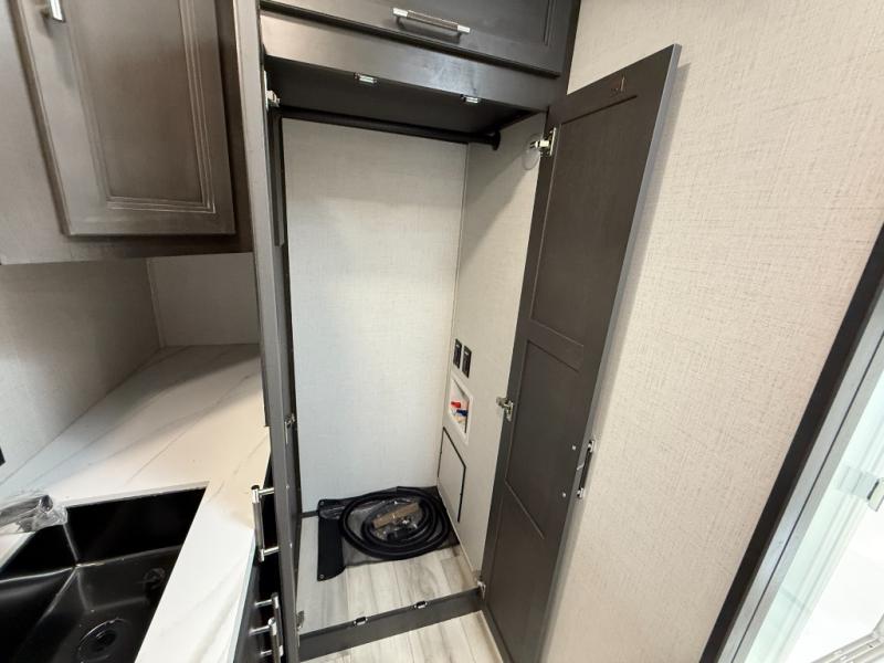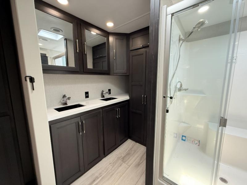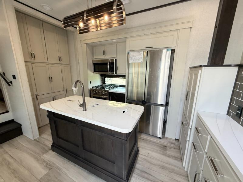 This fifth wheel is decked out in luxuries! The full rear bathroom has a walk-in shower to freshen up in each morning, a dual sink vanity for two to get ready at once, and an area prepped to add an optional washer and dryer. You will enjoy a good night's rest on the king bed slide inside the private bedroom and others can sleep on the opposing tri-fold sofa sleeper slides once they are converted. There are two kitchen pantries to hold everyone's favorite snacks, one of which is a walk-in pantry. The 18 cu. ft. residential refrigerator will keep your perishables fresh and you also have the option to switch it out for a 20 cu. ft. 12V refrigerator instead. The front living area has a front entertainment center with a 40" fireplace and a 50" TV, plus there is Thomas Payne theater seating with massage, heat, LED lights, and a USB charging station to keep your electronics charged while you relax!