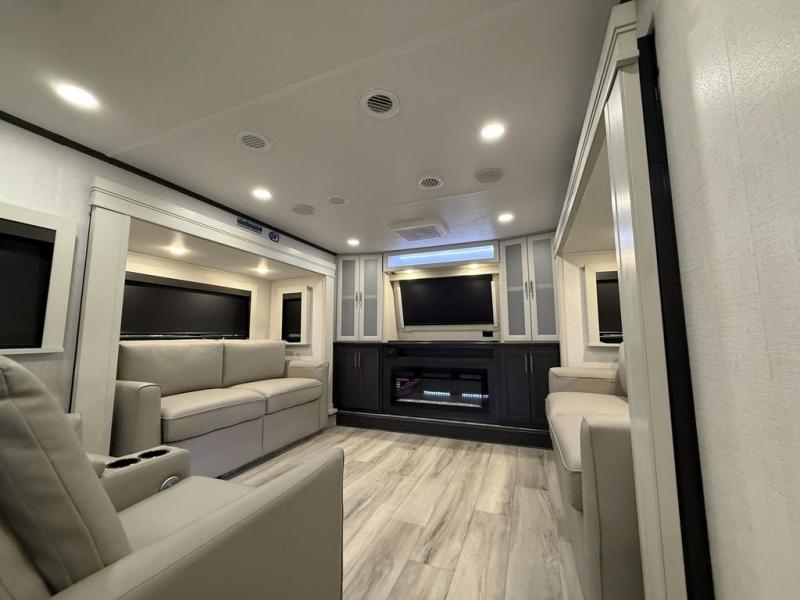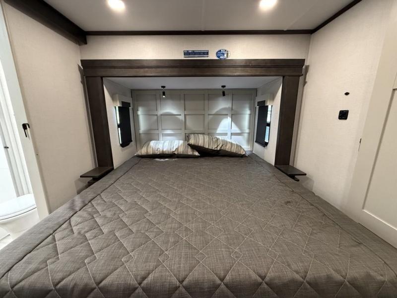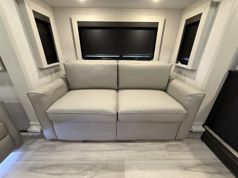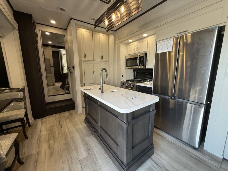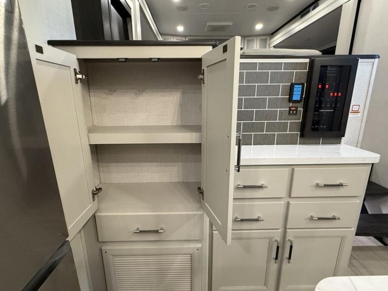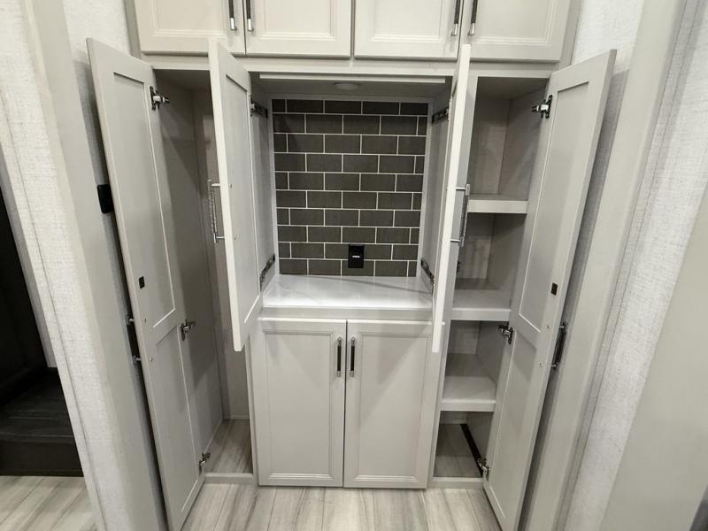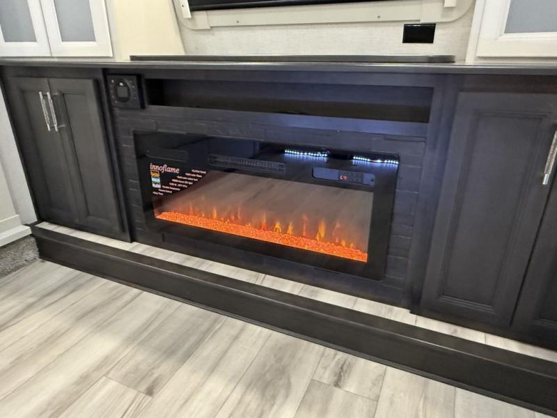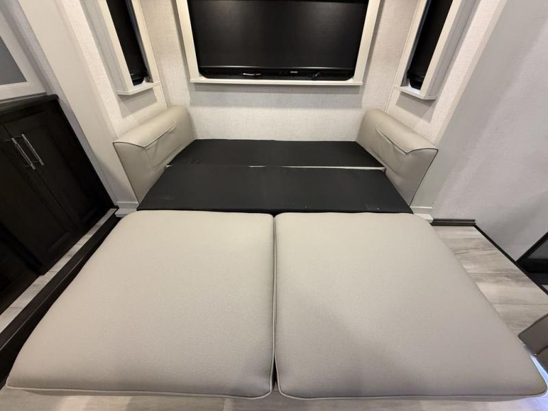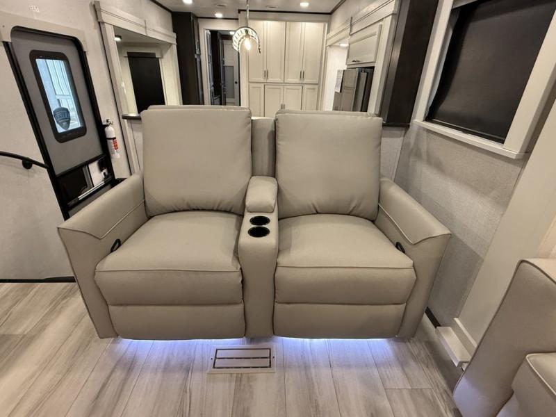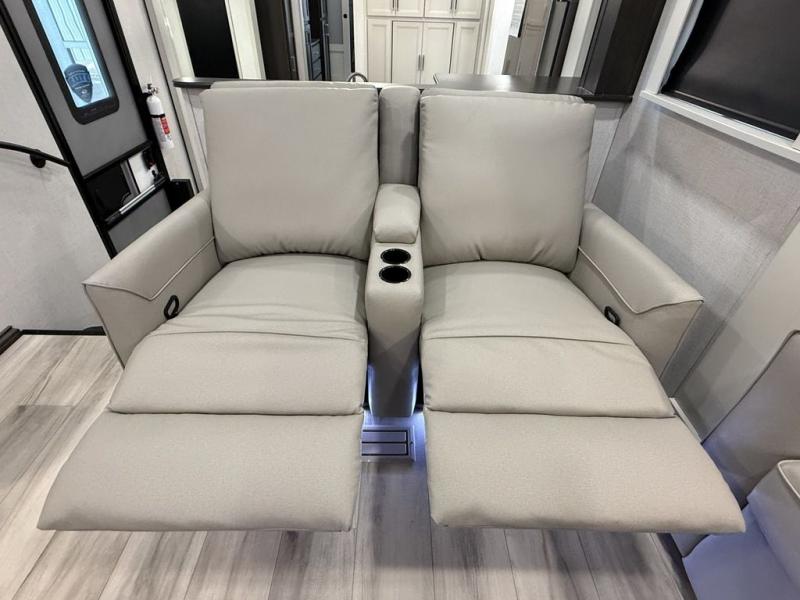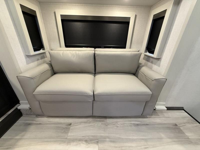 This fifth wheel is decked out in luxuries! The full rear bathroom has a walk-in shower to freshen up in each morning, a dual sink vanity for two to get ready at once, and an area prepped to add an optional washer and dryer. You will enjoy a good night's rest on the king bed slide inside the private bedroom and others can sleep on the opposing tri-fold sofa sleeper slides once they are converted. There are two kitchen pantries to hold everyone's favorite snacks, one of which is a walk-in pantry. The 18 cu. ft. residential refrigerator will keep your perishables fresh and you also have the option to switch it out for a 20 cu. ft. 12V refrigerator instead. The front living area has a front entertainment center with a 40" fireplace and a 50" TV, plus there is Thomas Payne theater seating with massage, heat, LED lights, and a USB charging station to keep your electronics charged while you relax!