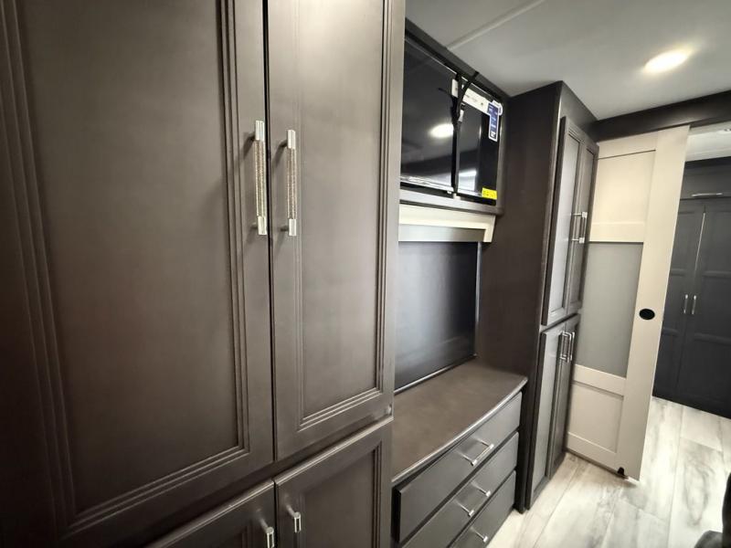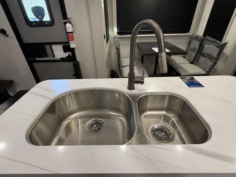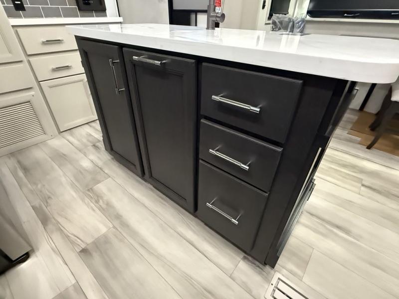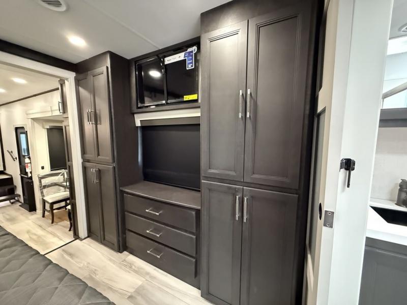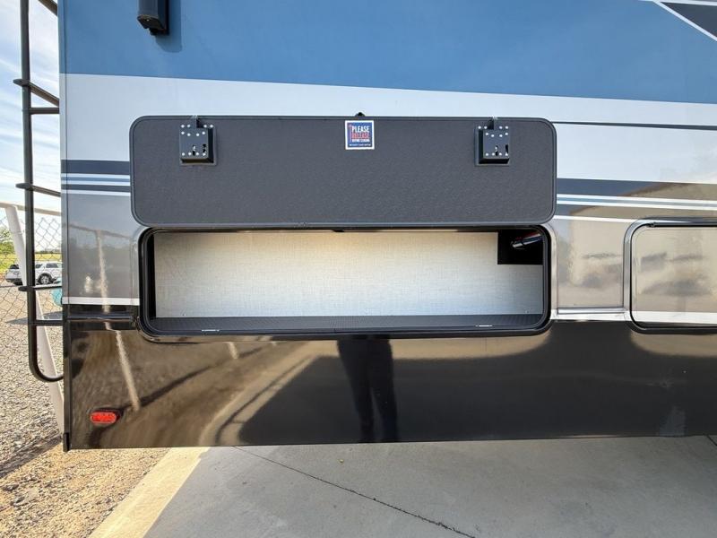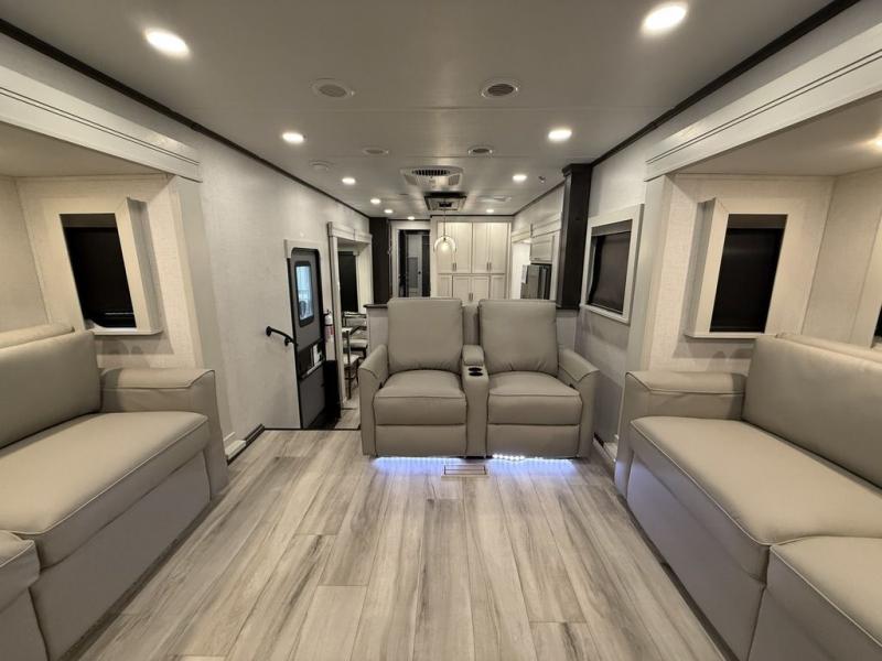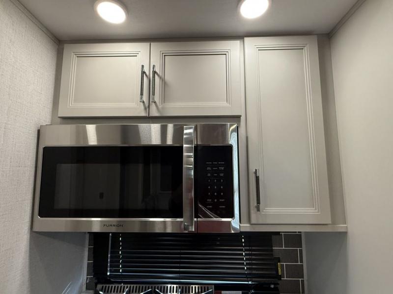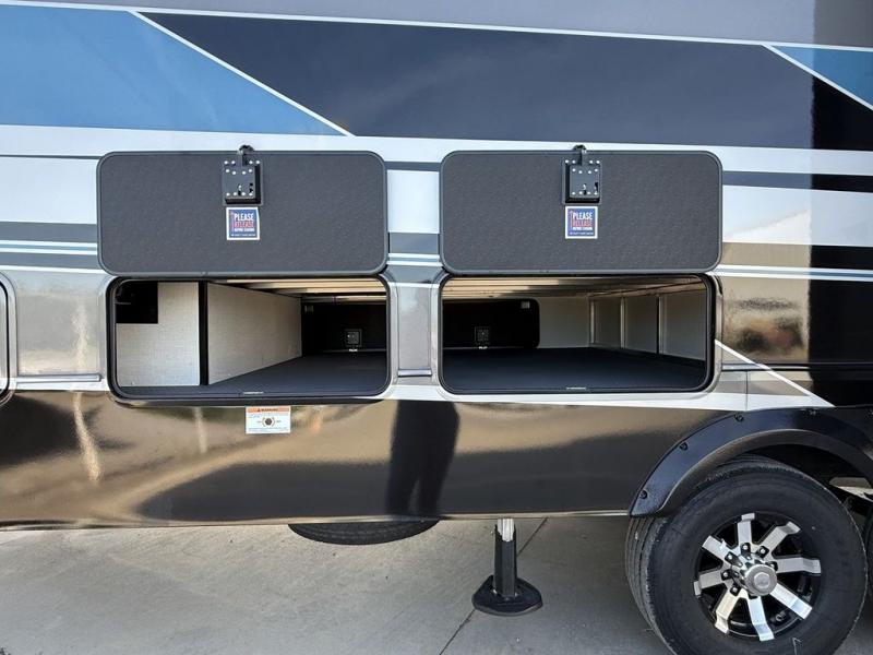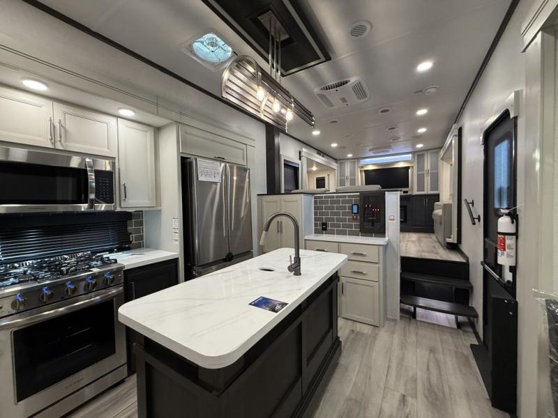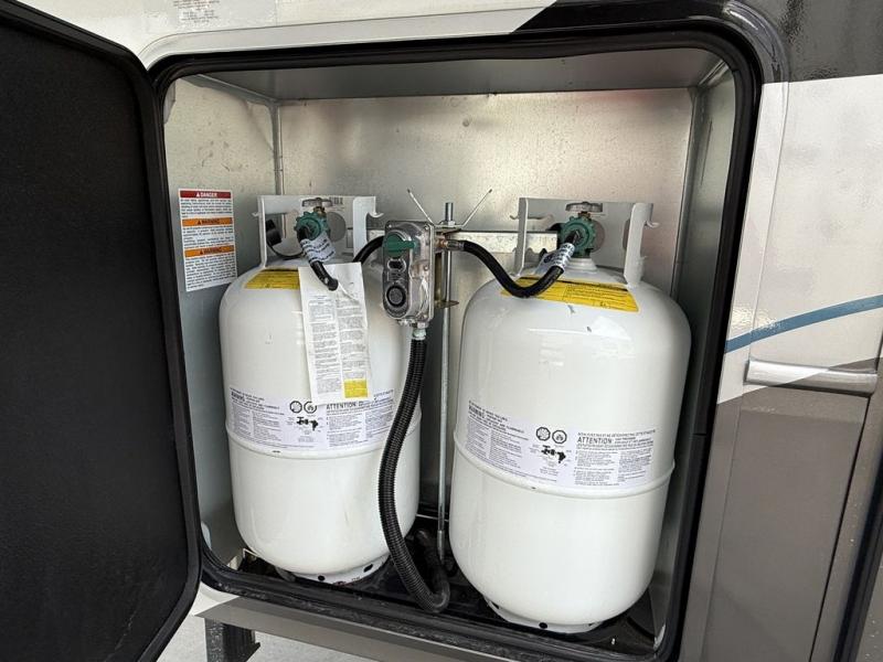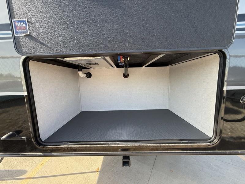 This fifth wheel is decked out in luxuries! The full rear bathroom has a walk-in shower to freshen up in each morning, a dual sink vanity for two to get ready at once, and an area prepped to add an optional washer and dryer. You will enjoy a good night's rest on the king bed slide inside the private bedroom and others can sleep on the opposing tri-fold sofa sleeper slides once they are converted. There are two kitchen pantries to hold everyone's favorite snacks, one of which is a walk-in pantry. The 18 cu. ft. residential refrigerator will keep your perishables fresh and you also have the option to switch it out for a 20 cu. ft. 12V refrigerator instead. The front living area has a front entertainment center with a 40" fireplace and a 50" TV, plus there is Thomas Payne theater seating with massage, heat, LED lights, and a USB charging station to keep your electronics charged while you relax!