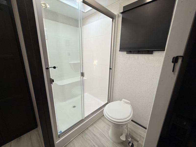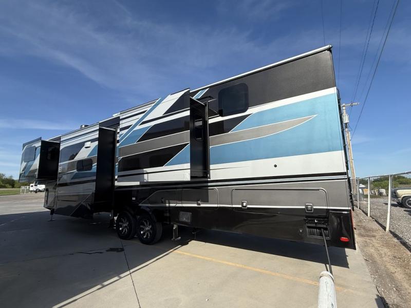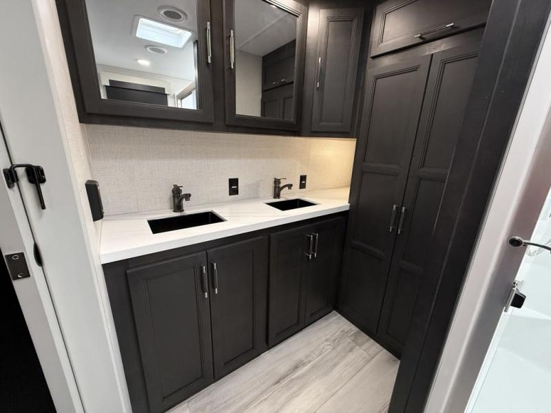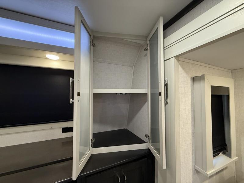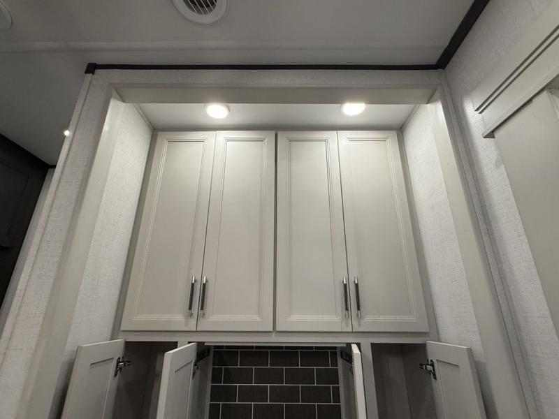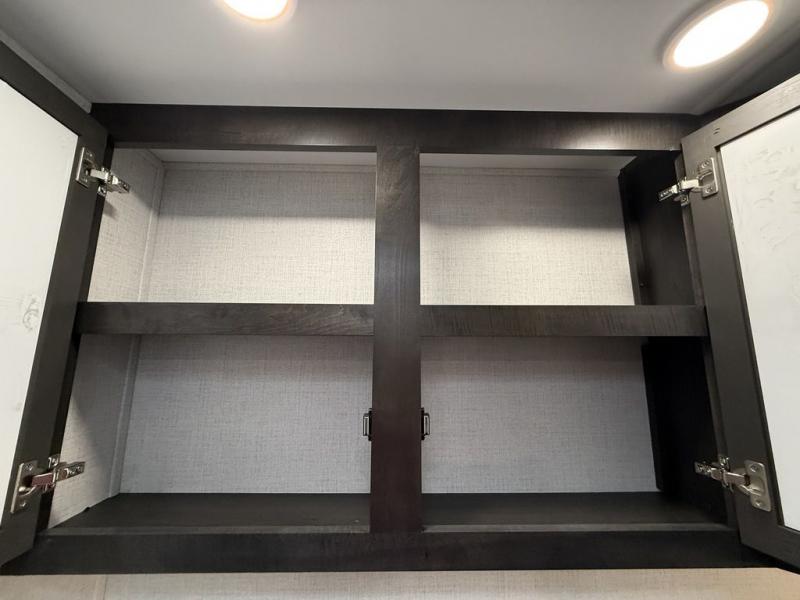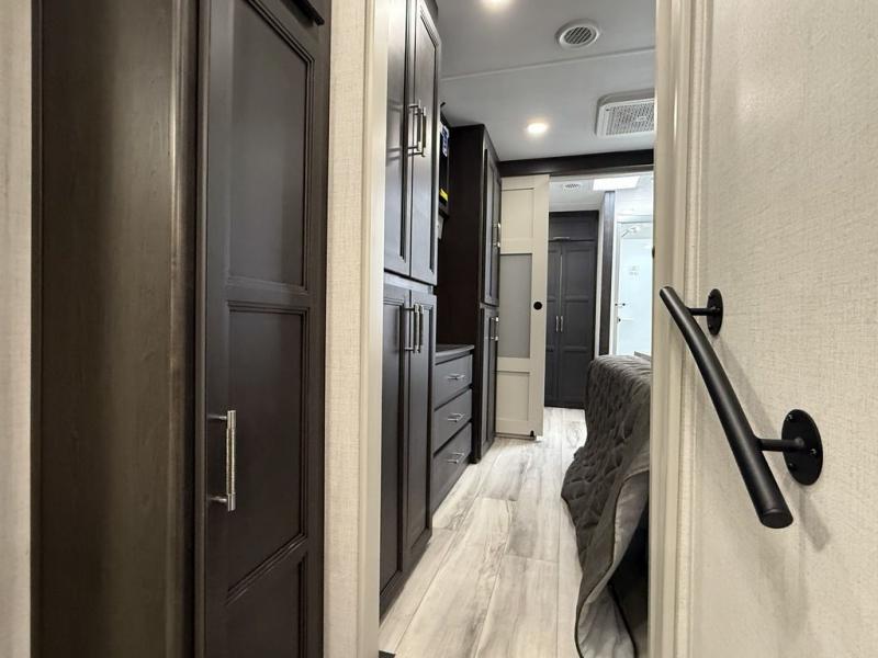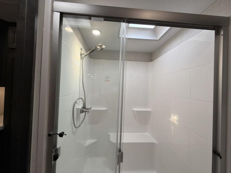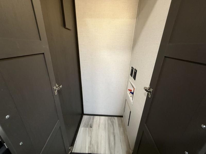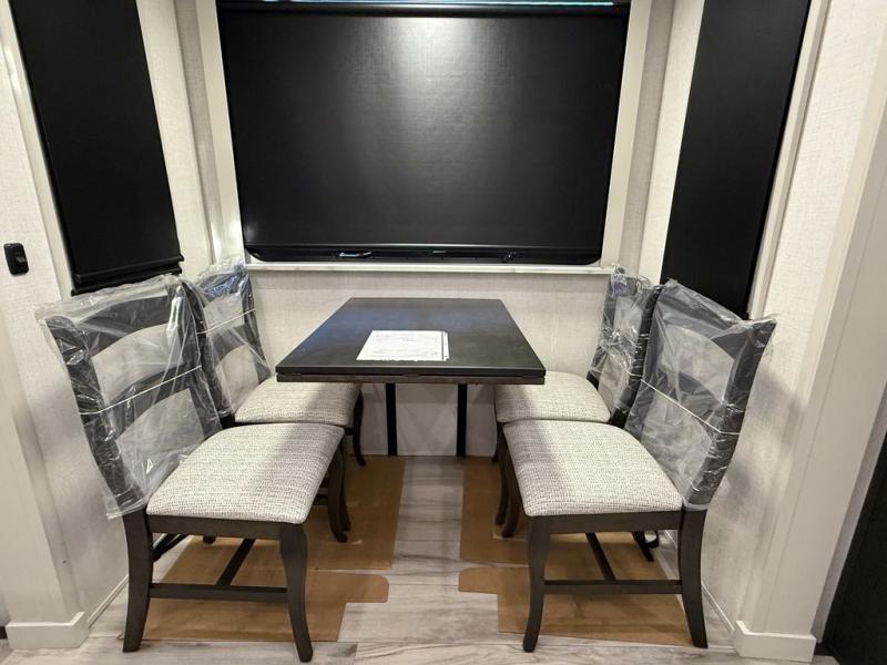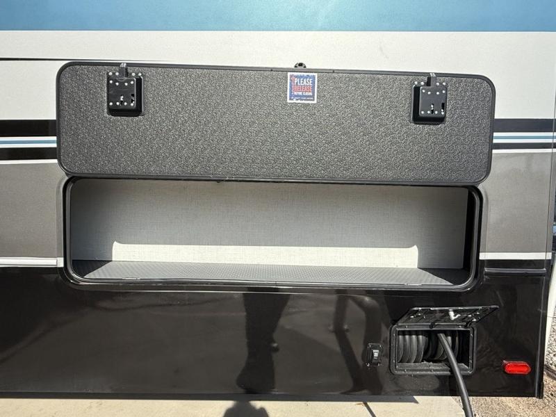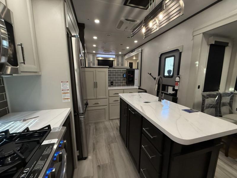 This fifth wheel is decked out in luxuries! The full rear bathroom has a walk-in shower to freshen up in each morning, a dual sink vanity for two to get ready at once, and an area prepped to add an optional washer and dryer. You will enjoy a good night's rest on the king bed slide inside the private bedroom and others can sleep on the opposing tri-fold sofa sleeper slides once they are converted. There are two kitchen pantries to hold everyone's favorite snacks, one of which is a walk-in pantry. The 18 cu. ft. residential refrigerator will keep your perishables fresh and you also have the option to switch it out for a 20 cu. ft. 12V refrigerator instead. The front living area has a front entertainment center with a 40" fireplace and a 50" TV, plus there is Thomas Payne theater seating with massage, heat, LED lights, and a USB charging station to keep your electronics charged while you relax!
