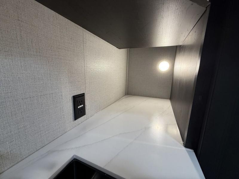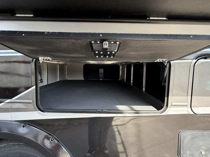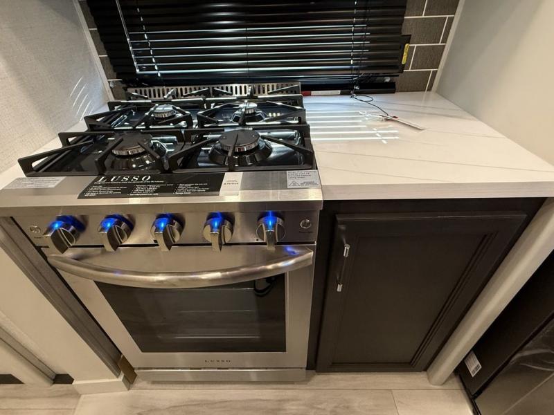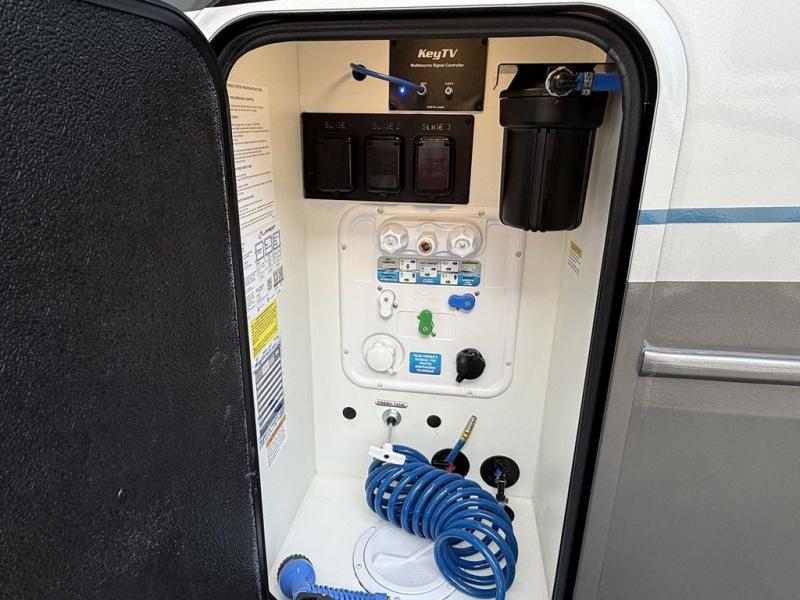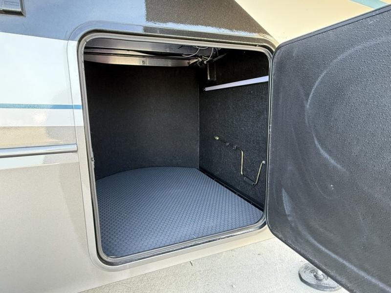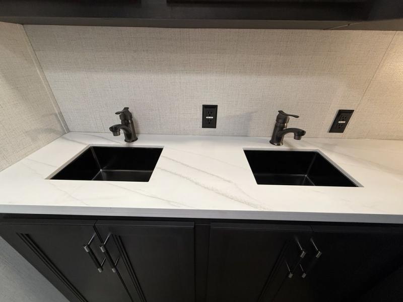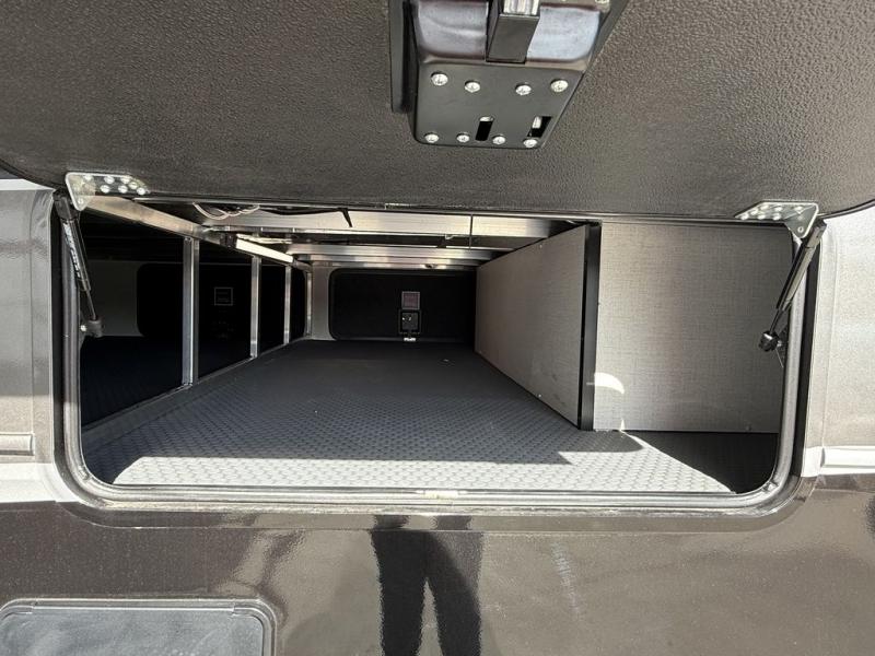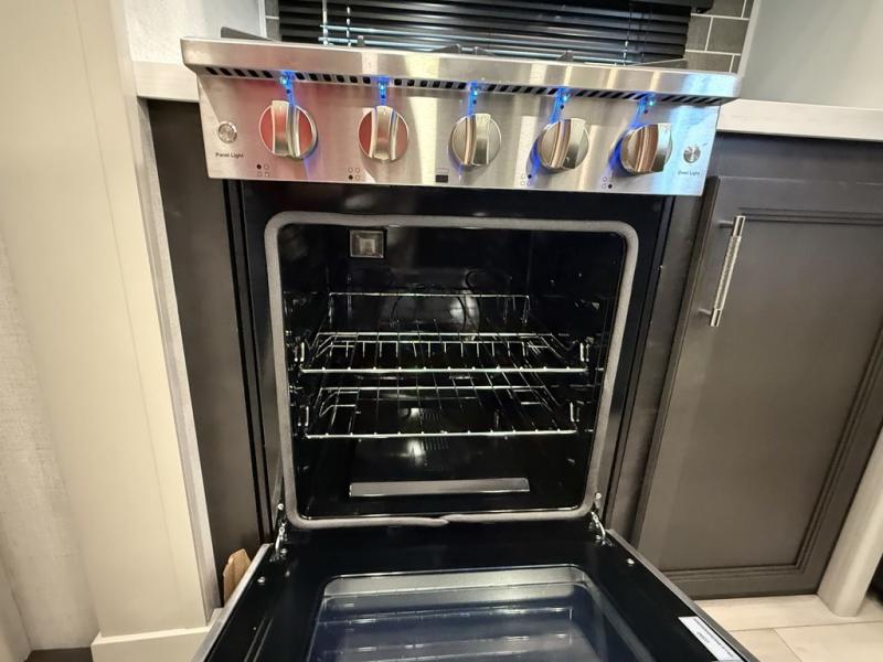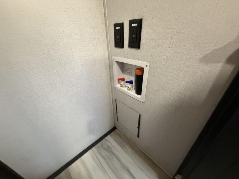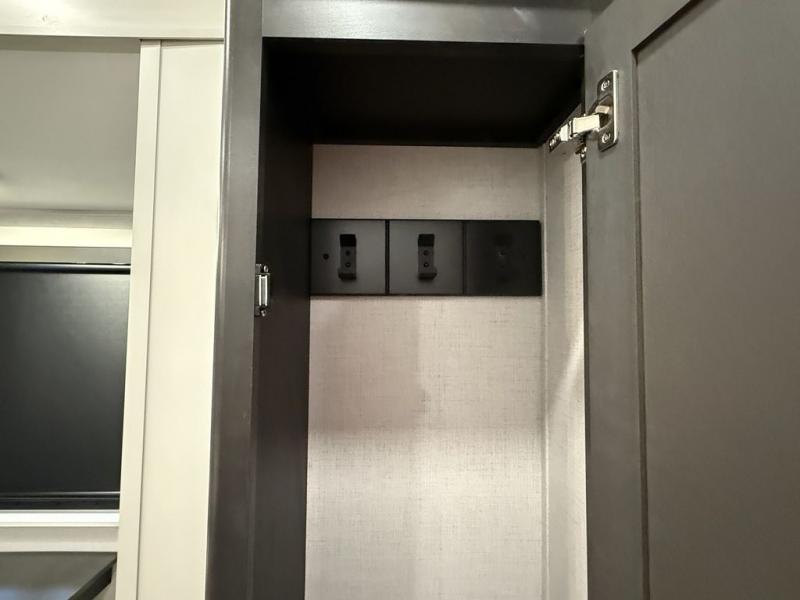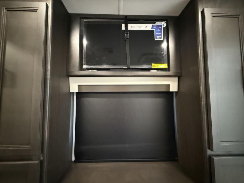 This fifth wheel is decked out in luxuries! The full rear bathroom has a walk-in shower to freshen up in each morning, a dual sink vanity for two to get ready at once, and an area prepped to add an optional washer and dryer. You will enjoy a good night's rest on the king bed slide inside the private bedroom and others can sleep on the opposing tri-fold sofa sleeper slides once they are converted. There are two kitchen pantries to hold everyone's favorite snacks, one of which is a walk-in pantry. The 18 cu. ft. residential refrigerator will keep your perishables fresh and you also have the option to switch it out for a 20 cu. ft. 12V refrigerator instead. The front living area has a front entertainment center with a 40" fireplace and a 50" TV, plus there is Thomas Payne theater seating with massage, heat, LED lights, and a USB charging station to keep your electronics charged while you relax!
