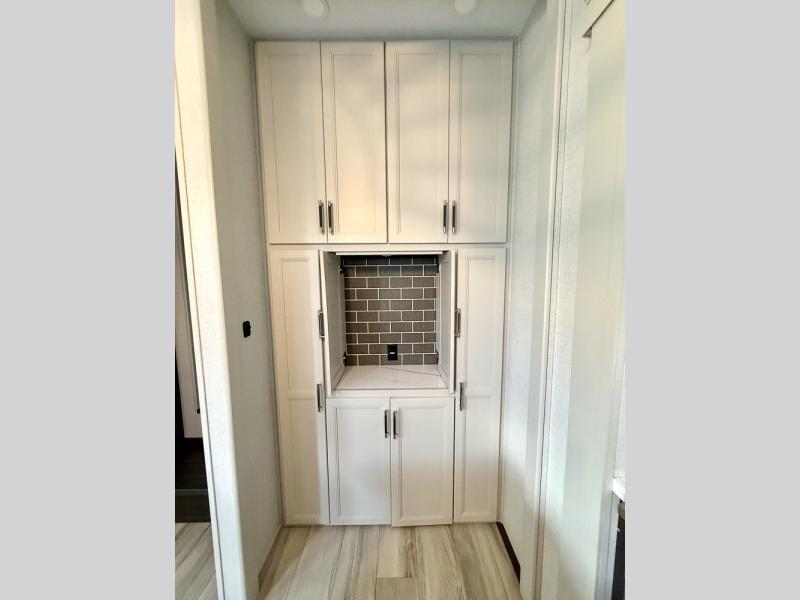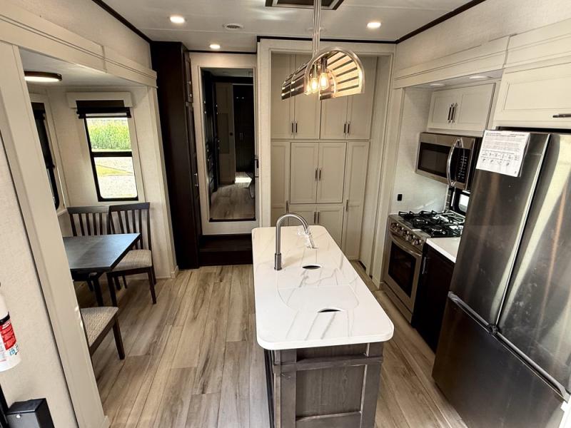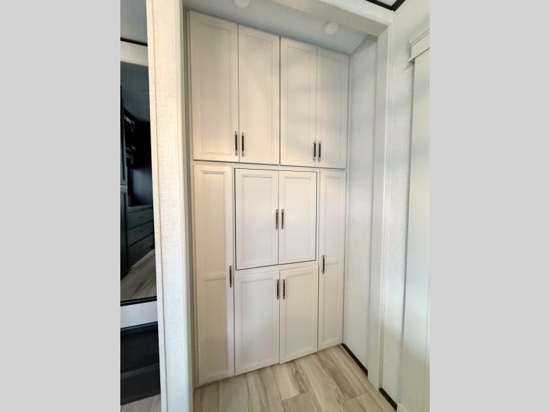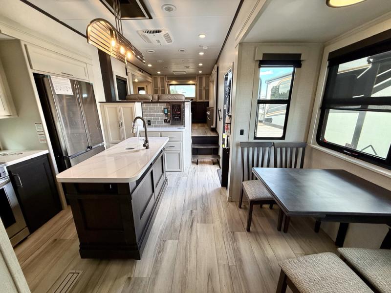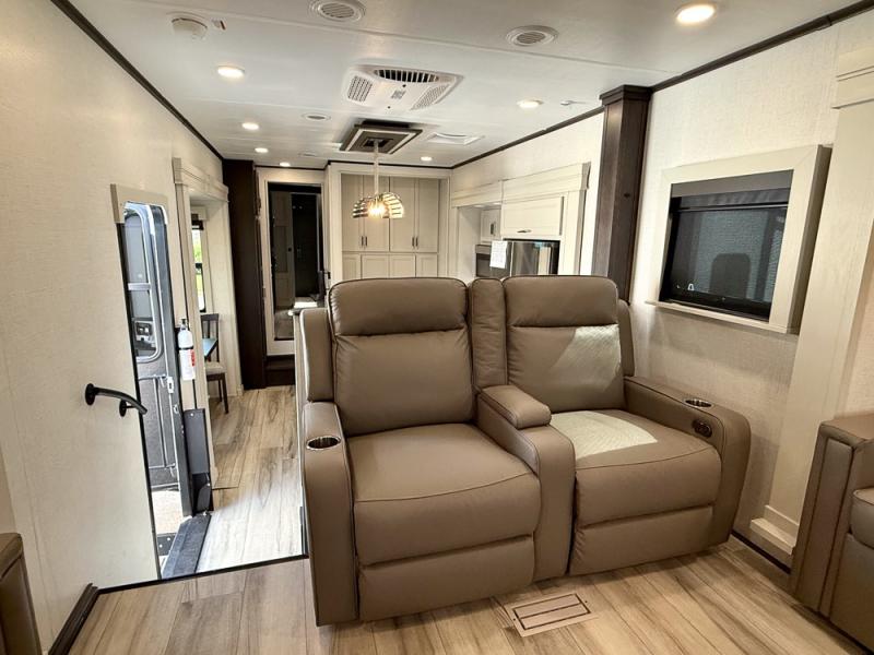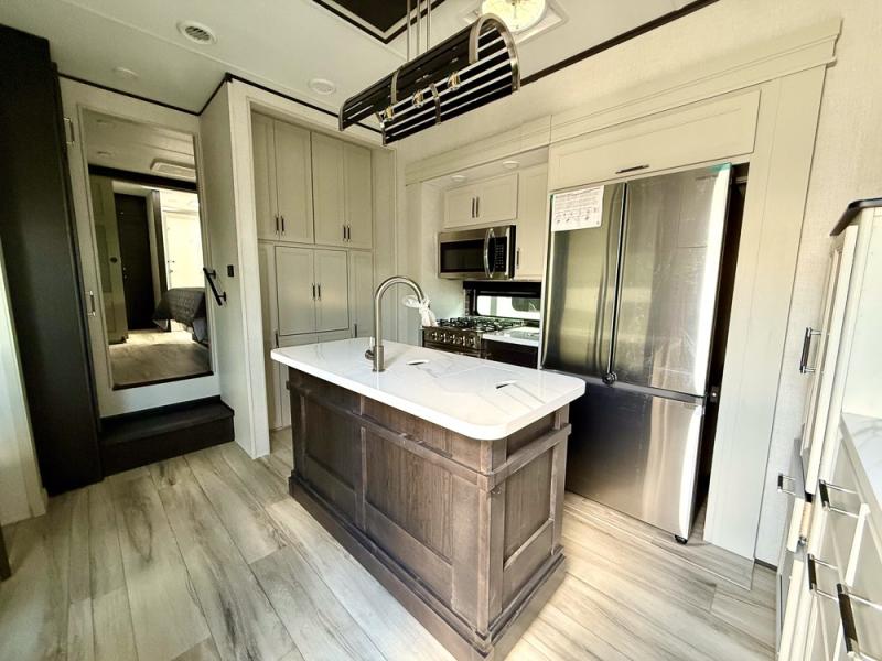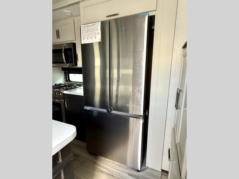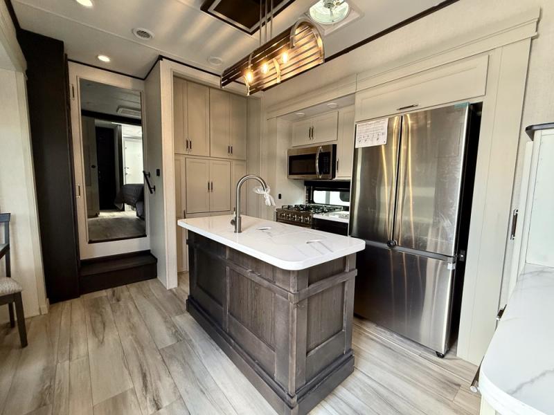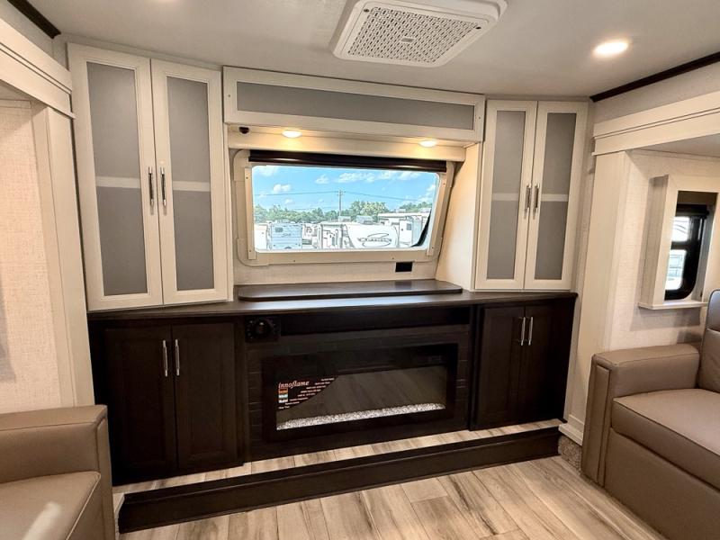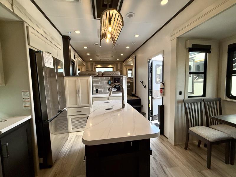 This fifth wheel is decked out in luxuries! The full rear bathroom has a walk-in shower to freshen up in each morning, a dual sink vanity for two to get ready at once, and an area prepped to add an optional washer and dryer. You will enjoy a good night's rest on the king bed slide inside the private bedroom and others can sleep on the opposing tri-fold sofa sleeper slides once they are converted. There are two kitchen pantries to hold everyone's favorite snacks, one of which is a walk-in pantry. The 18 cu. ft. residential refrigerator will keep your perishables fresh and you also have the option to switch it out for a 20 cu. ft. 12V refrigerator instead. The front living area has a front entertainment center with a 40" fireplace and a 50" TV, plus there is Thomas Payne theater seating with massage, heat, LED lights, and a USB charging station to keep your electronics charged while you relax!