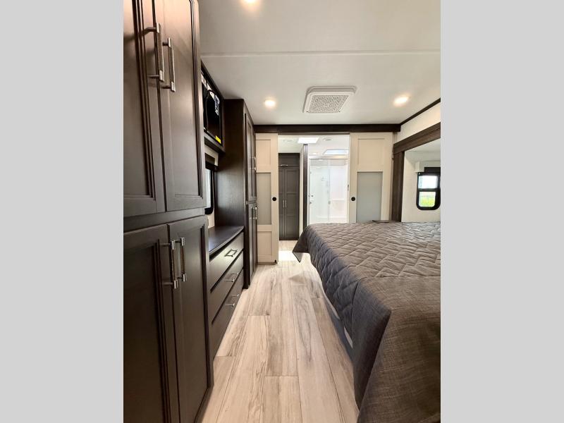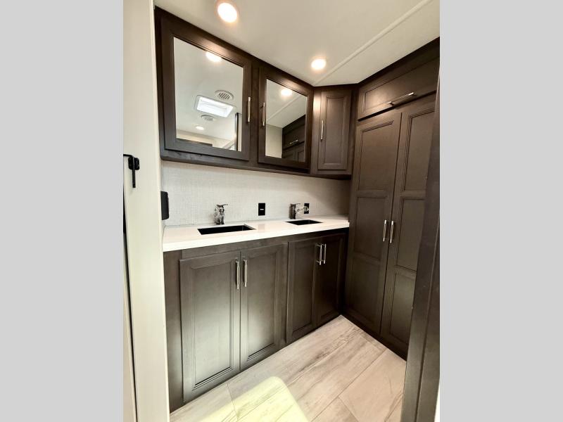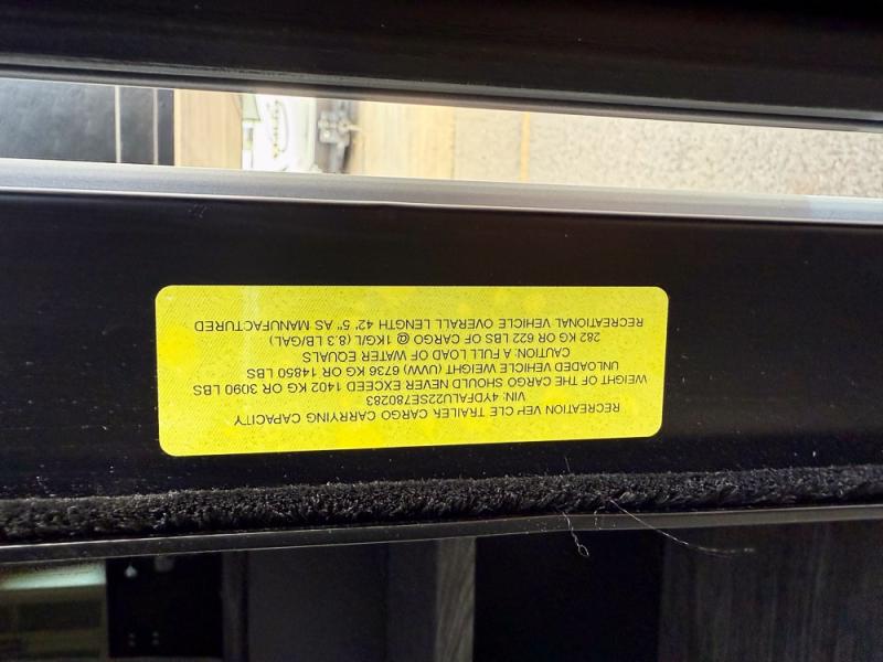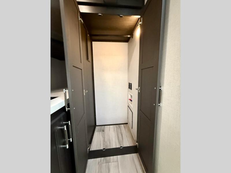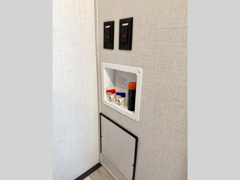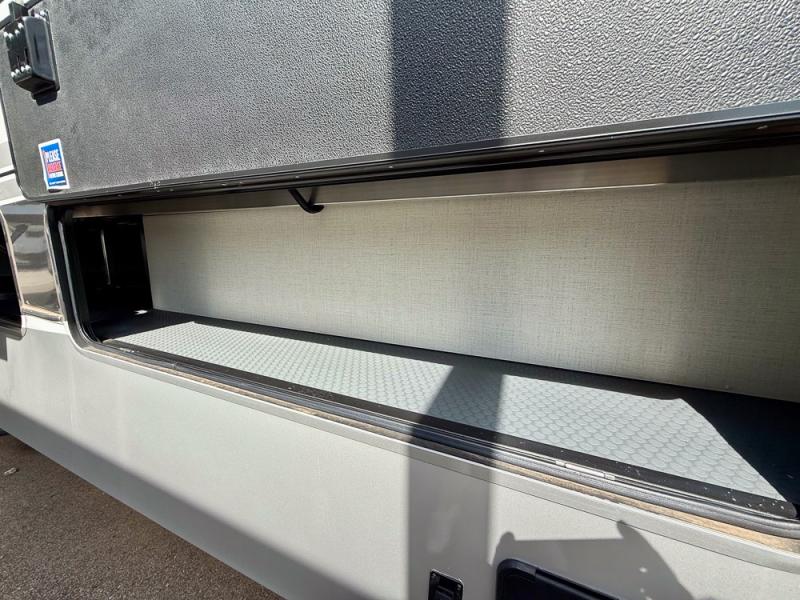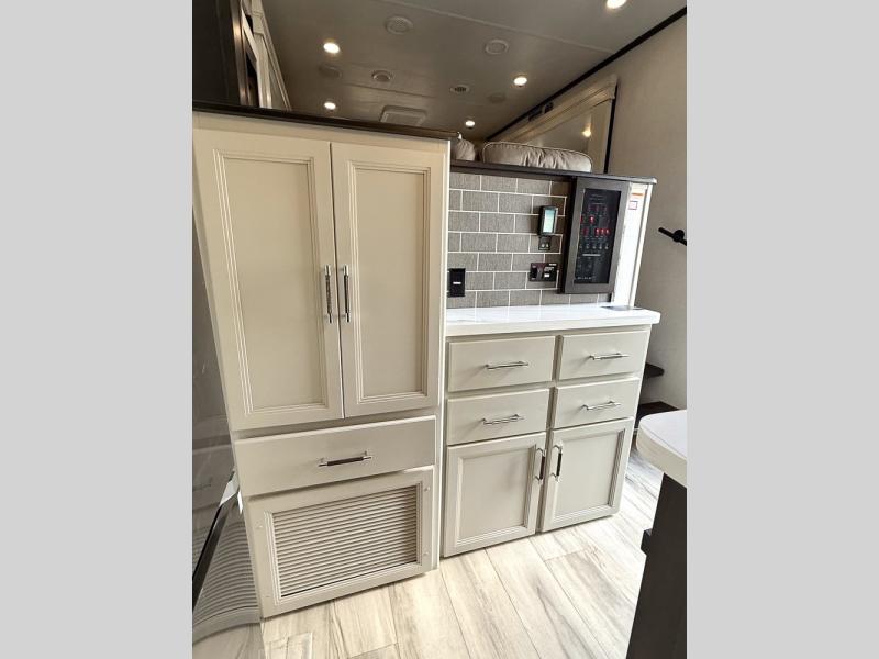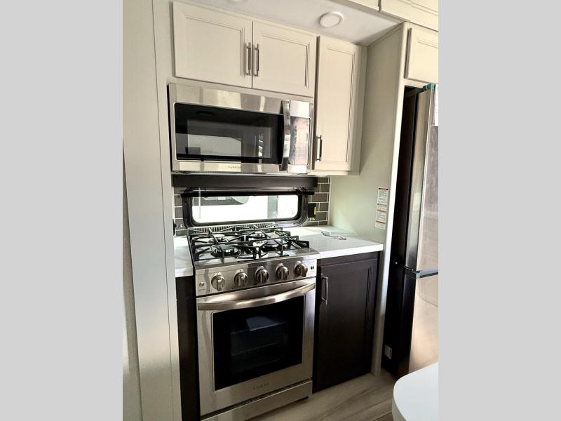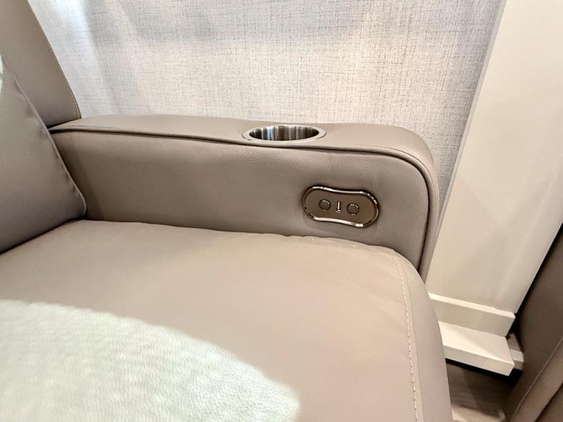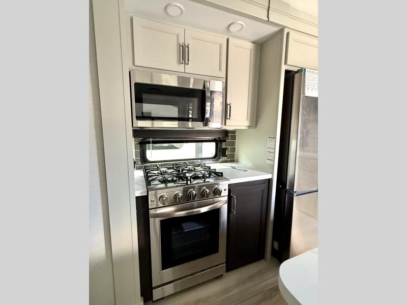 This fifth wheel is decked out in luxuries! The full rear bathroom has a walk-in shower to freshen up in each morning, a dual sink vanity for two to get ready at once, and an area prepped to add an optional washer and dryer. You will enjoy a good night's rest on the king bed slide inside the private bedroom and others can sleep on the opposing tri-fold sofa sleeper slides once they are converted. There are two kitchen pantries to hold everyone's favorite snacks, one of which is a walk-in pantry. The 18 cu. ft. residential refrigerator will keep your perishables fresh and you also have the option to switch it out for a 20 cu. ft. 12V refrigerator instead. The front living area has a front entertainment center with a 40" fireplace and a 50" TV, plus there is Thomas Payne theater seating with massage, heat, LED lights, and a USB charging station to keep your electronics charged while you relax!