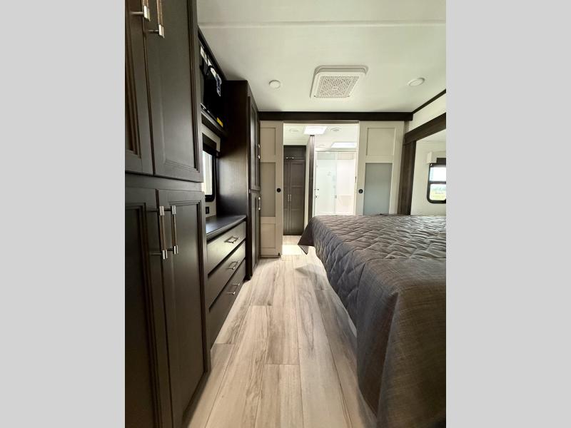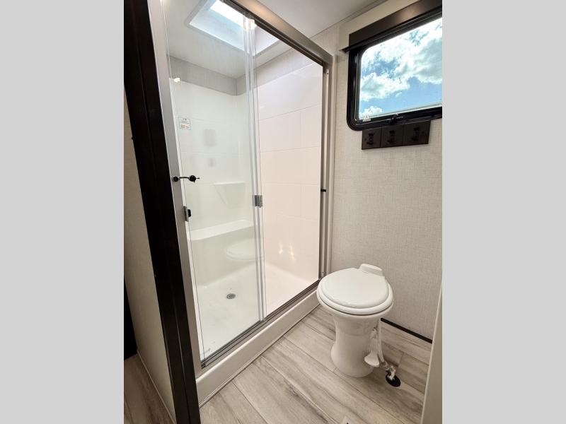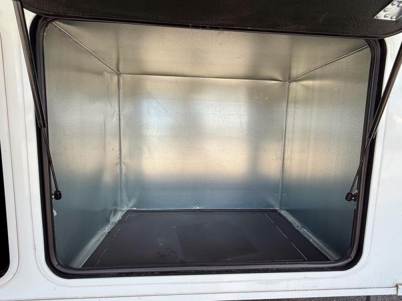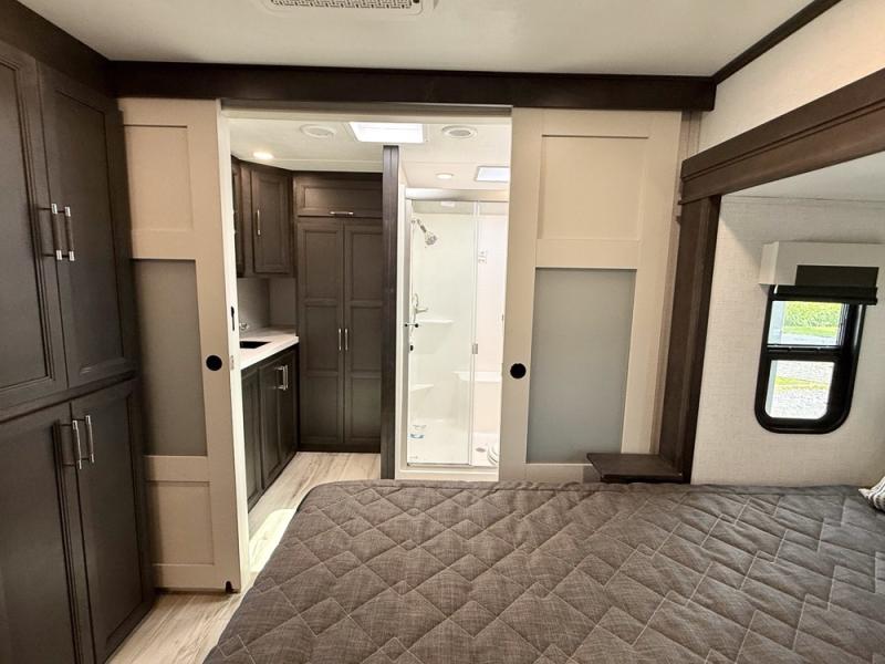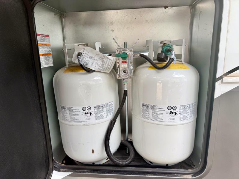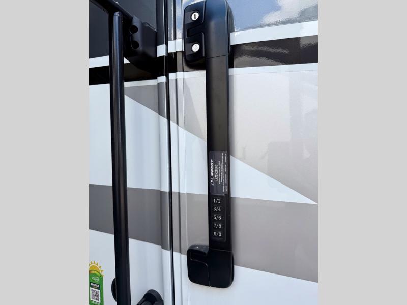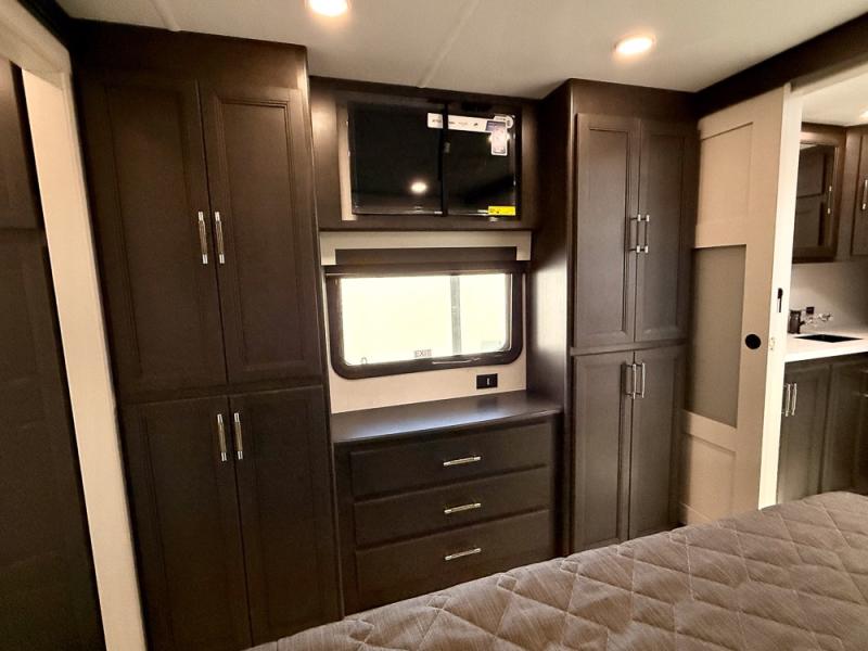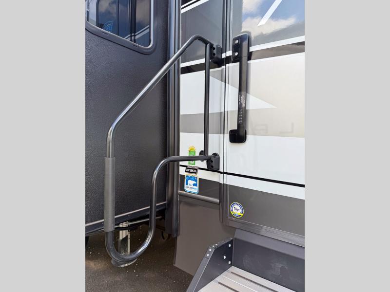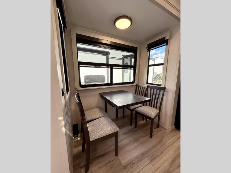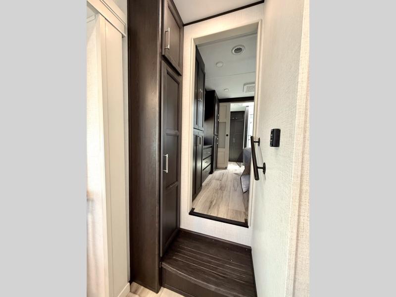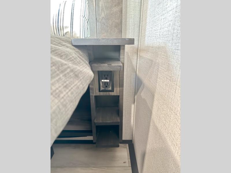 This fifth wheel is decked out in luxuries! The full rear bathroom has a walk-in shower to freshen up in each morning, a dual sink vanity for two to get ready at once, and an area prepped to add an optional washer and dryer. You will enjoy a good night's rest on the king bed slide inside the private bedroom and others can sleep on the opposing tri-fold sofa sleeper slides once they are converted. There are two kitchen pantries to hold everyone's favorite snacks, one of which is a walk-in pantry. The 18 cu. ft. residential refrigerator will keep your perishables fresh and you also have the option to switch it out for a 20 cu. ft. 12V refrigerator instead. The front living area has a front entertainment center with a 40" fireplace and a 50" TV, plus there is Thomas Payne theater seating with massage, heat, LED lights, and a USB charging station to keep your electronics charged while you relax!