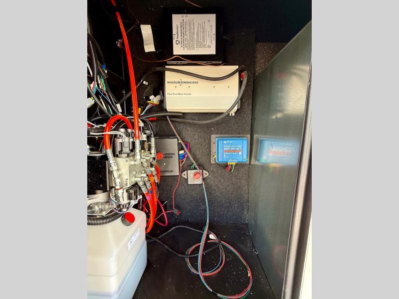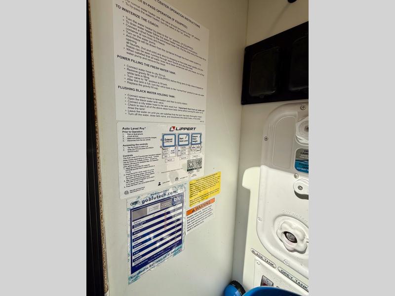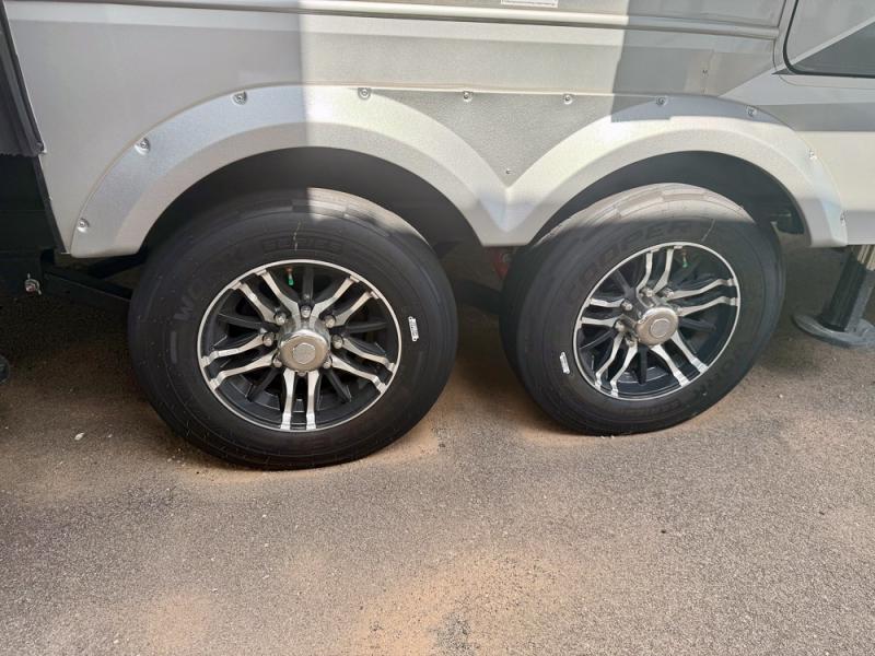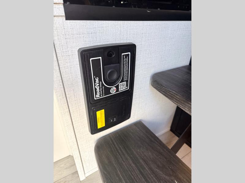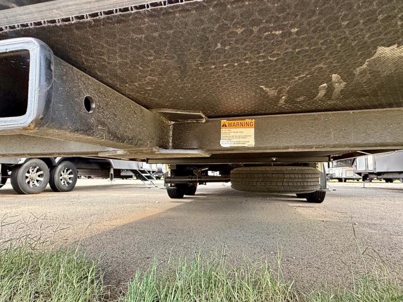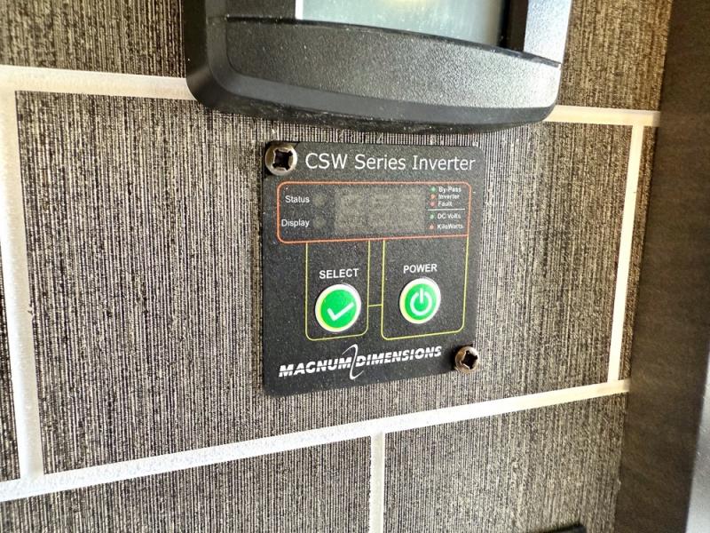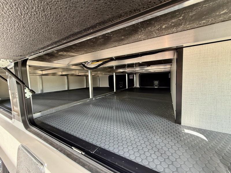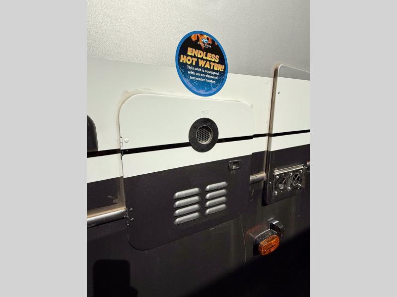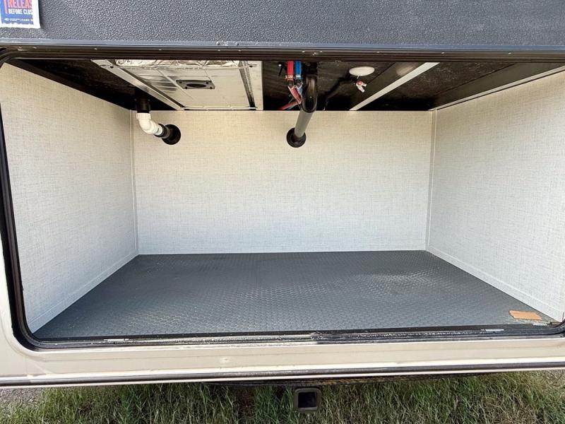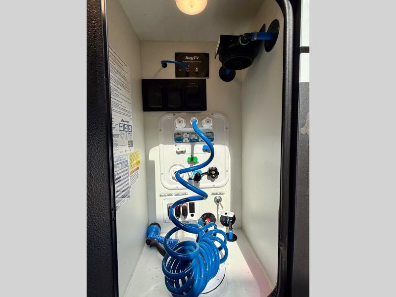 This fifth wheel is decked out in luxuries! The full rear bathroom has a walk-in shower to freshen up in each morning, a dual sink vanity for two to get ready at once, and an area prepped to add an optional washer and dryer. You will enjoy a good night's rest on the king bed slide inside the private bedroom and others can sleep on the opposing tri-fold sofa sleeper slides once they are converted. There are two kitchen pantries to hold everyone's favorite snacks, one of which is a walk-in pantry. The 18 cu. ft. residential refrigerator will keep your perishables fresh and you also have the option to switch it out for a 20 cu. ft. 12V refrigerator instead. The front living area has a front entertainment center with a 40" fireplace and a 50" TV, plus there is Thomas Payne theater seating with massage, heat, LED lights, and a USB charging station to keep your electronics charged while you relax!