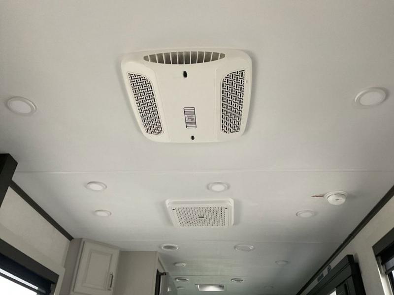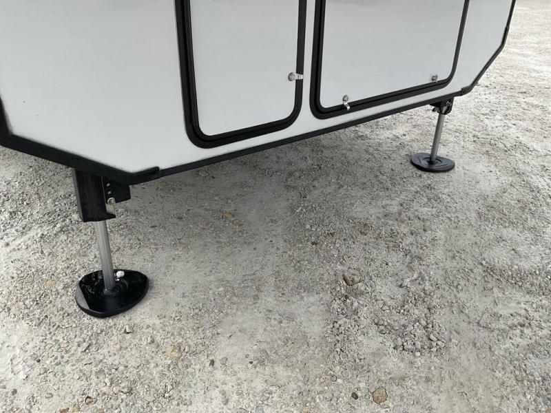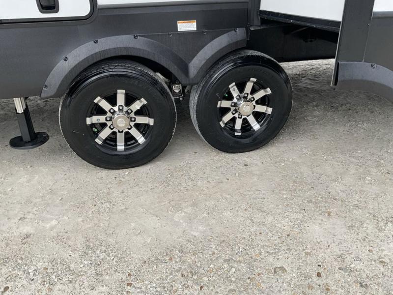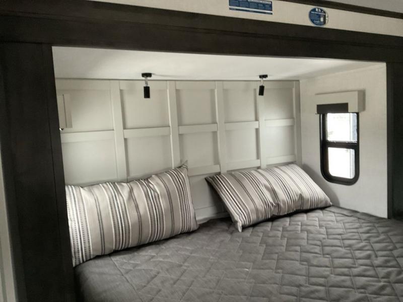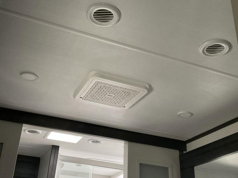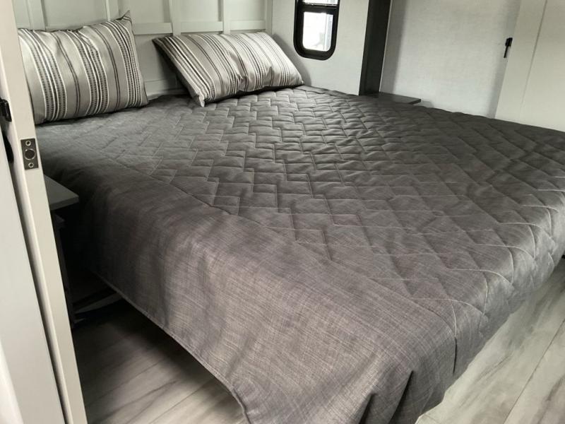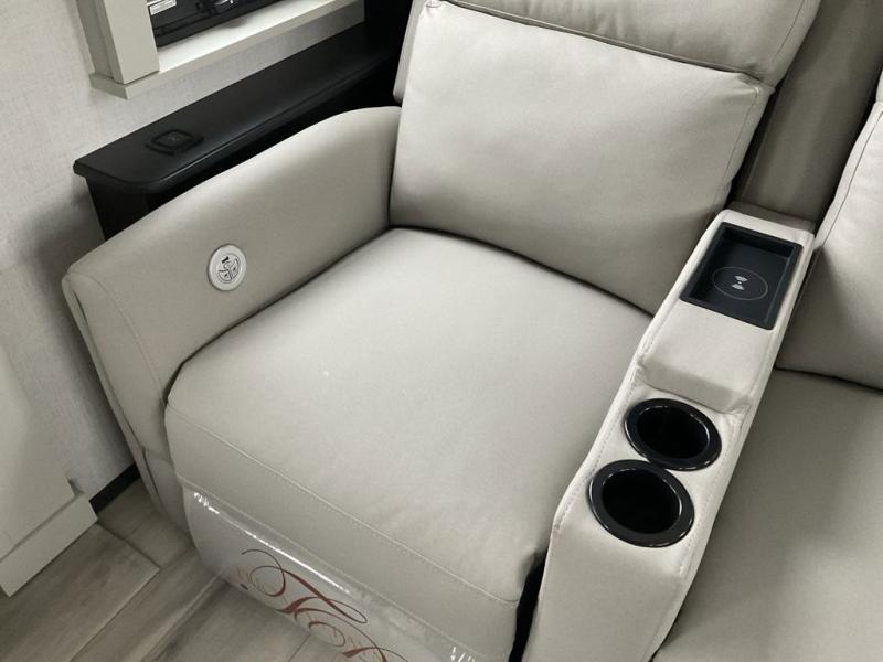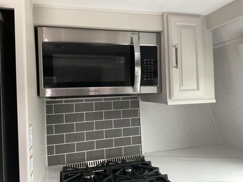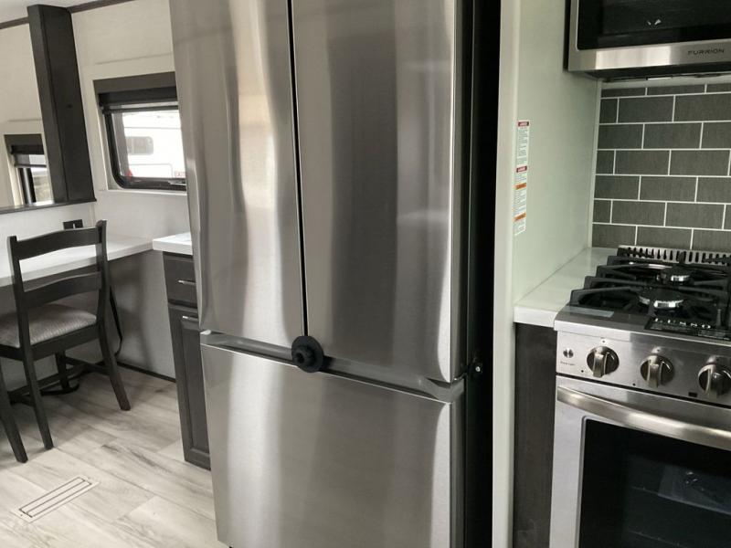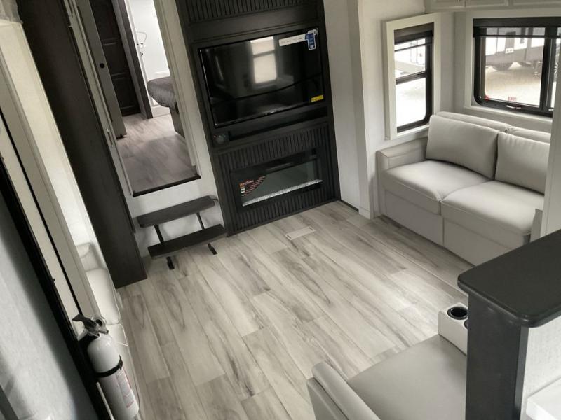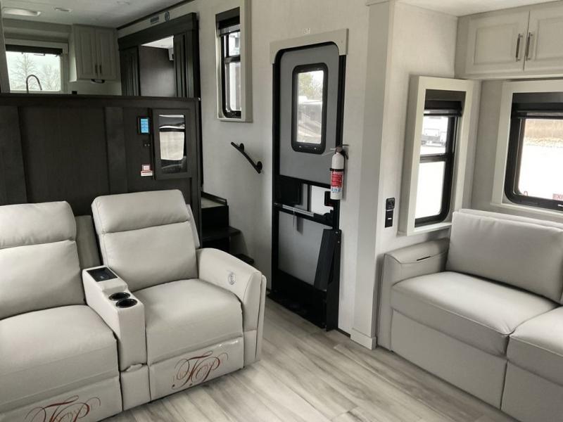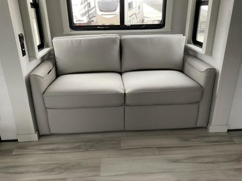 This fifth wheel is decked out in luxuries! The full rear bathroom has a walk-in shower to freshen up in each morning, a dual sink vanity for two to get ready at once, plus washer and dryer prep. You will enjoy a good night's rest on the king bed slide inside the private bedroom and others can sleep on the opposing tri-fold sofa sleeper slides in the living room. There is also a theater seating here, along with a fireplace and 50" LED TV for movie nights. The front kitchen is where it's really at in this fifth wheel; ample counter space, a bar top with stools, pull-out drawers, plus a pantry and closet for even more storage!