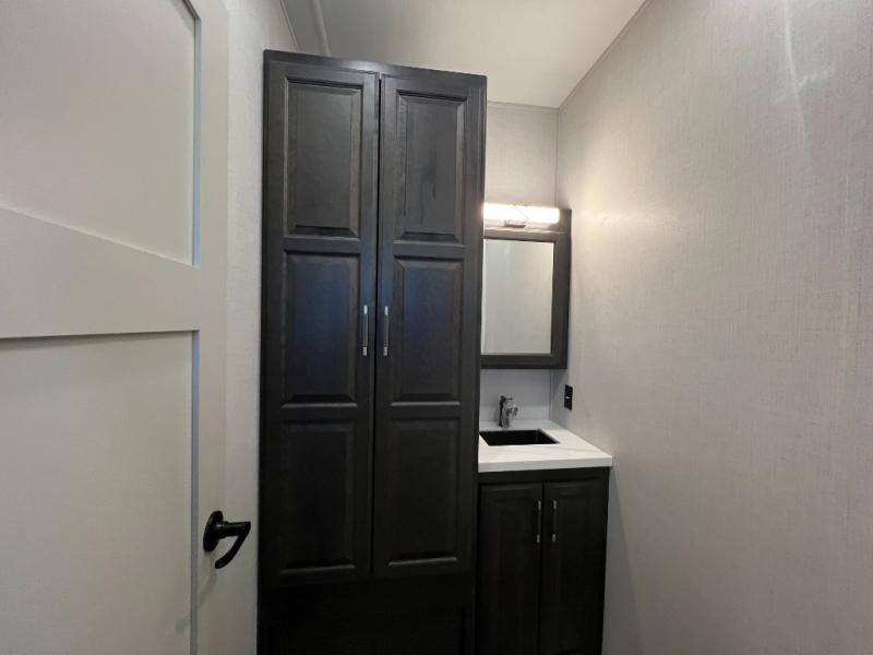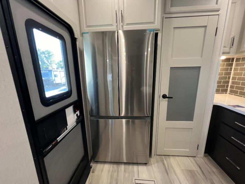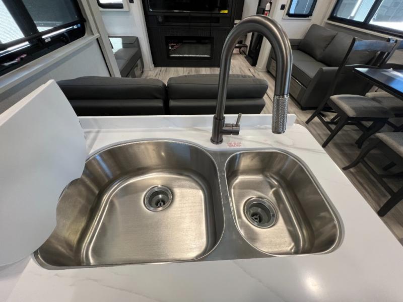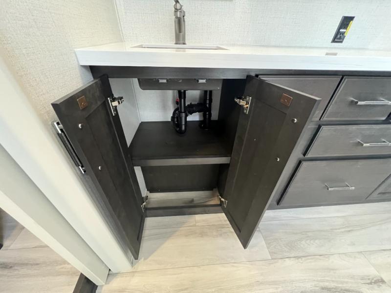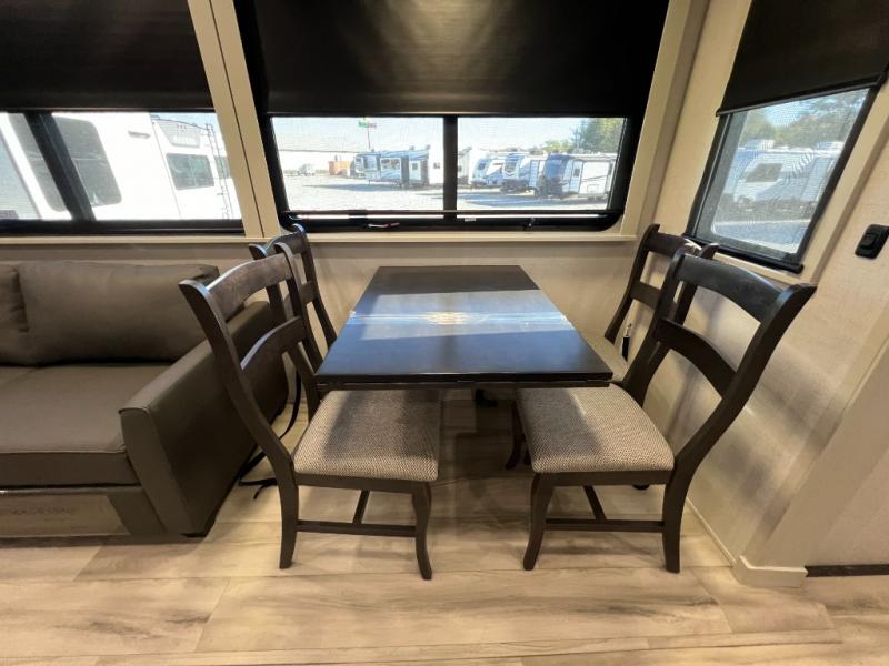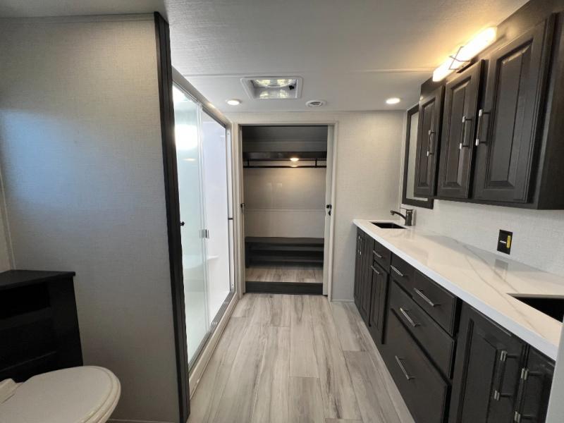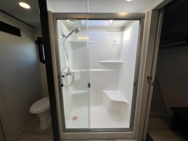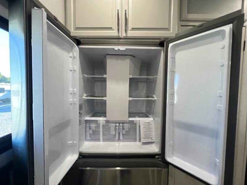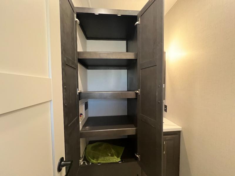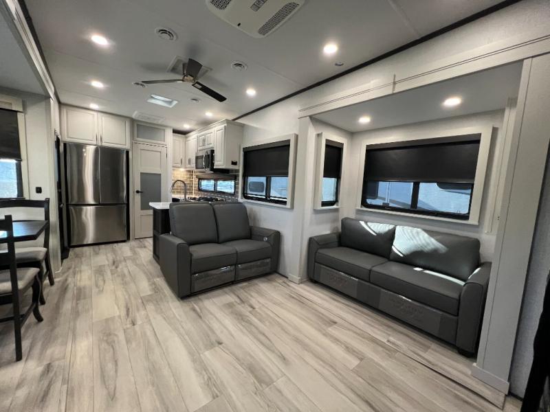 With a bath and a half, it's a clean decision to take this fifth wheel with you on your next camping trip! One of the dual entry doors leads directly into the rear kitchen which has a large pantry and an 18 cu. ft. residential refrigerator to store your food items. The free standing dinette and tri-fold sofa sleeper slide and opposing tri-fold sofa sleeper slide opens up the middle living area for more interior space. The half bathroom is conveniently located straight in through the main entry and features washer and dryer prep for clean clothes throughout your entire trip. The master suite not only has a king bed slide with storage underneath and a bench next to a dresser, but also access into the front full bathroom which has a dual sink vanity, a shower with a seat, and a toilet with privacy walls!