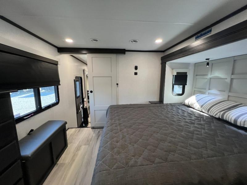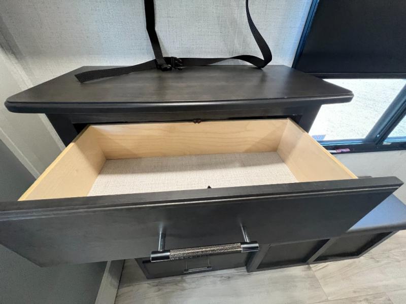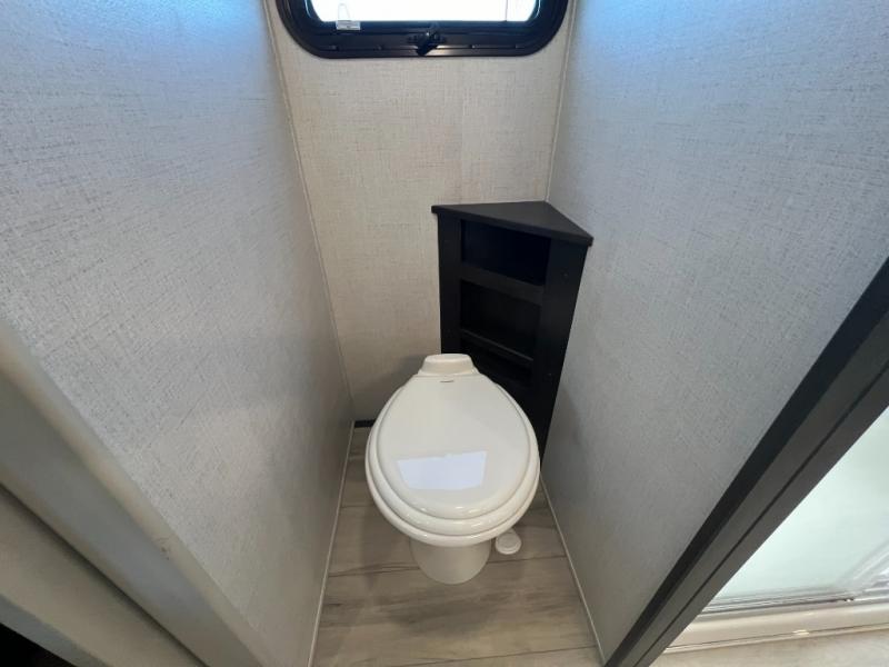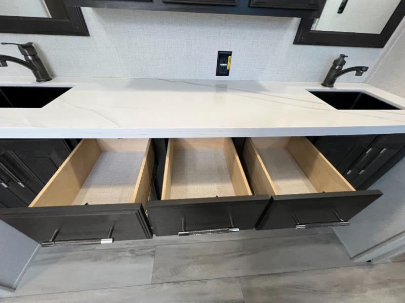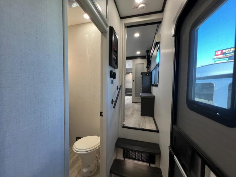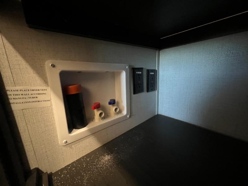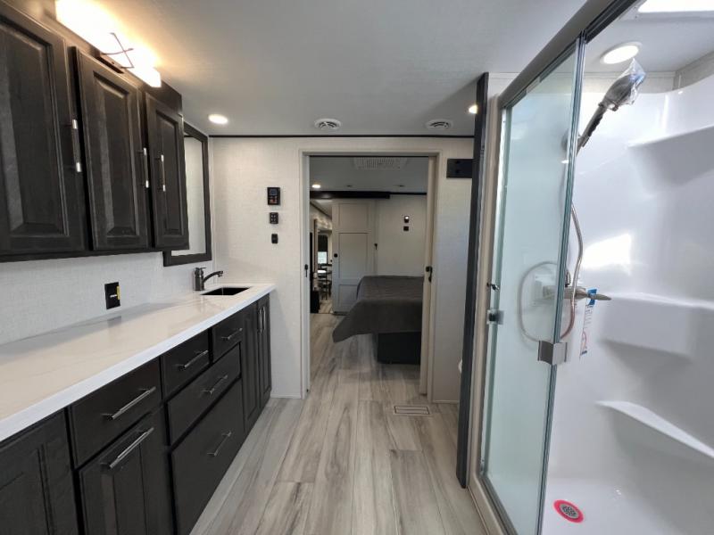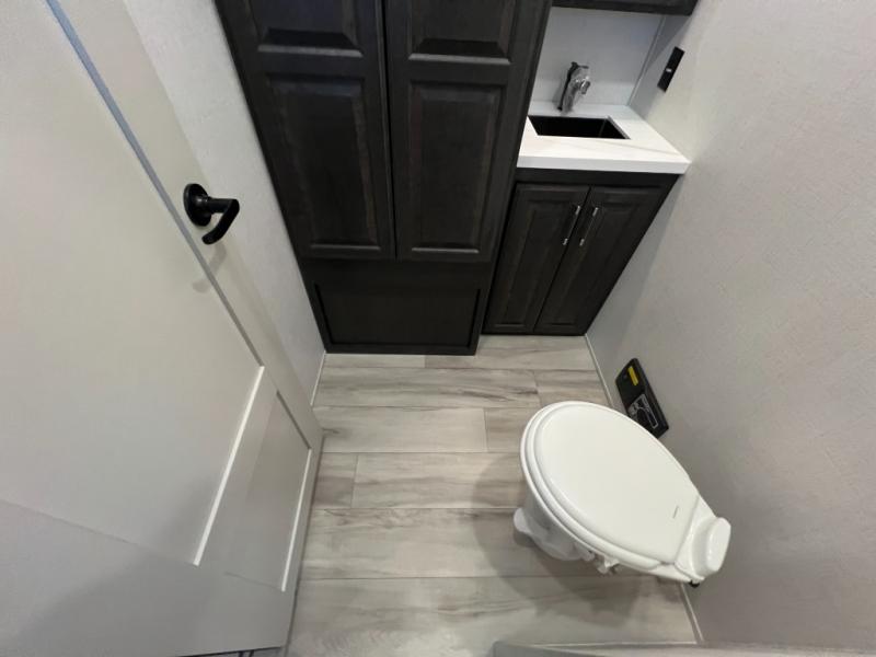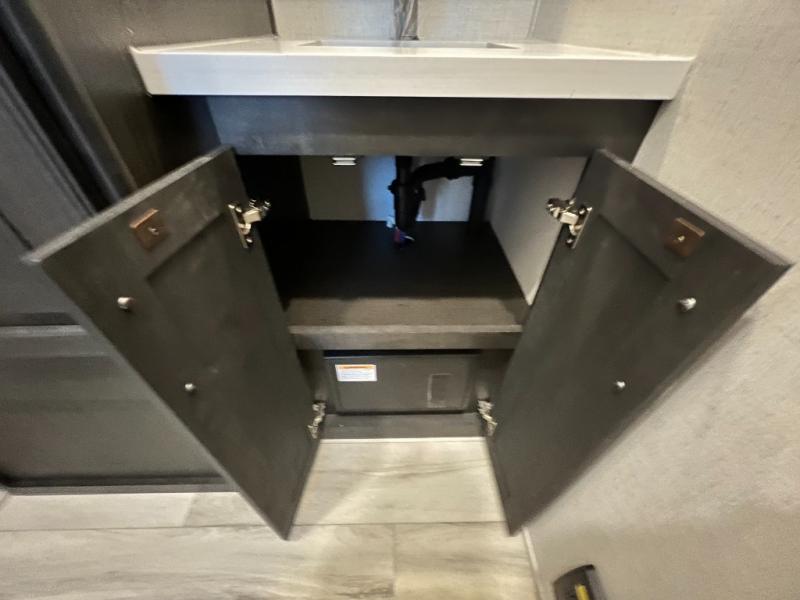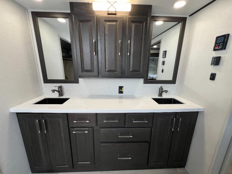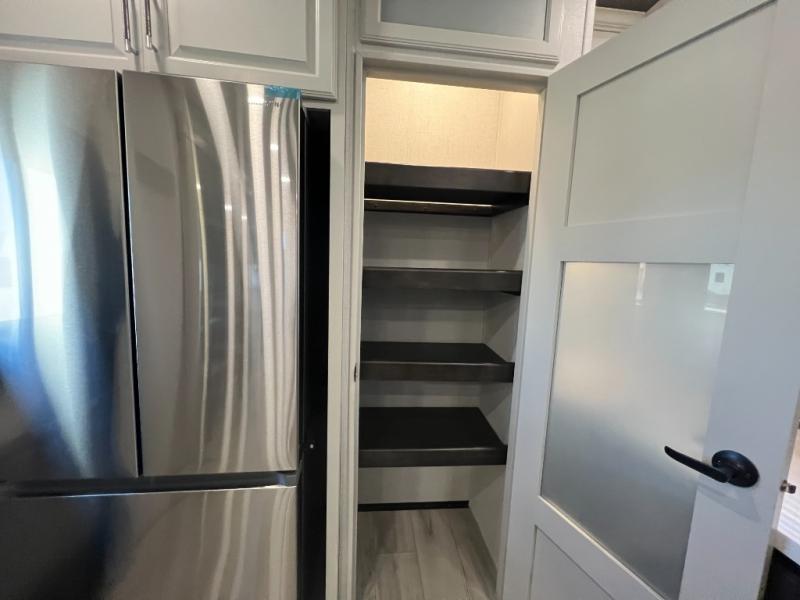 With a bath and a half, it's a clean decision to take this fifth wheel with you on your next camping trip! One of the dual entry doors leads directly into the rear kitchen which has a large pantry and an 18 cu. ft. residential refrigerator to store your food items. The free standing dinette and tri-fold sofa sleeper slide and opposing tri-fold sofa sleeper slide opens up the middle living area for more interior space. The half bathroom is conveniently located straight in through the main entry and features washer and dryer prep for clean clothes throughout your entire trip. The master suite not only has a king bed slide with storage underneath and a bench next to a dresser, but also access into the front full bathroom which has a dual sink vanity, a shower with a seat, and a toilet with privacy walls!