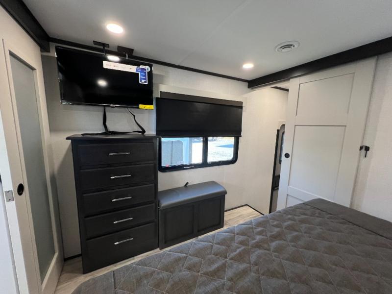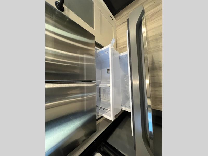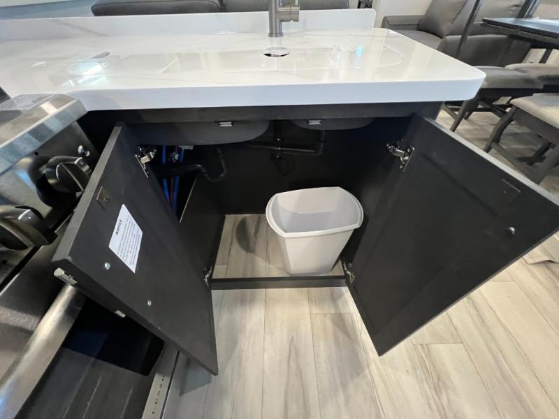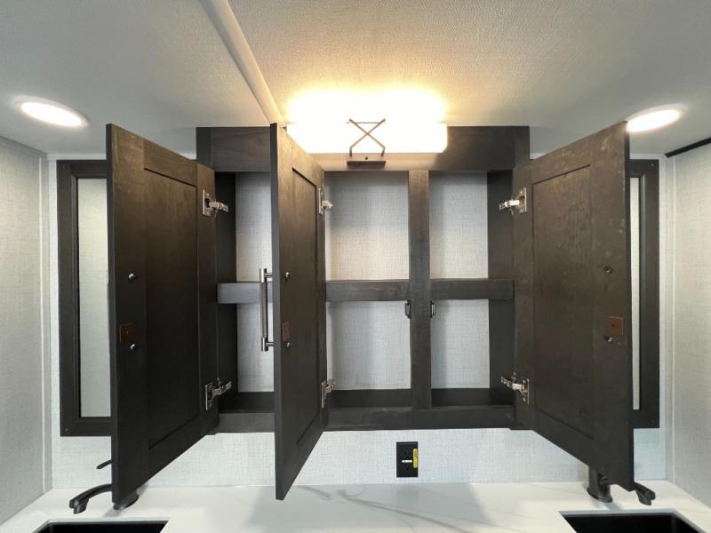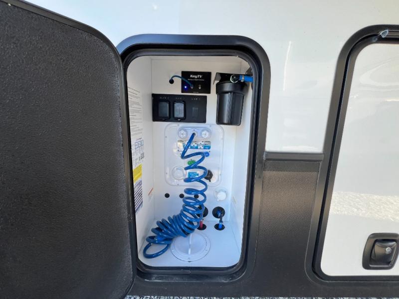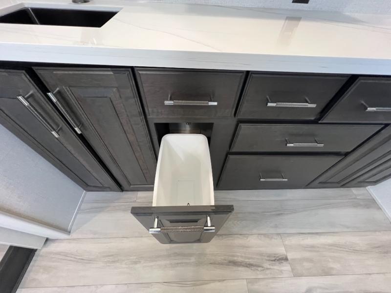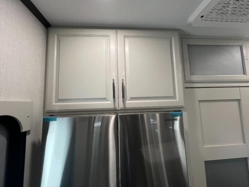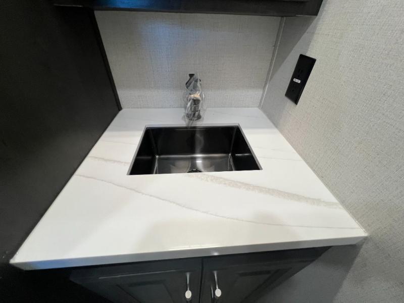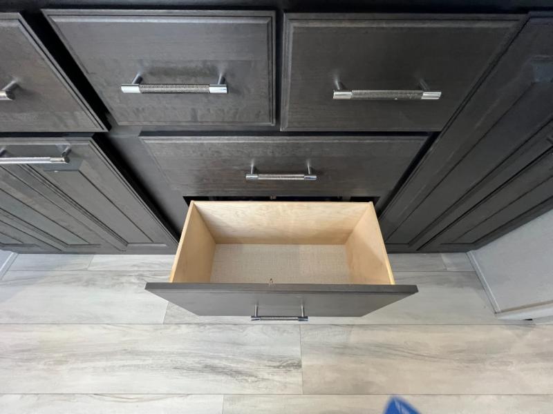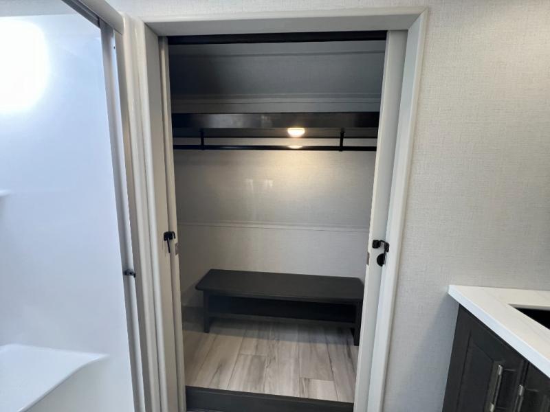 With a bath and a half, it's a clean decision to take this fifth wheel with you on your next camping trip! One of the dual entry doors leads directly into the rear kitchen which has a large pantry and an 18 cu. ft. residential refrigerator to store your food items. The free standing dinette and tri-fold sofa sleeper slide and opposing tri-fold sofa sleeper slide opens up the middle living area for more interior space. The half bathroom is conveniently located straight in through the main entry and features washer and dryer prep for clean clothes throughout your entire trip. The master suite not only has a king bed slide with storage underneath and a bench next to a dresser, but also access into the front full bathroom which has a dual sink vanity, a shower with a seat, and a toilet with privacy walls!