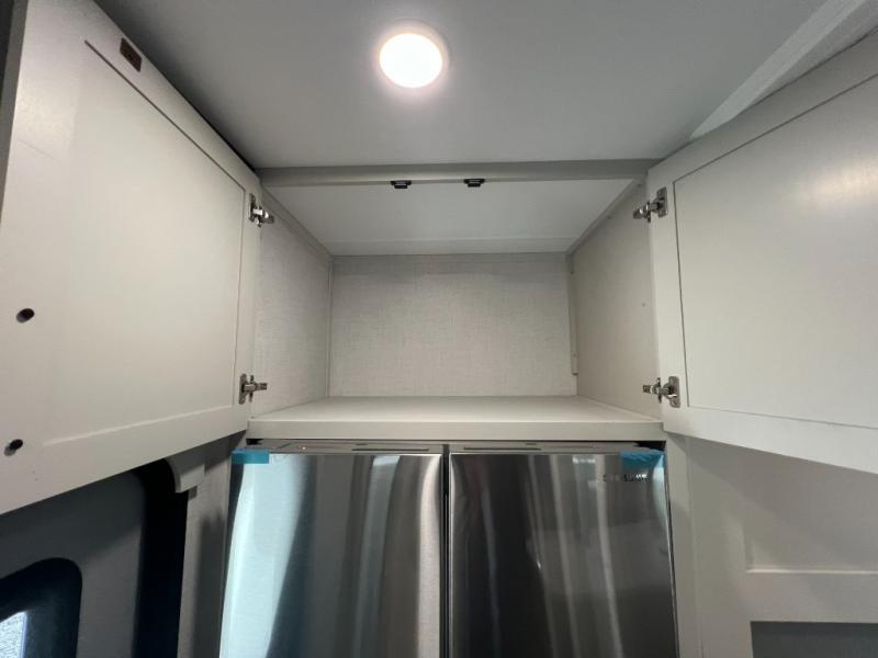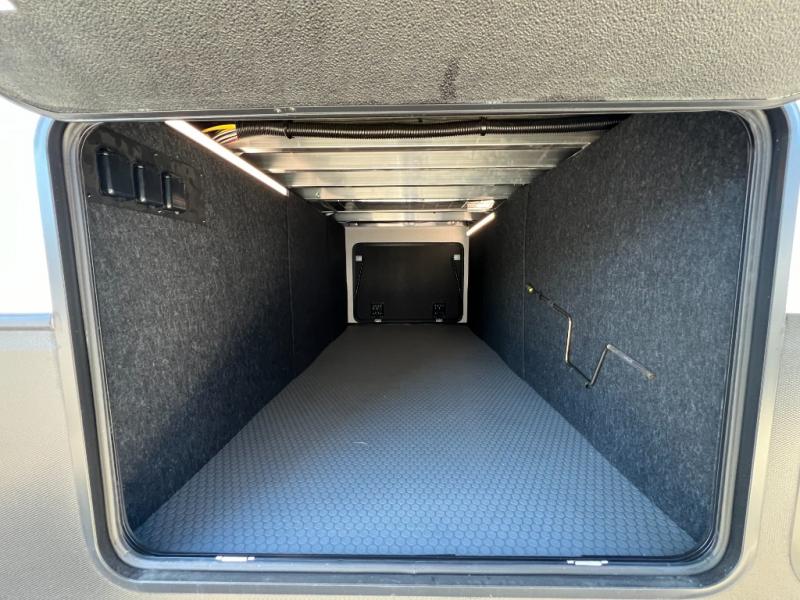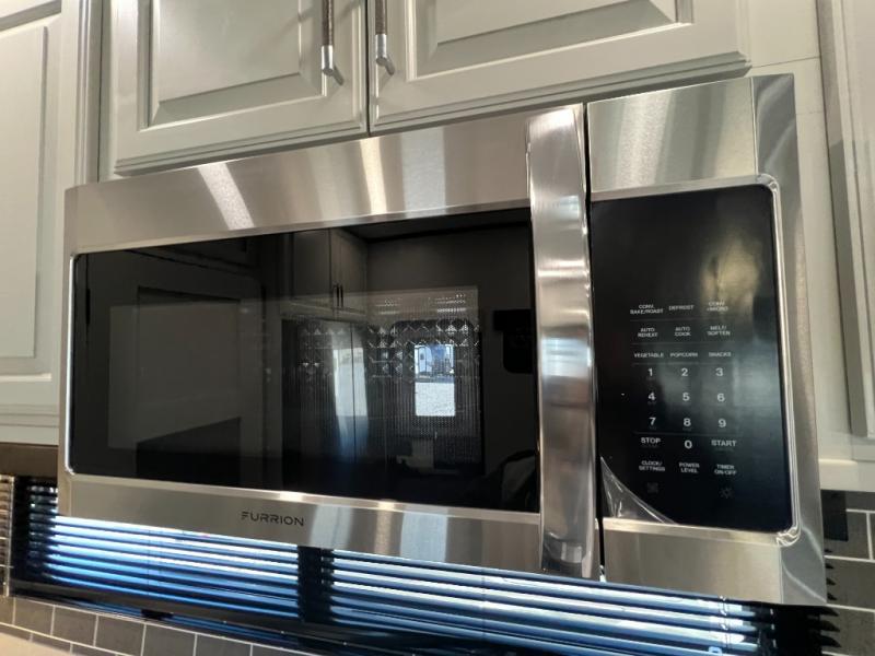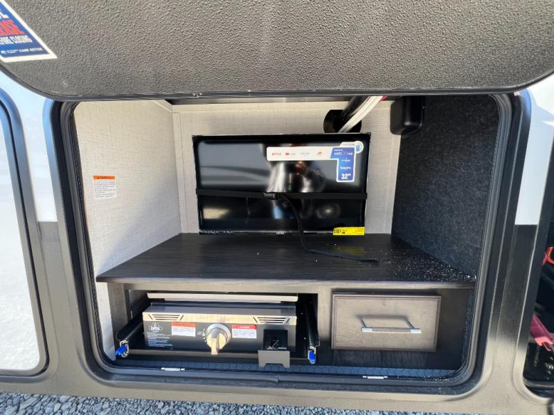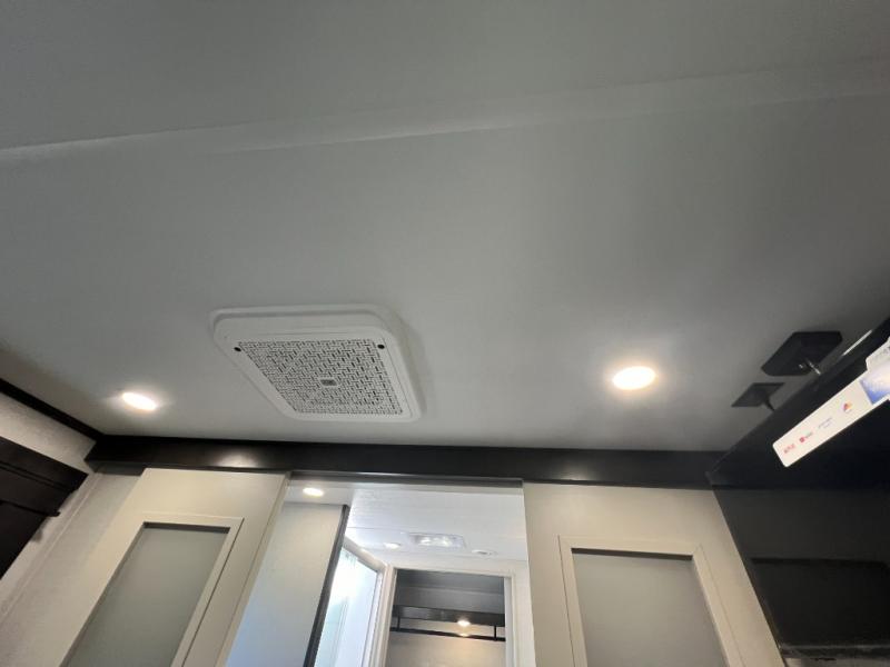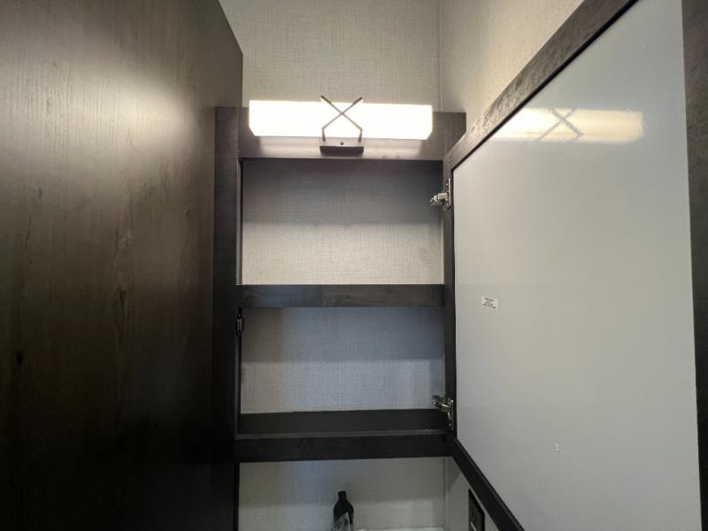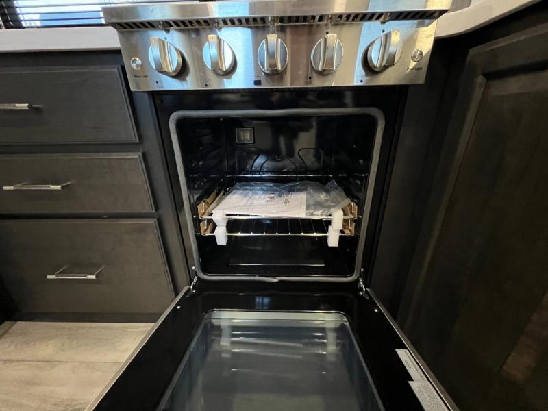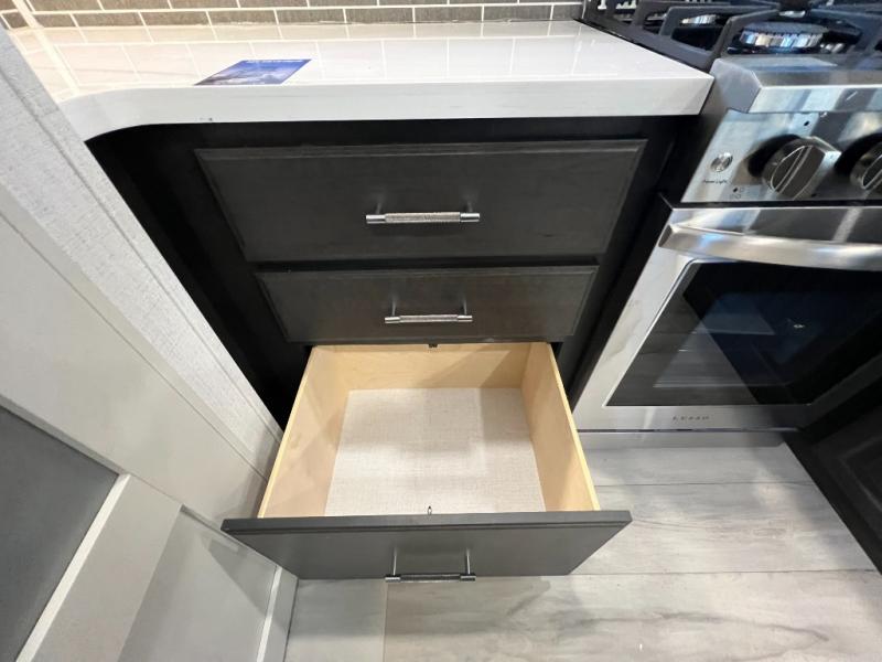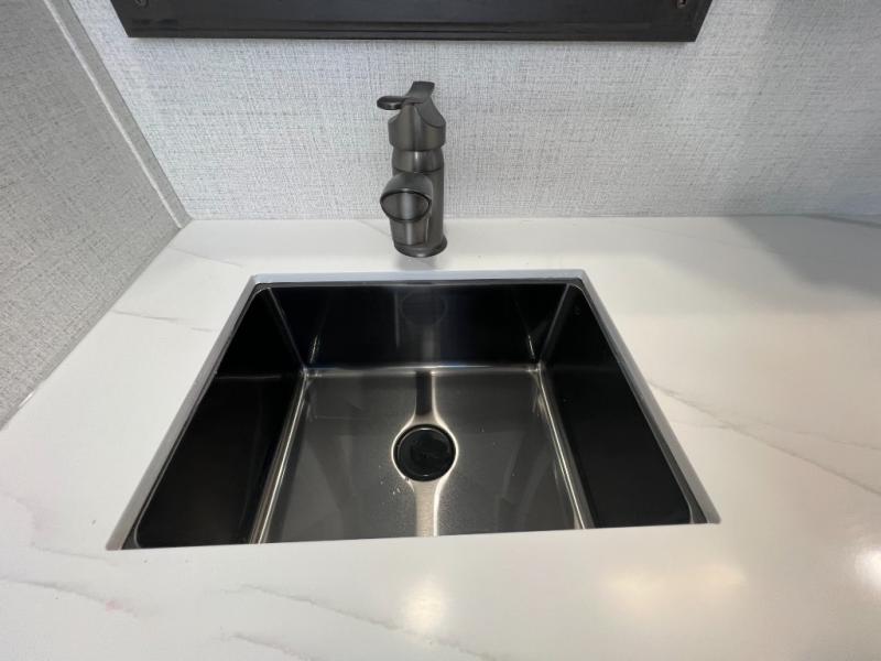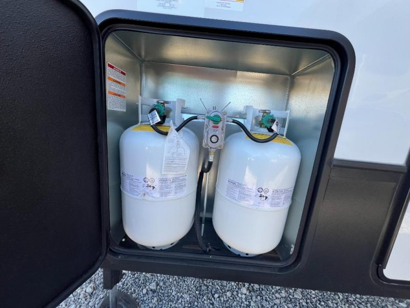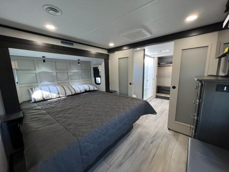 With a bath and a half, it's a clean decision to take this fifth wheel with you on your next camping trip! One of the dual entry doors leads directly into the rear kitchen which has a large pantry and an 18 cu. ft. residential refrigerator to store your food items. The free standing dinette and tri-fold sofa sleeper slide and opposing tri-fold sofa sleeper slide opens up the middle living area for more interior space. The half bathroom is conveniently located straight in through the main entry and features washer and dryer prep for clean clothes throughout your entire trip. The master suite not only has a king bed slide with storage underneath and a bench next to a dresser, but also access into the front full bathroom which has a dual sink vanity, a shower with a seat, and a toilet with privacy walls!