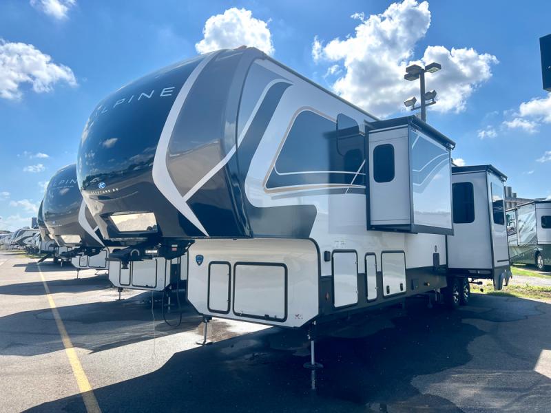 Luxury is not an option, it is a standard with each one of these Keystone RV Alpine fifth wheels! A 8' 4" wide body construction will create an open, residential feeling, and cutting-edge technology will provide a hassle-free camping experience. The Tru-Fit slide construction is more durable and minimizes motor structural stress, as well as resists leaking, and the Blade Pure airflow system provides residential comfort with its high-performance. Each fifth wheel includes designer flooring throughout, stunning solid wood cabinet doors, luxurious crown molding, and solid surface countertops in the kitchen. The exterior also includes an outside shower with hot and cold water, Lippert strut assisted SolidSteps, Hitch Vision with LED lighting, and many more conveniences!